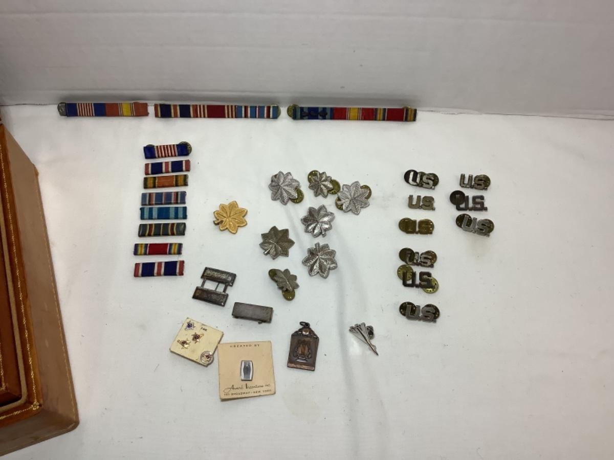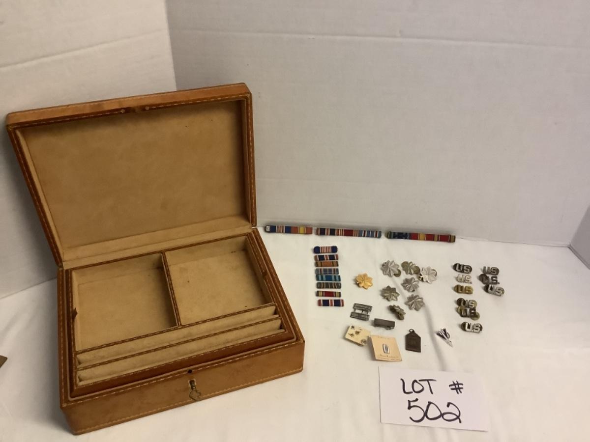 A - 502 Lot of WWII U.S. Army Air Force Pins/Ribbons & Leather Storage Box