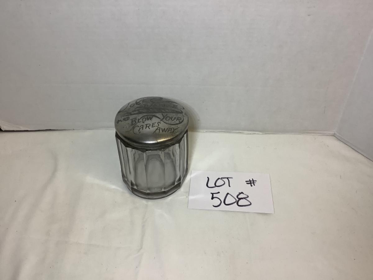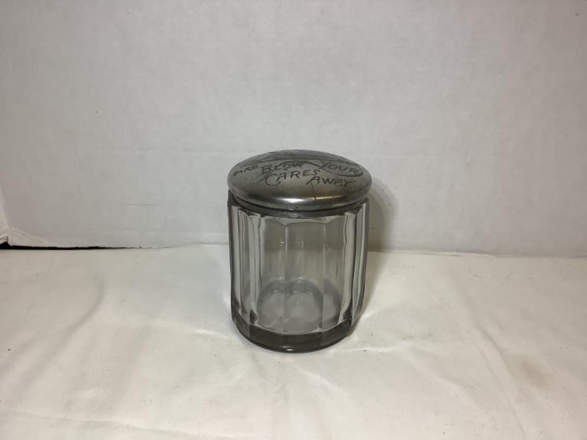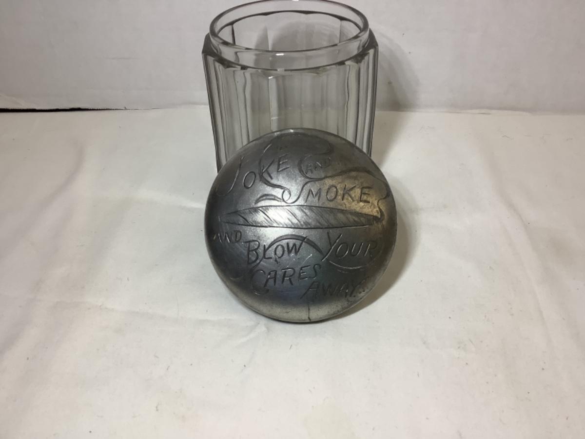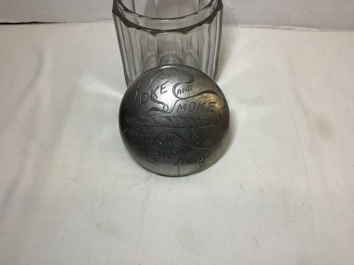 A - 508 Antique Glass Tobacco Cigar Jar with Sterling Silver Engraved Top