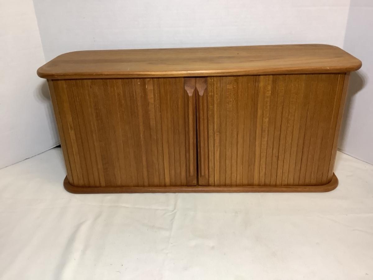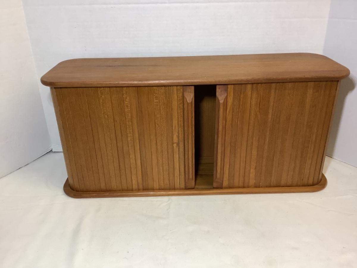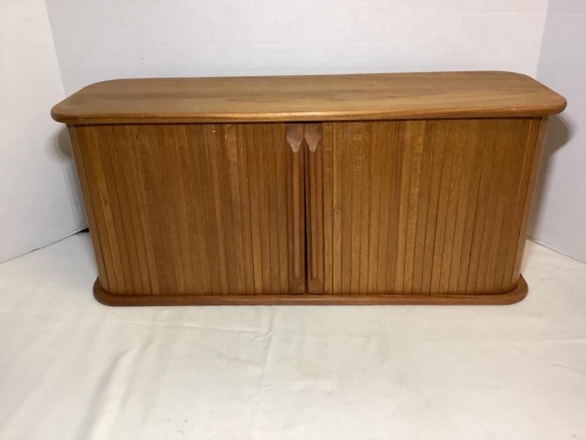 A - 509 Vintage Mid Century Teak Tambour Door Cabinet Wall Mount Desk Top