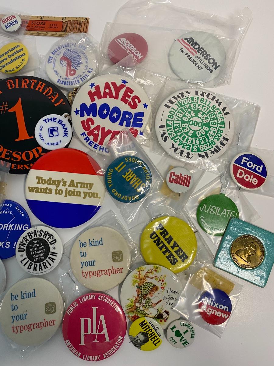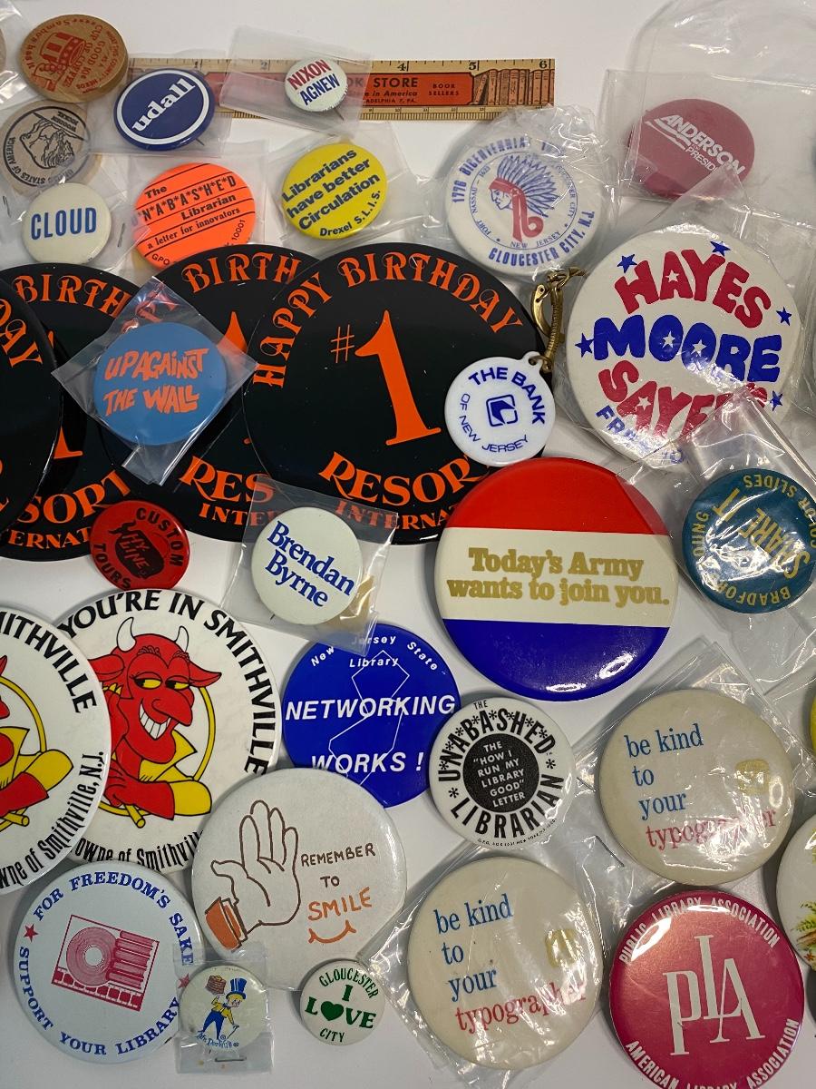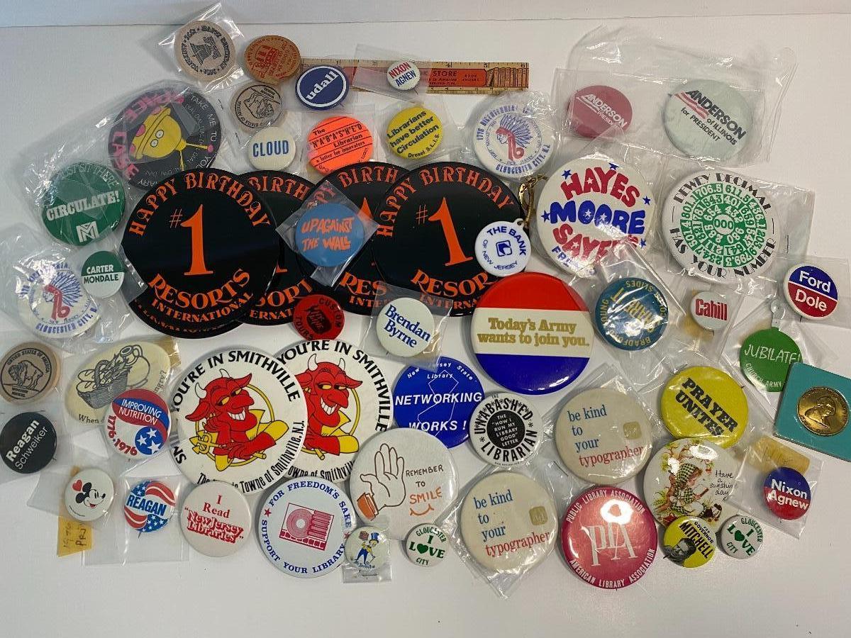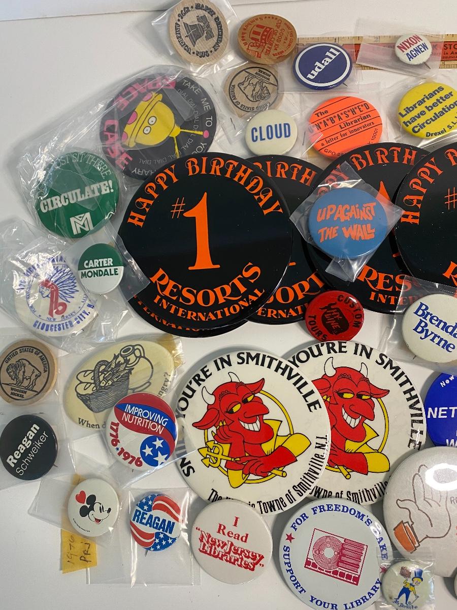 Vintage pins from local businesses, politicians and characters.