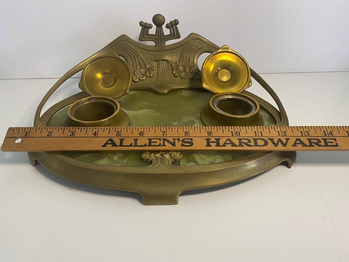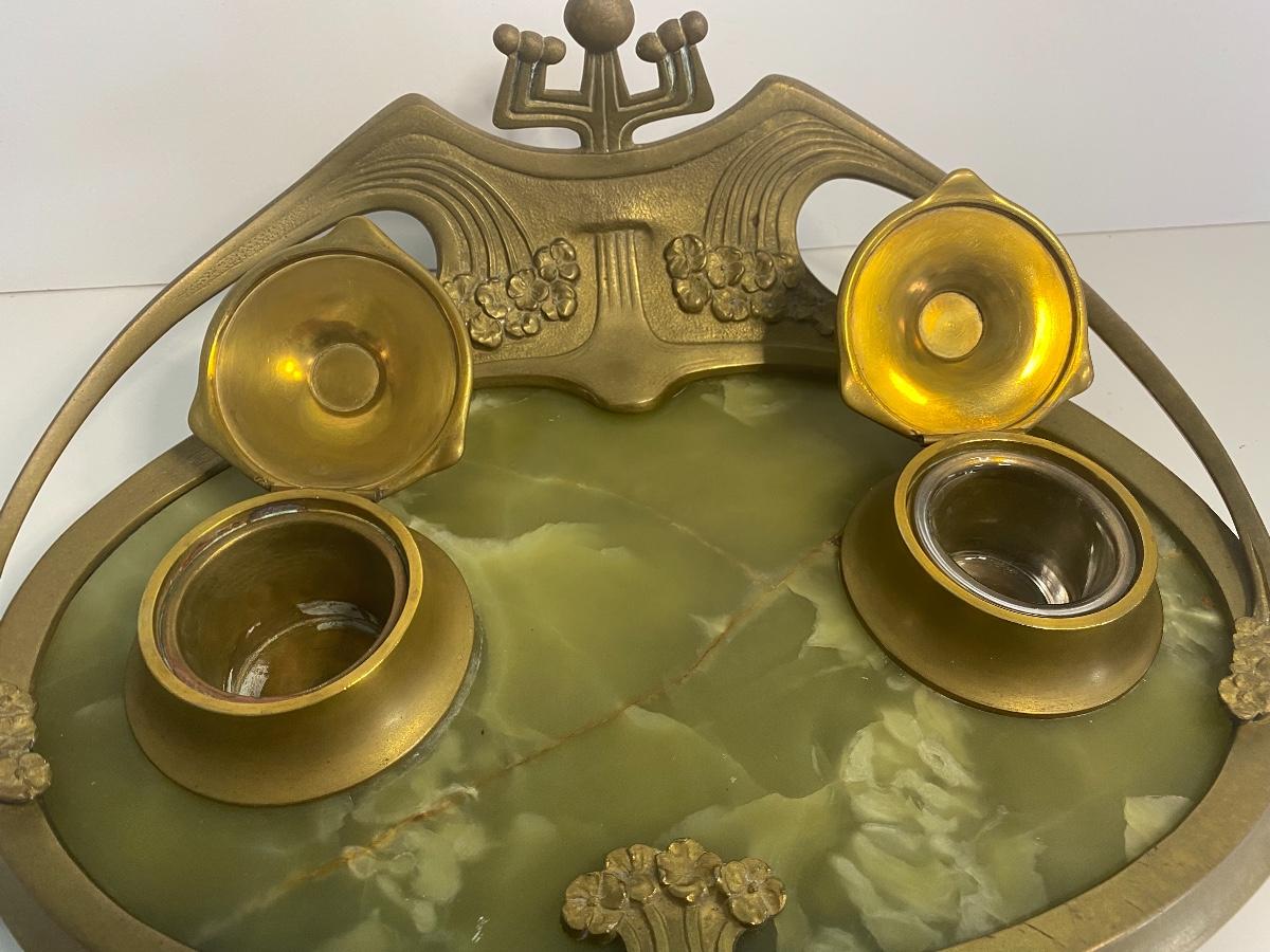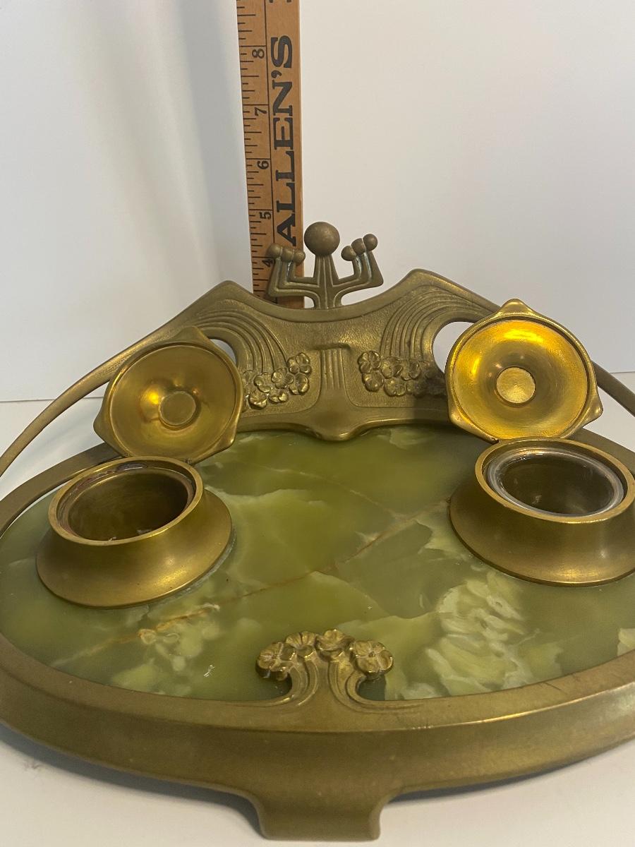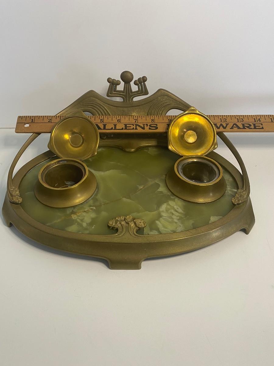 Gorgeous green marble antique inkwell. The inkwell base is green marble, it has a natural crack in it, but does not go all the way through. Also, one of the glass inserts is gone. These are very hard to find and in this size and condition!