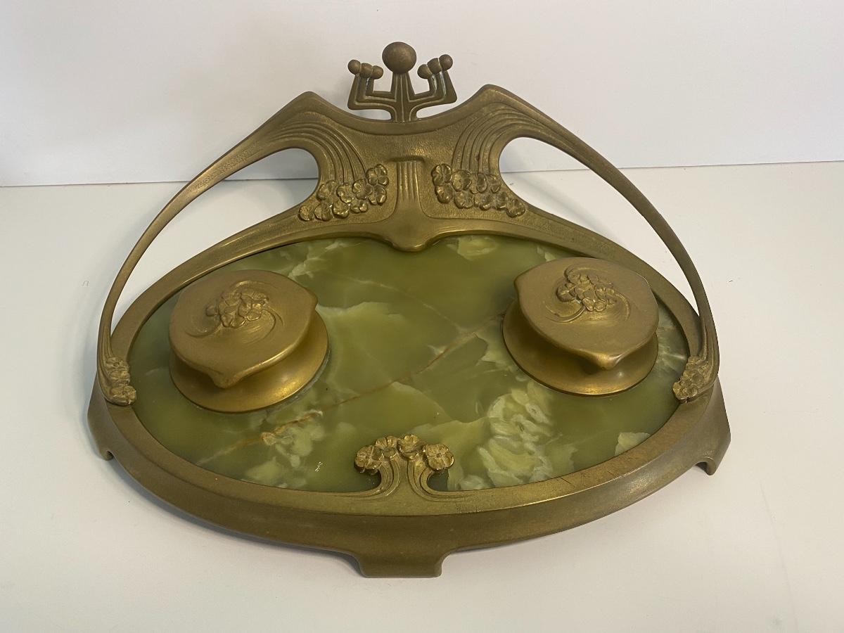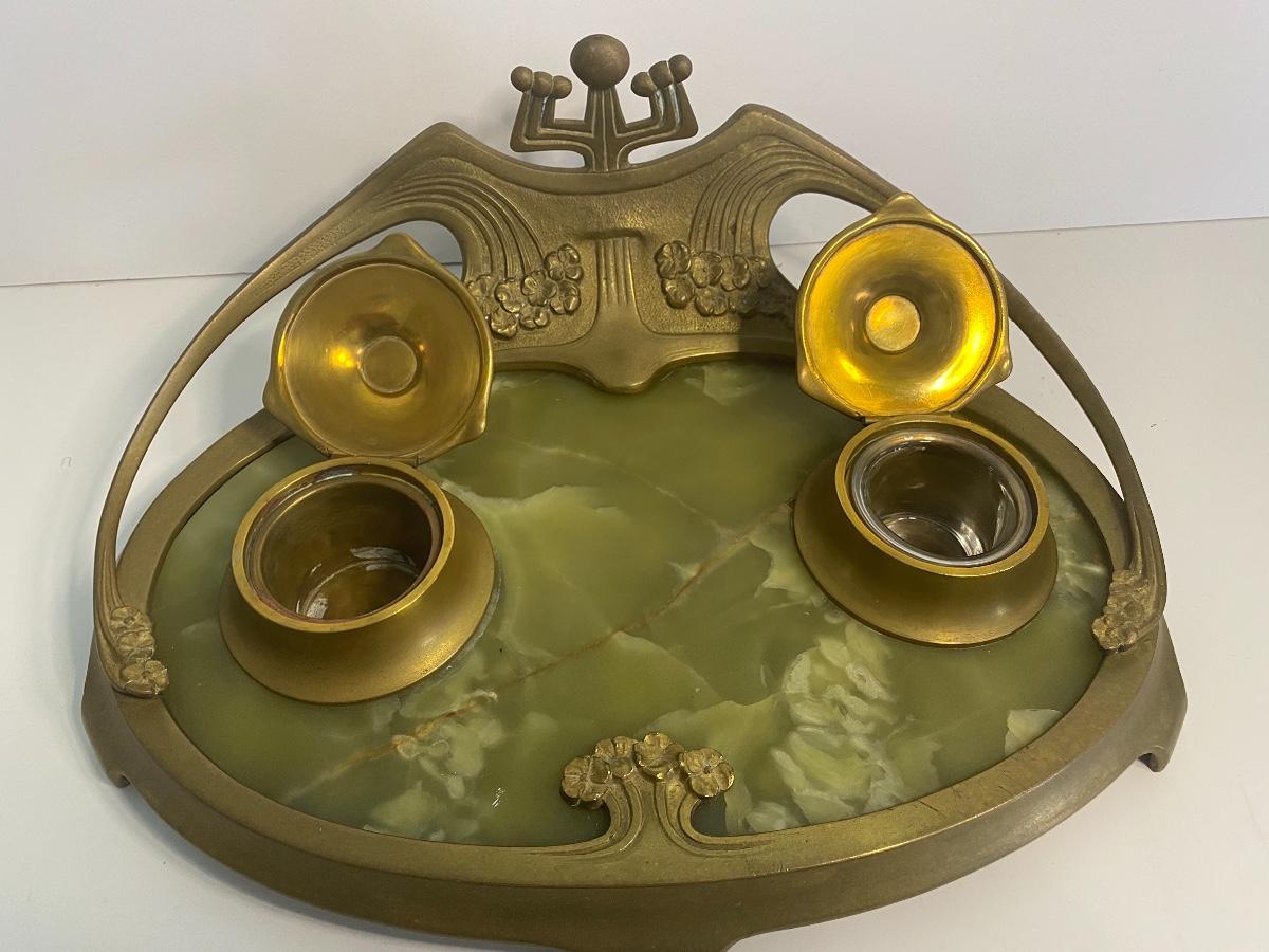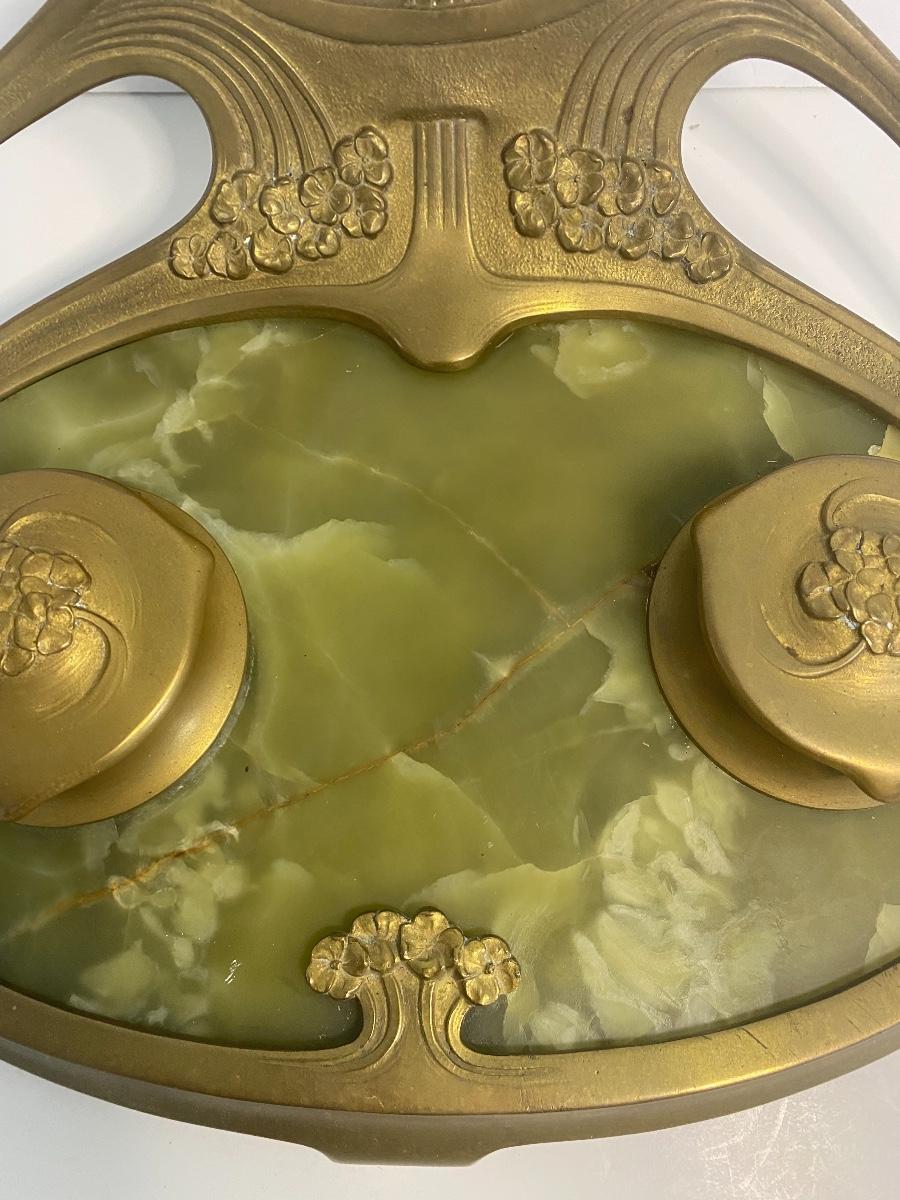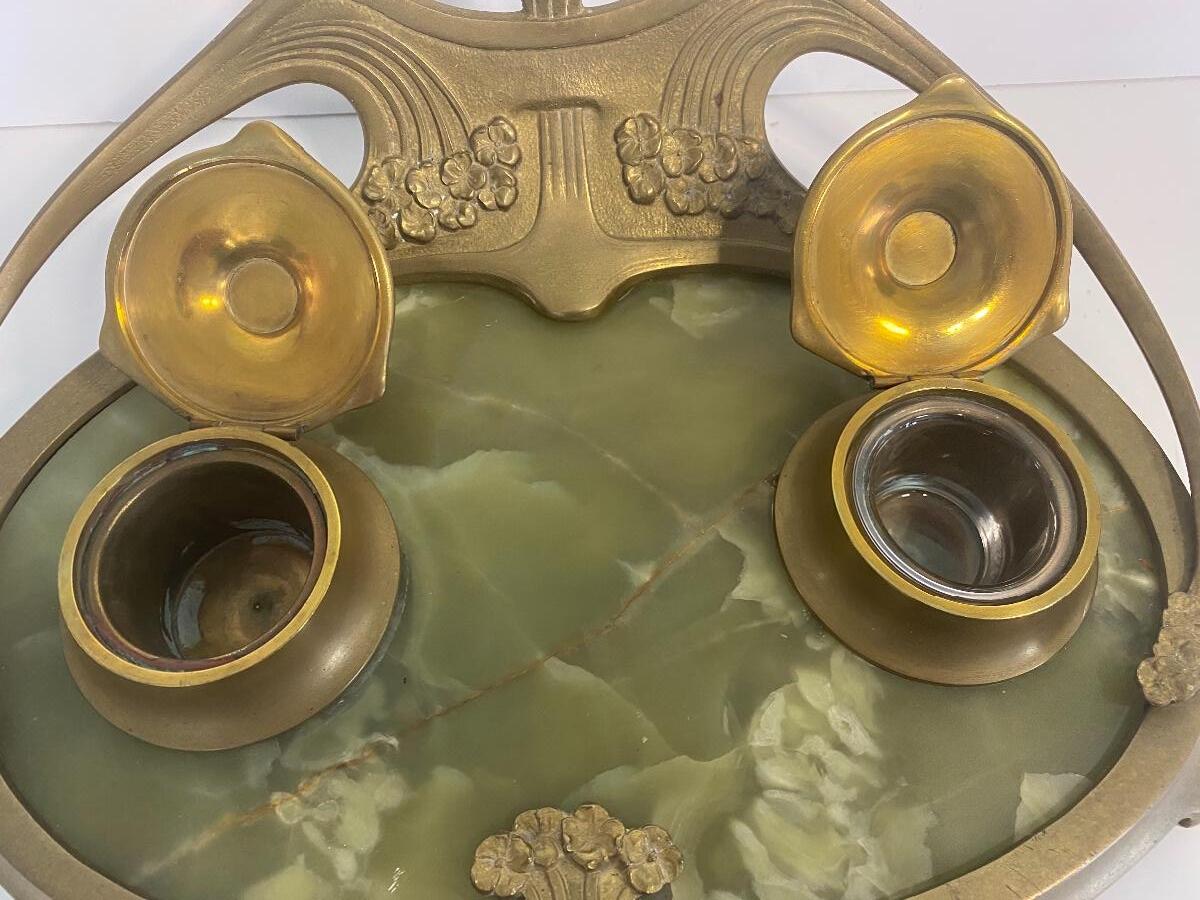 Gorgeous green marble antique inkwell. The inkwell base is green marble, it has a natural crack in it, but does not go all the way through. Also, one of the glass inserts is gone. These are very hard to find and in this size and condition!