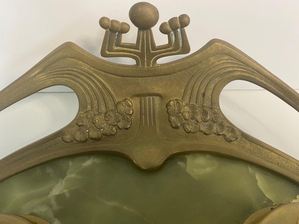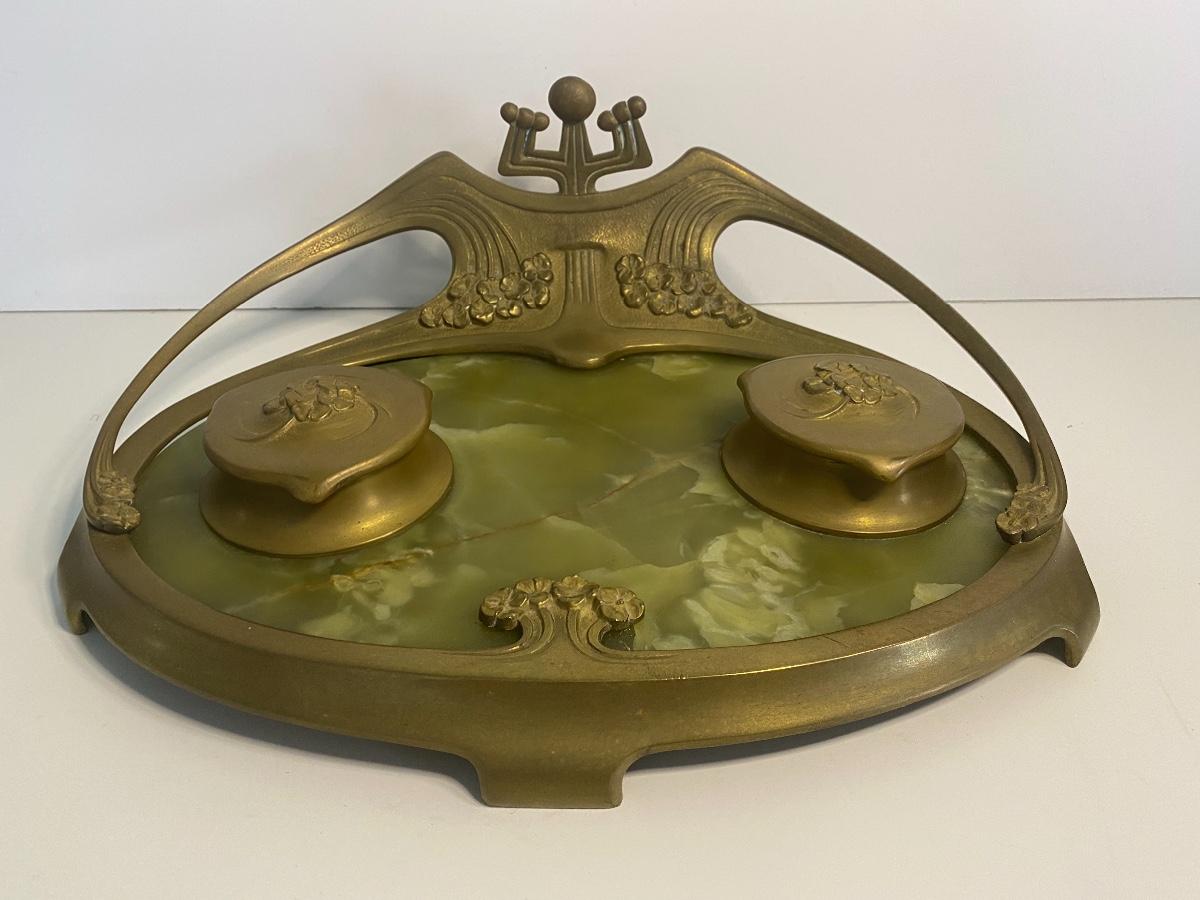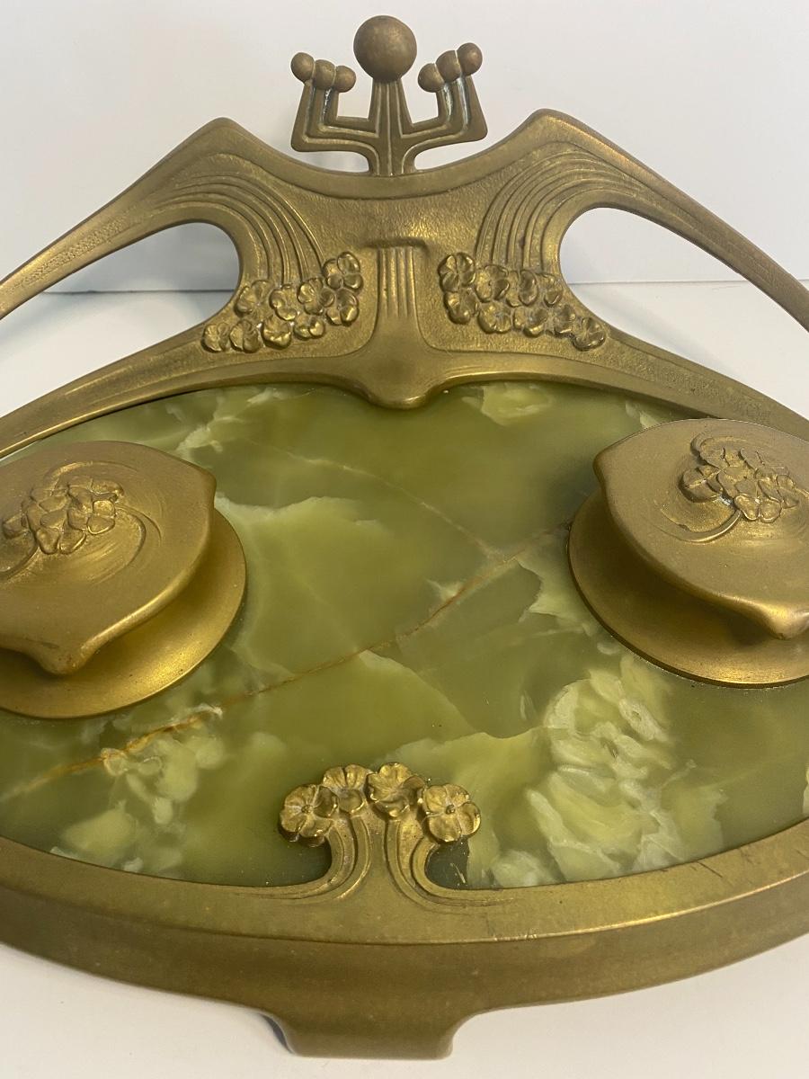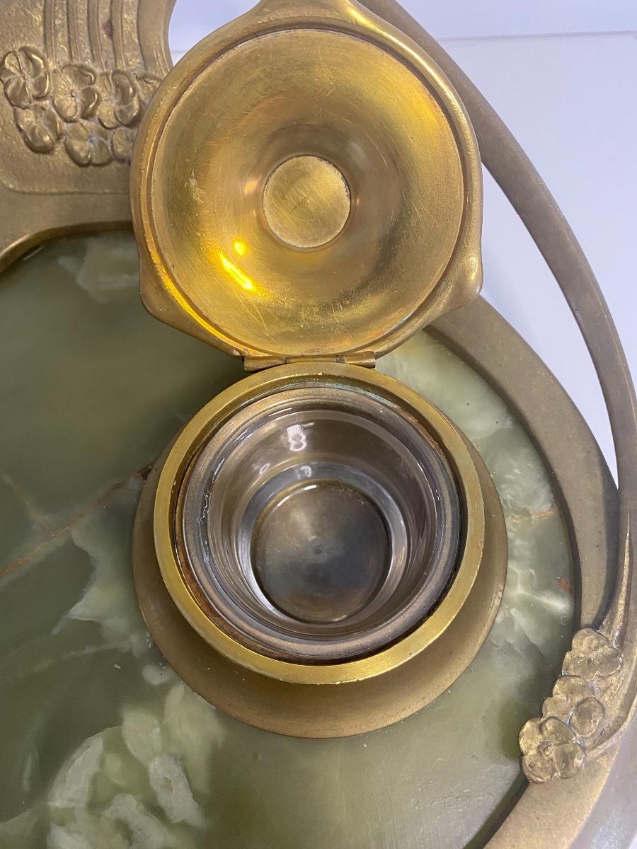 Gorgeous green marble antique inkwell. The inkwell base is green marble, it has a natural crack in it, but does not go all the way through. Also, one of the glass inserts is gone. These are very hard to find and in this size and condition!