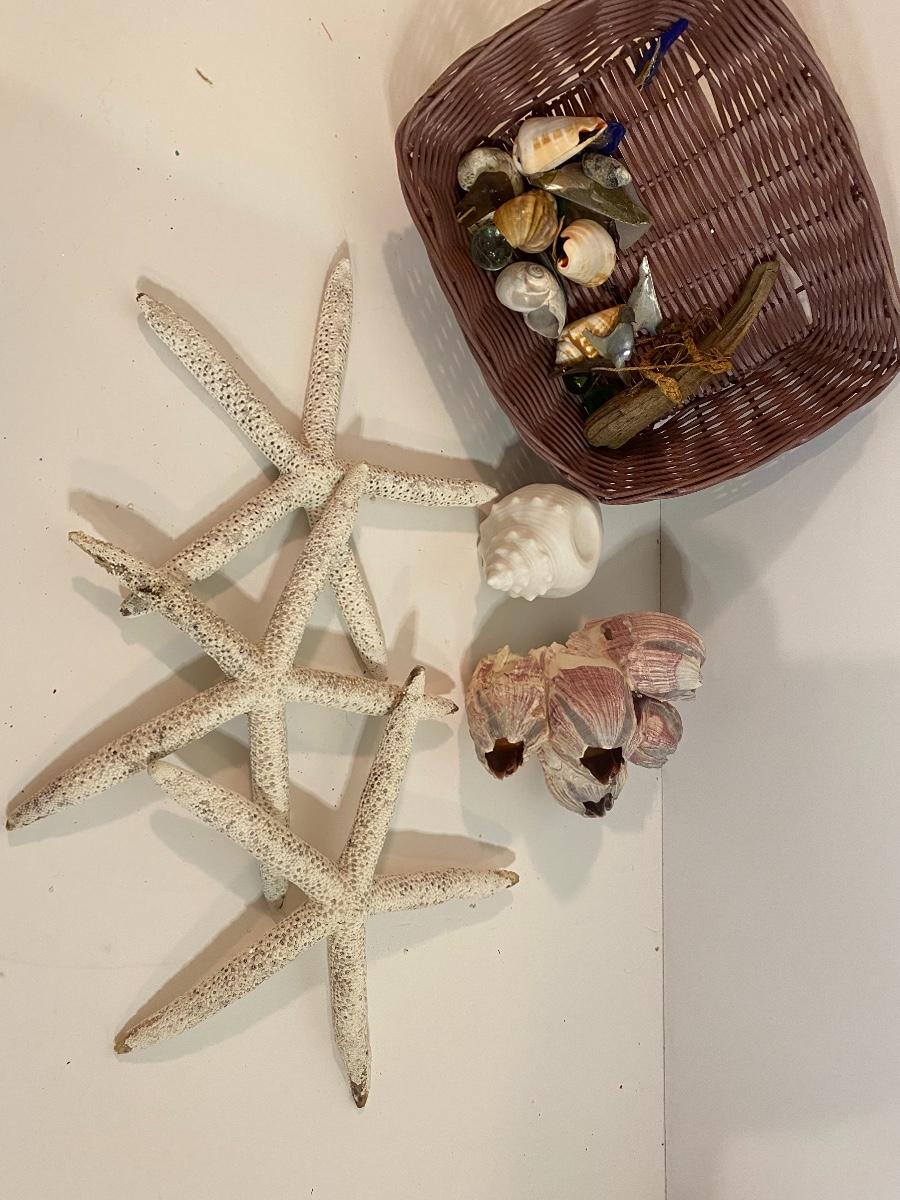 Nice lot of beach decor including vintage seagull wall hanging, Egret Photo Artwork, Shells, and wreath with shell.