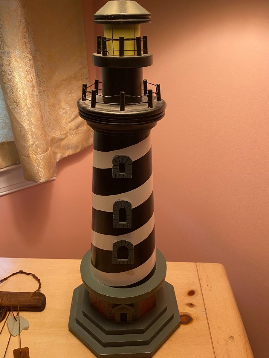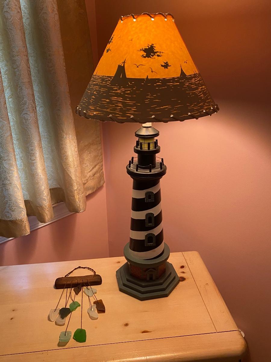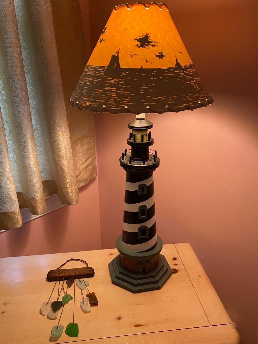 Very Cool Lighthouse Lamp and small sea-glass piece.