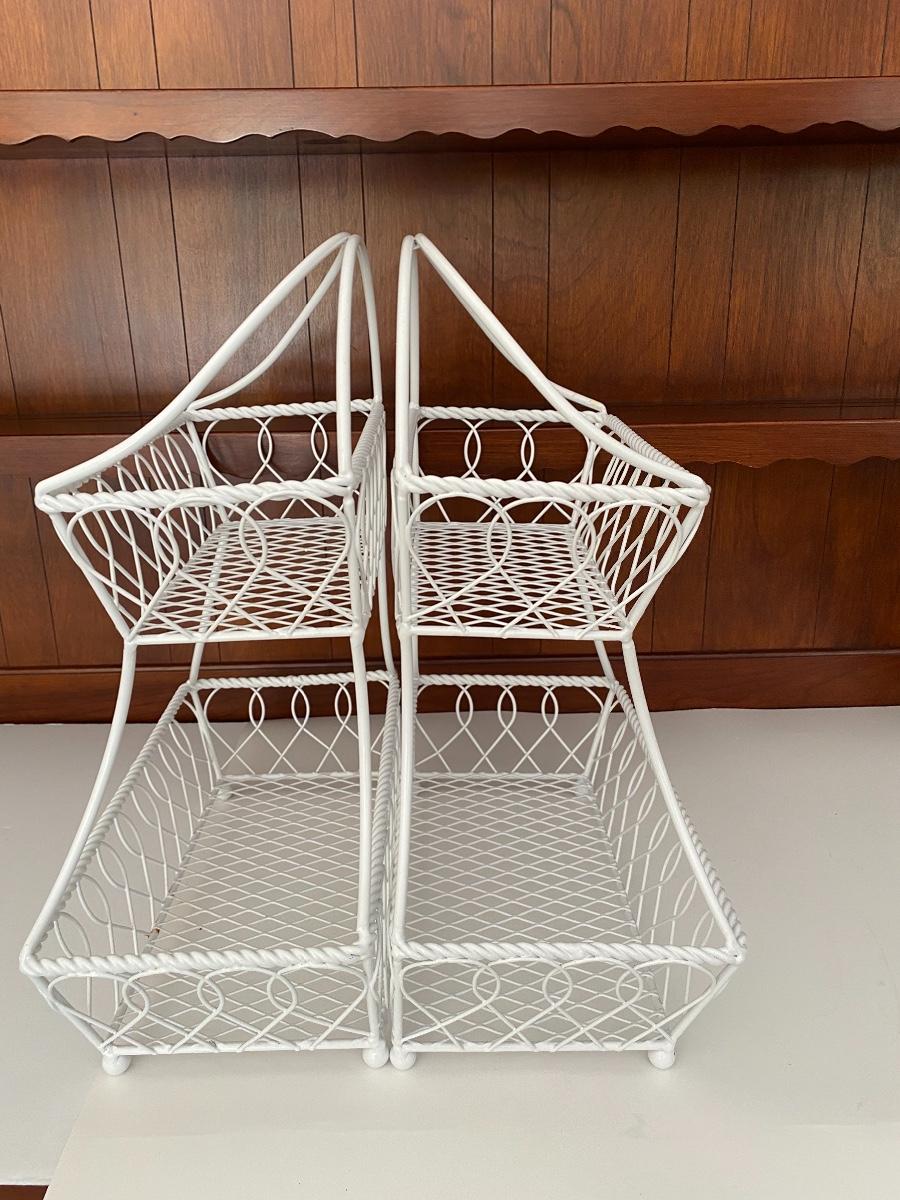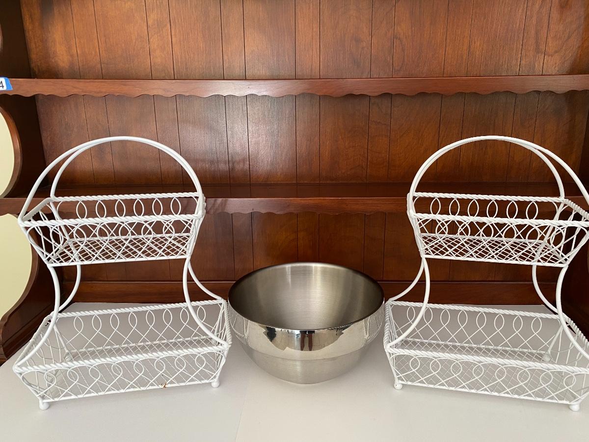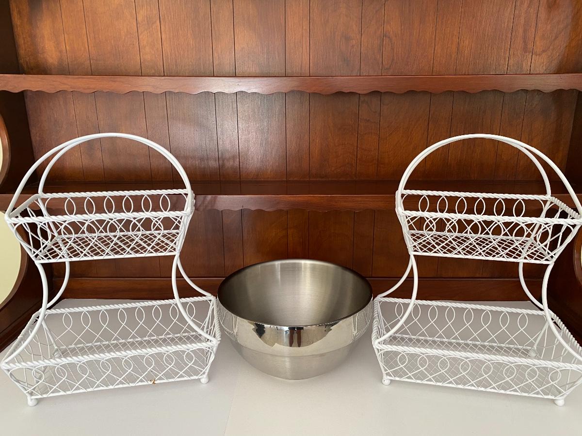 Two white metal tiered stands for fruit, mail, washcloths etc. Perfect in any room and a large Hoffritz Stainless Salad Bowl