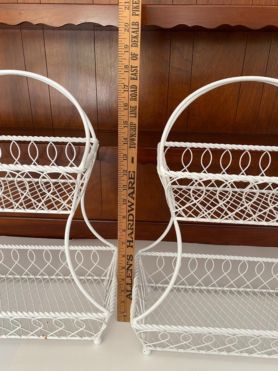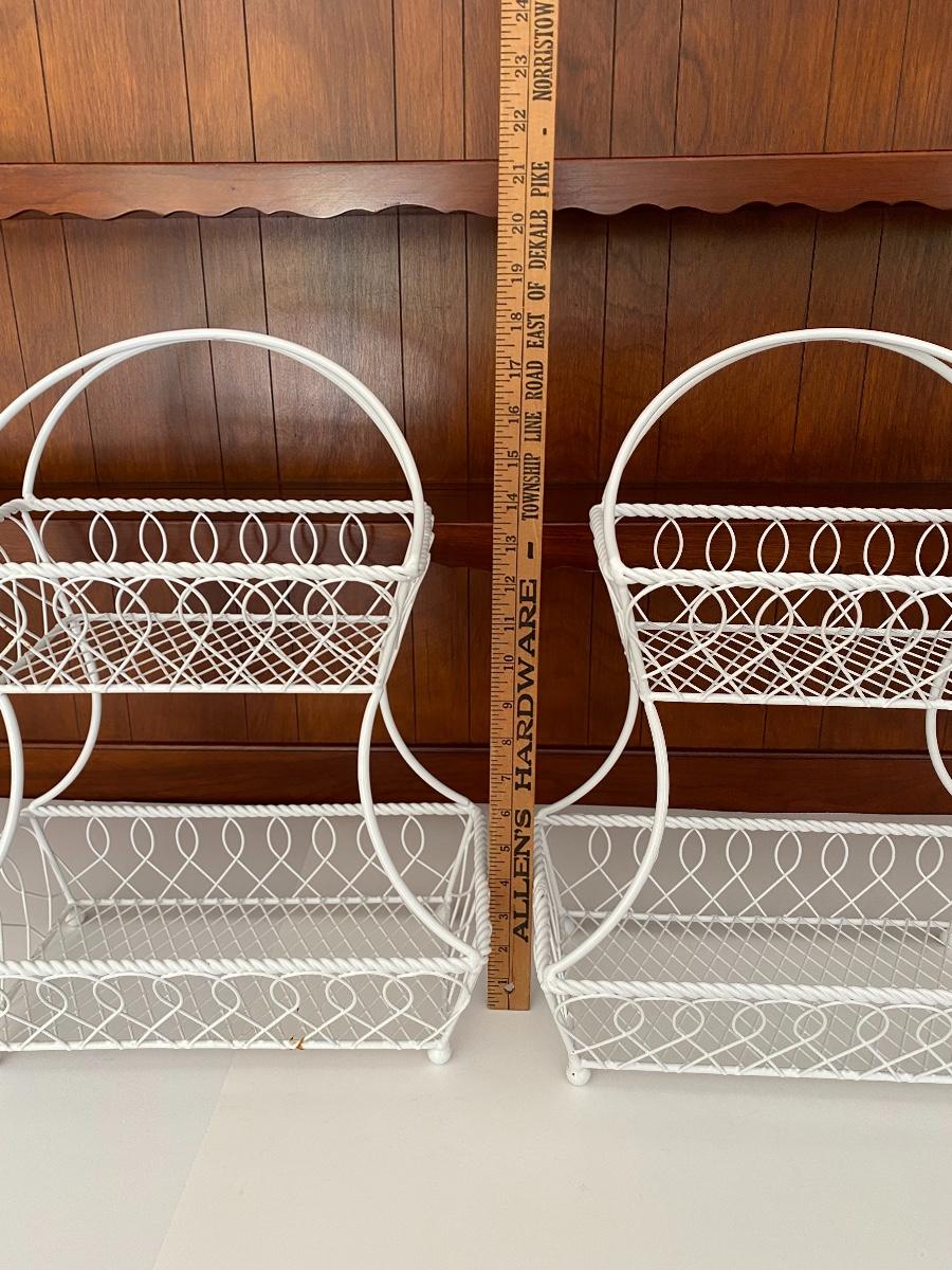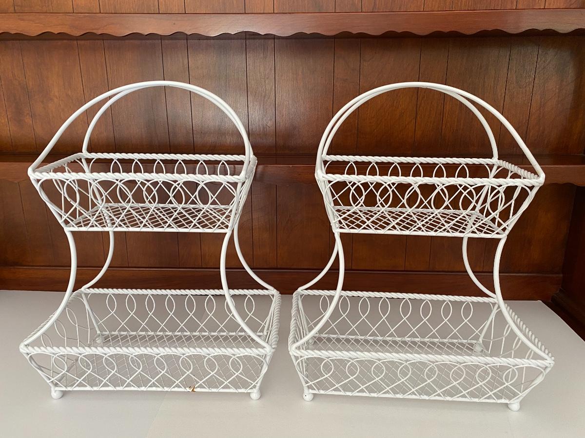 Two white metal tiered stands for fruit, mail, washcloths etc. Perfect in any room and a large Hoffritz Stainless Salad Bowl