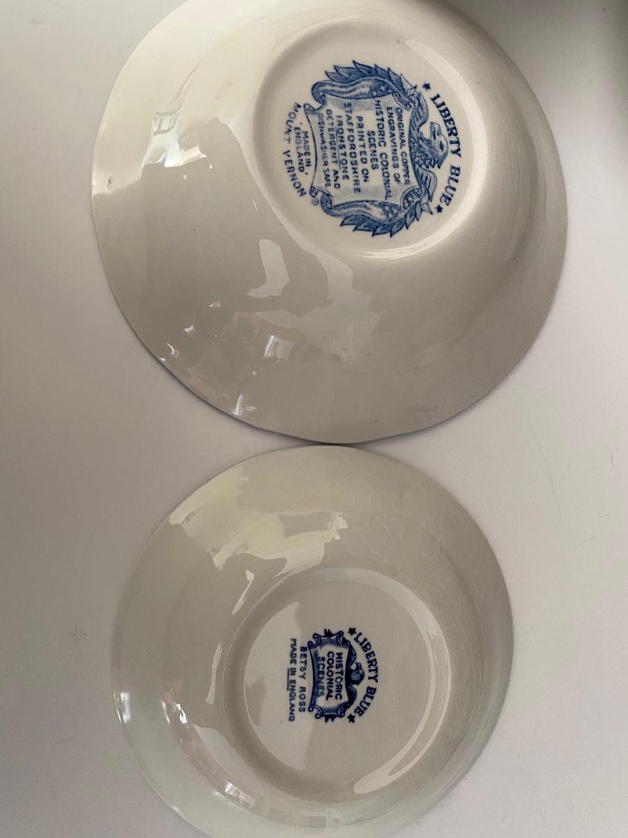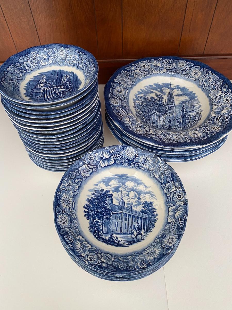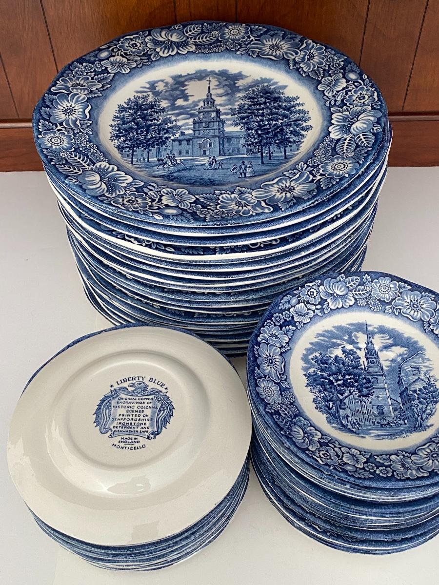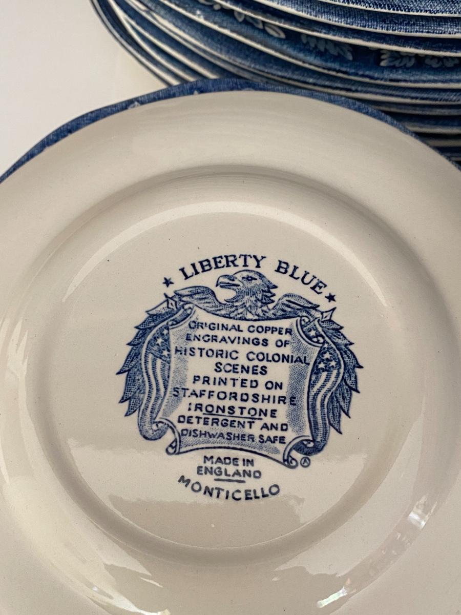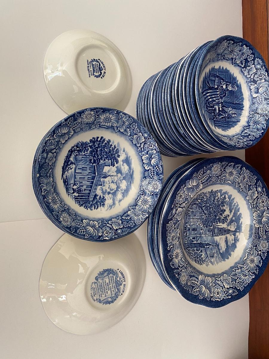Liberty Blue Place settings including plates, bowls, saucers, teacups and more. Mixed lot.