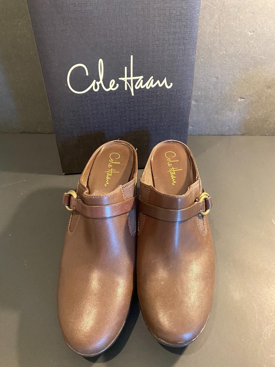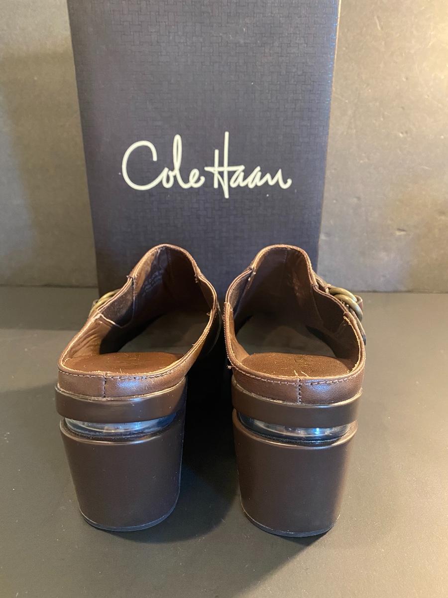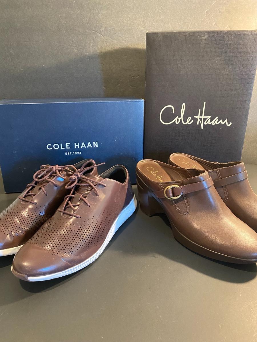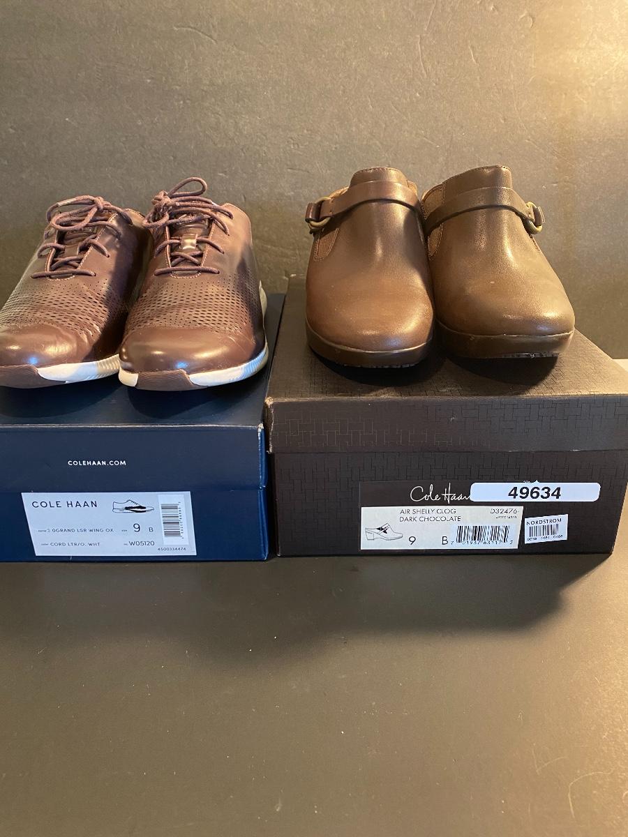 Two pair of Cole Haan shoes. Size 9. Pre-owned, gently worn. Brown clogs with heel. Brown casual leather sneakers.