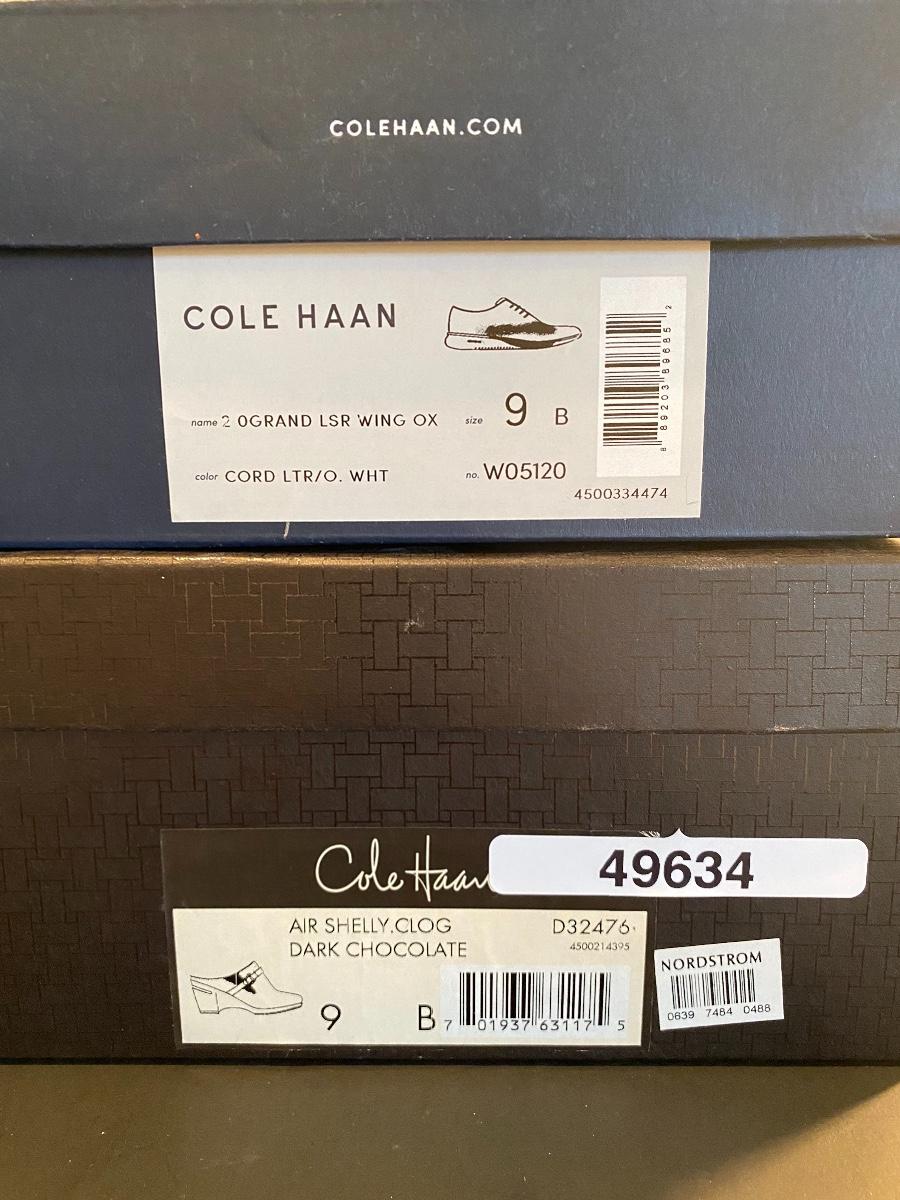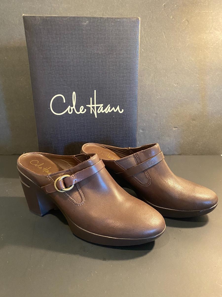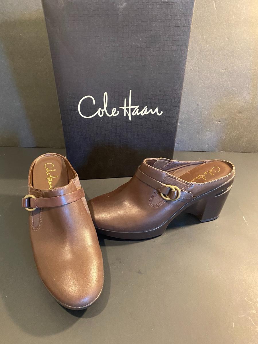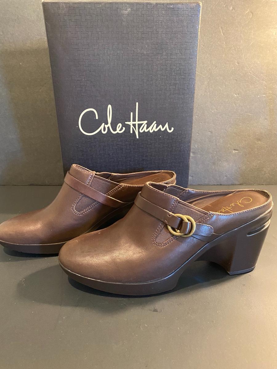 Two pair of Cole Haan shoes. Size 9. Pre-owned, gently worn. Brown clogs with heel. Brown casual leather sneakers.