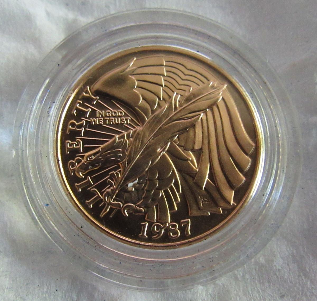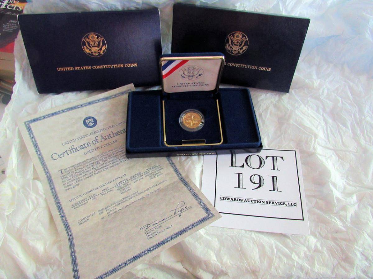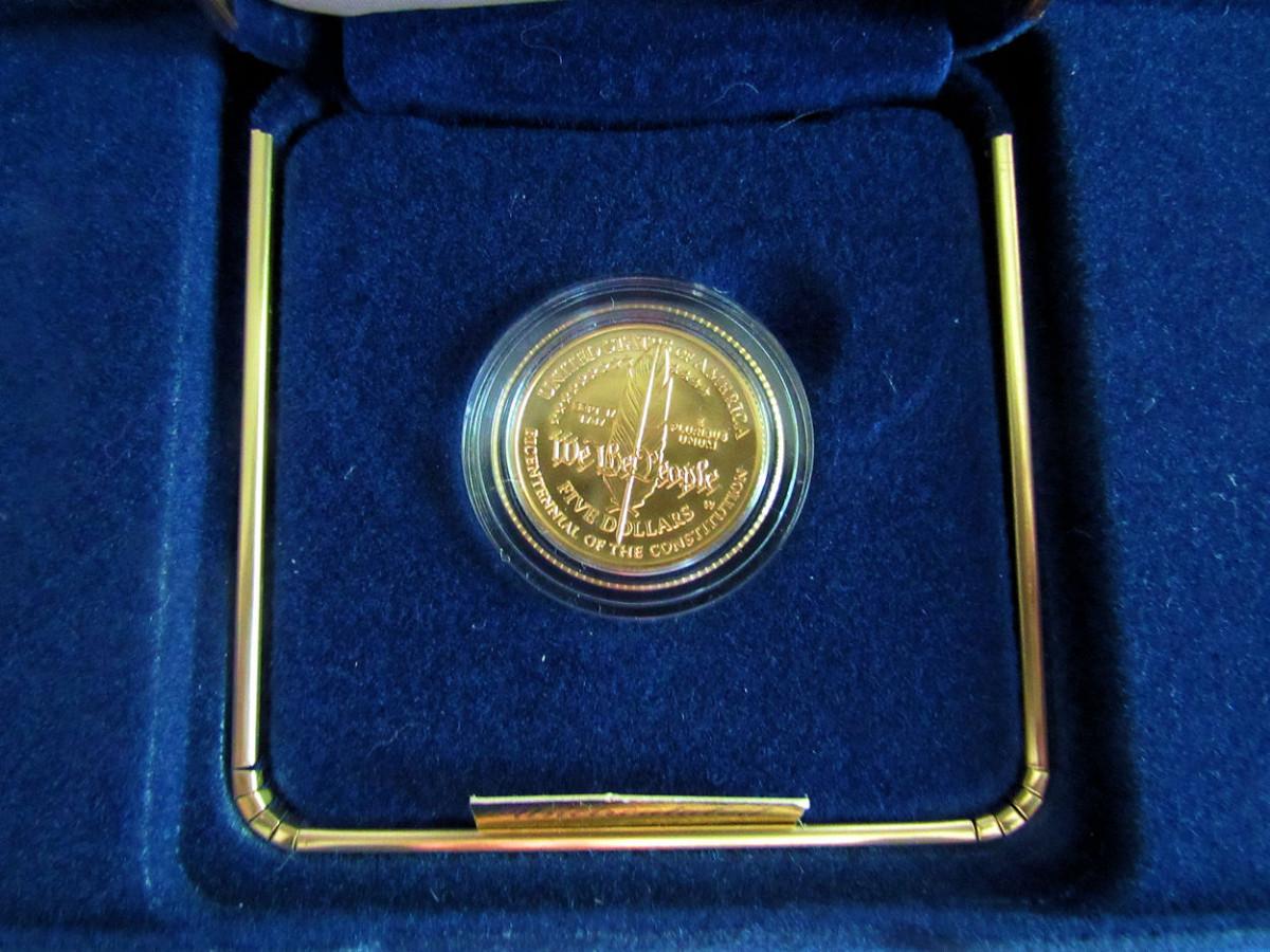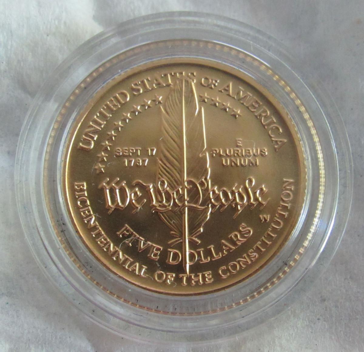 Beautiful Uncirculated condition. This is a $5.00 gold coin commemorating the bicentennial of the Constitution. It is .850 inch in diameter, and is .900 fine, weighing .2687 troy ounces, .24 troy oz of pure gold. All original with all packaging and insert. Cash only, local pick up only.