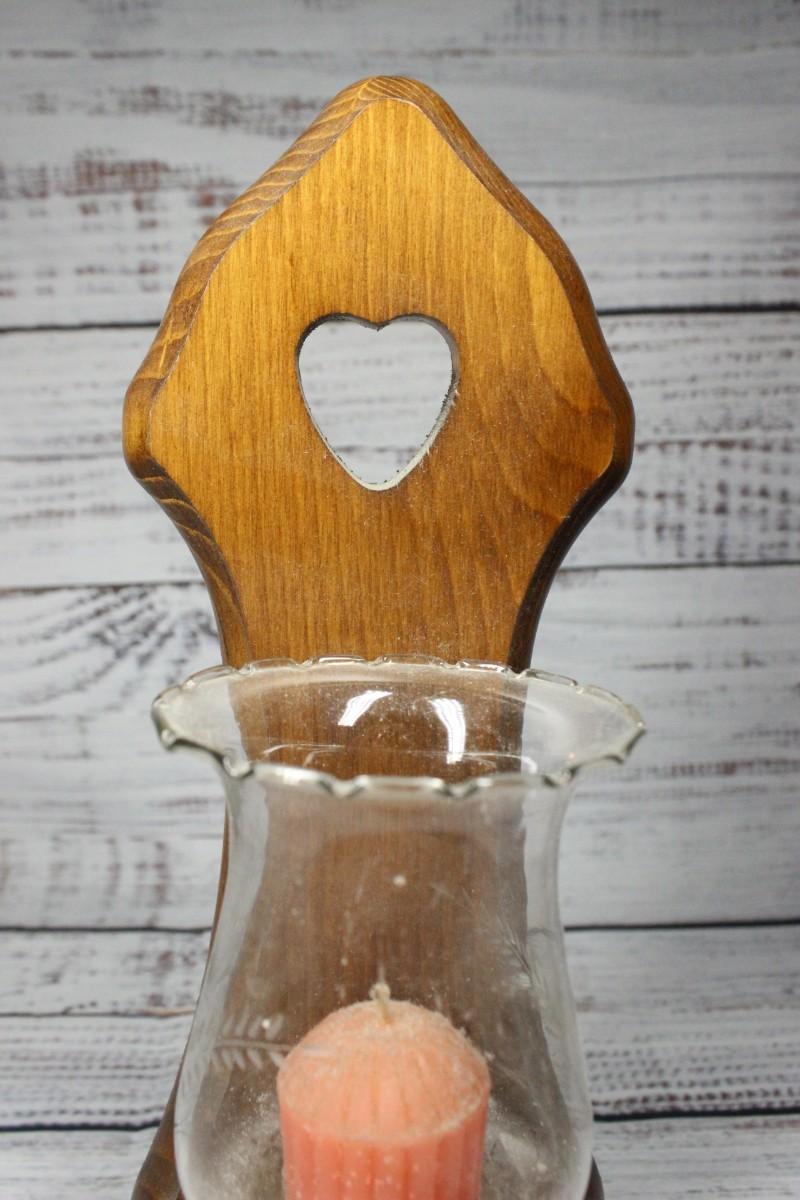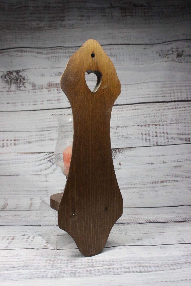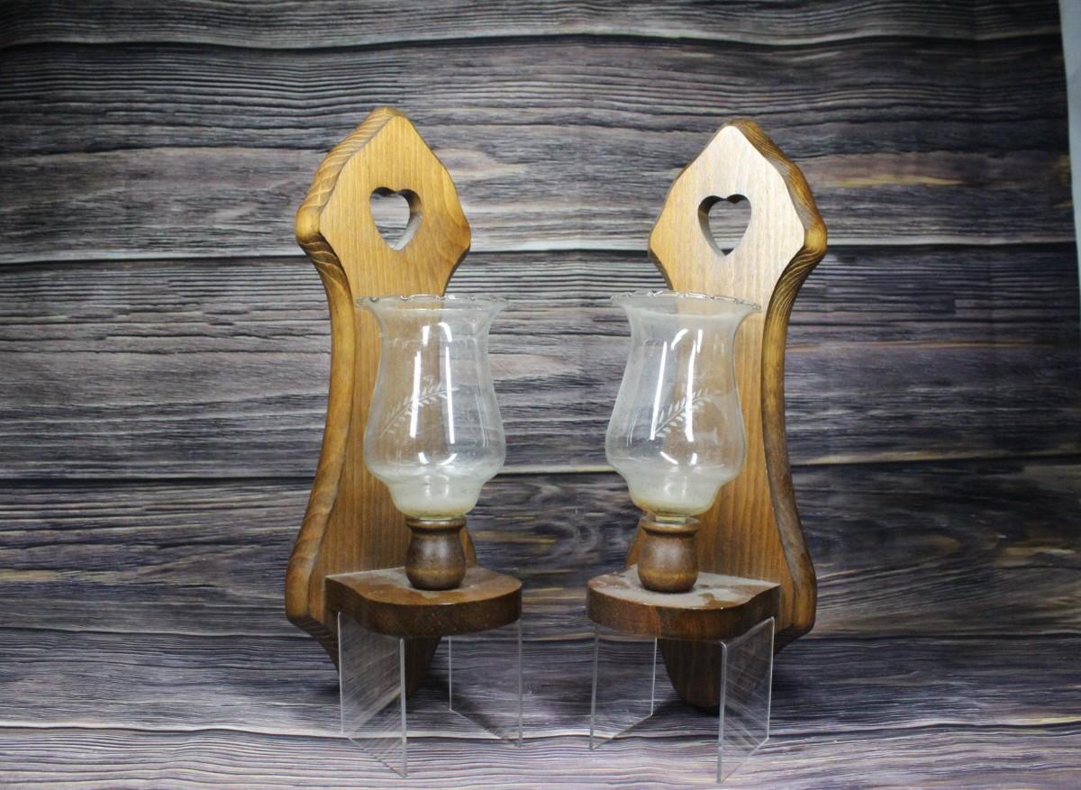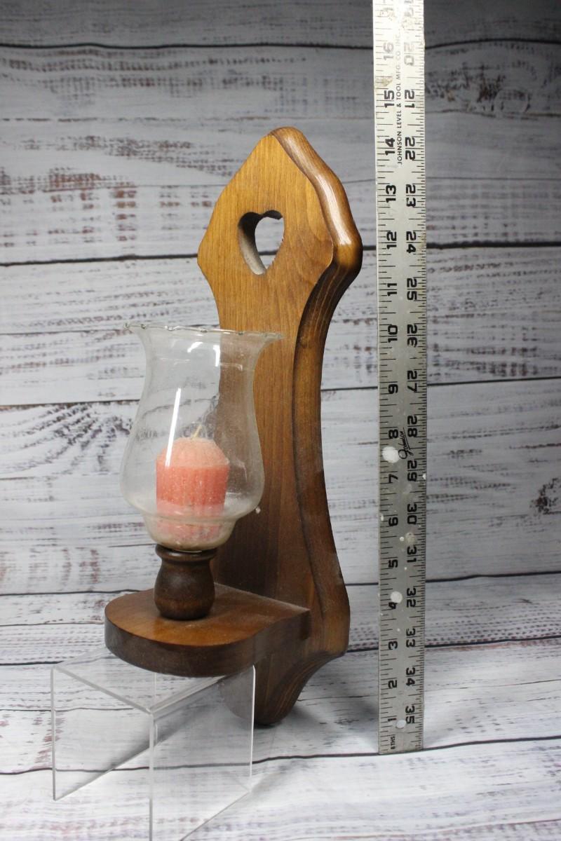 These wall mounted antique wooden candleholders measure to about 14" tall, there is slight wear on the glass. There is no significant cracks or chips to the wood.