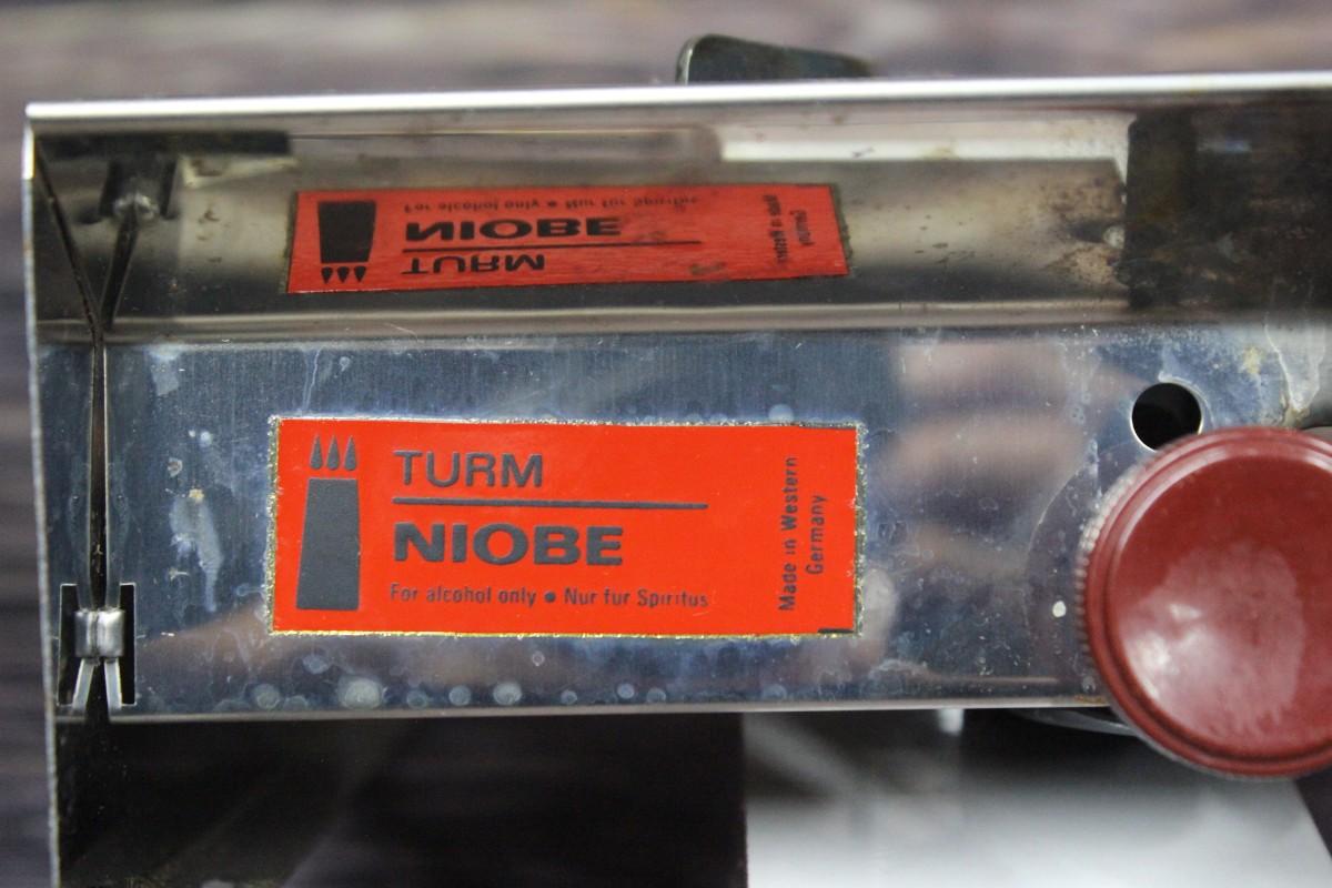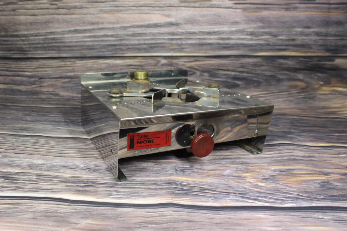 Vintage Turm Niobe single burner camp stove. Made in Western Germany, in excellent vintage condition. Untested. Sticker says it is alcohol fueled. Looks complete.