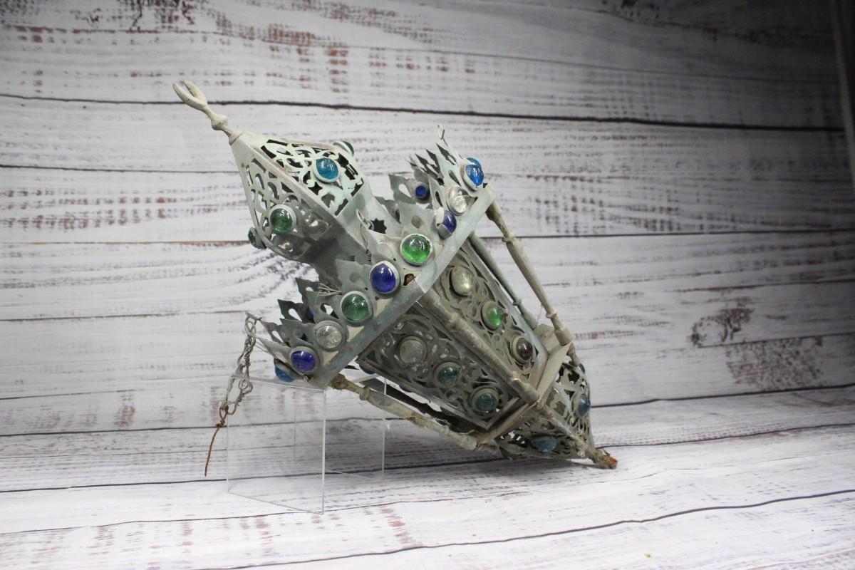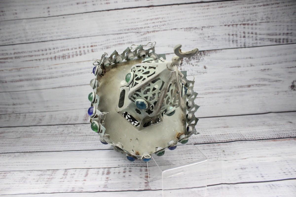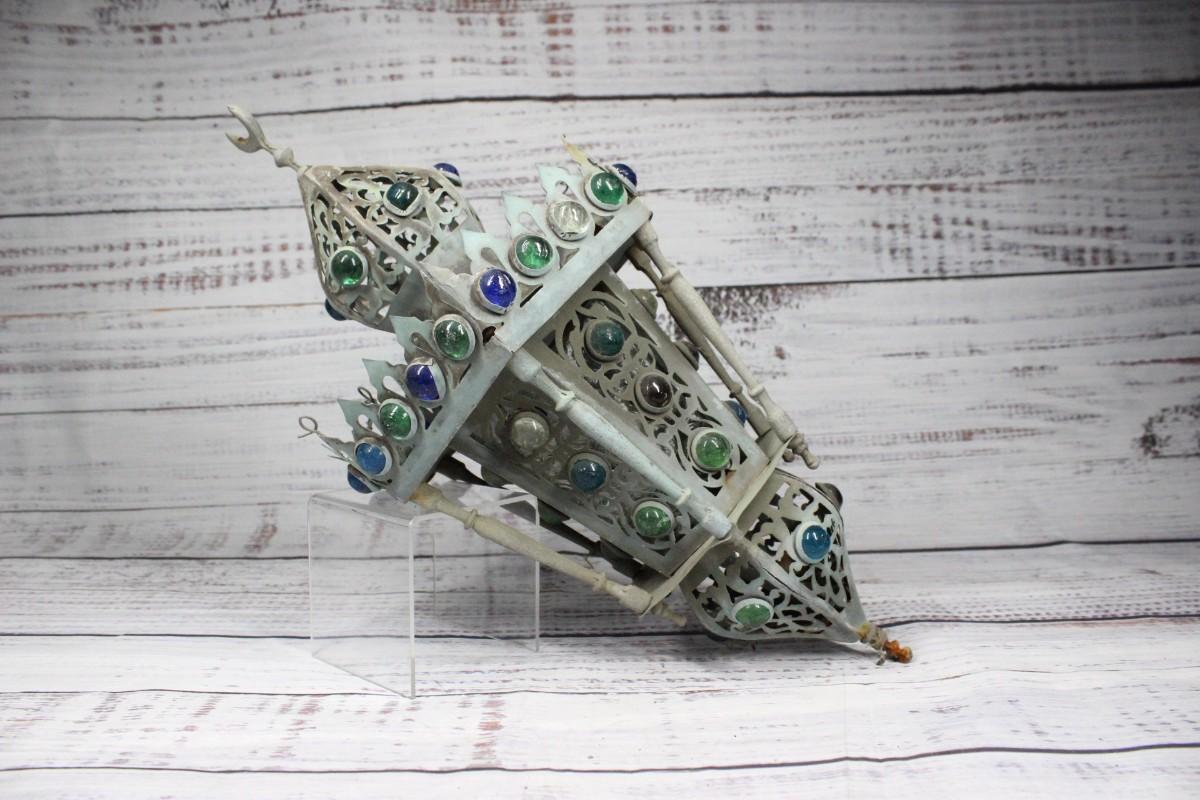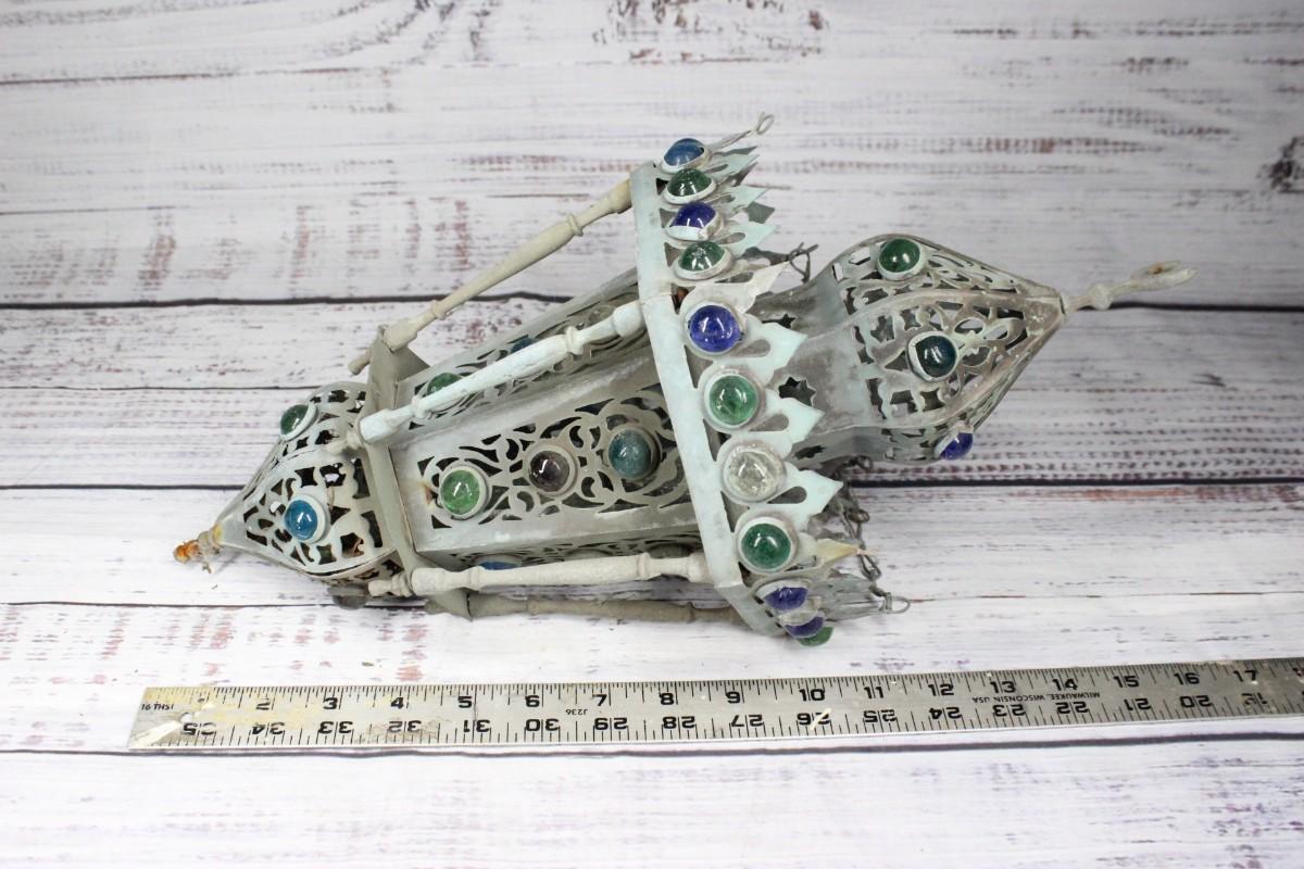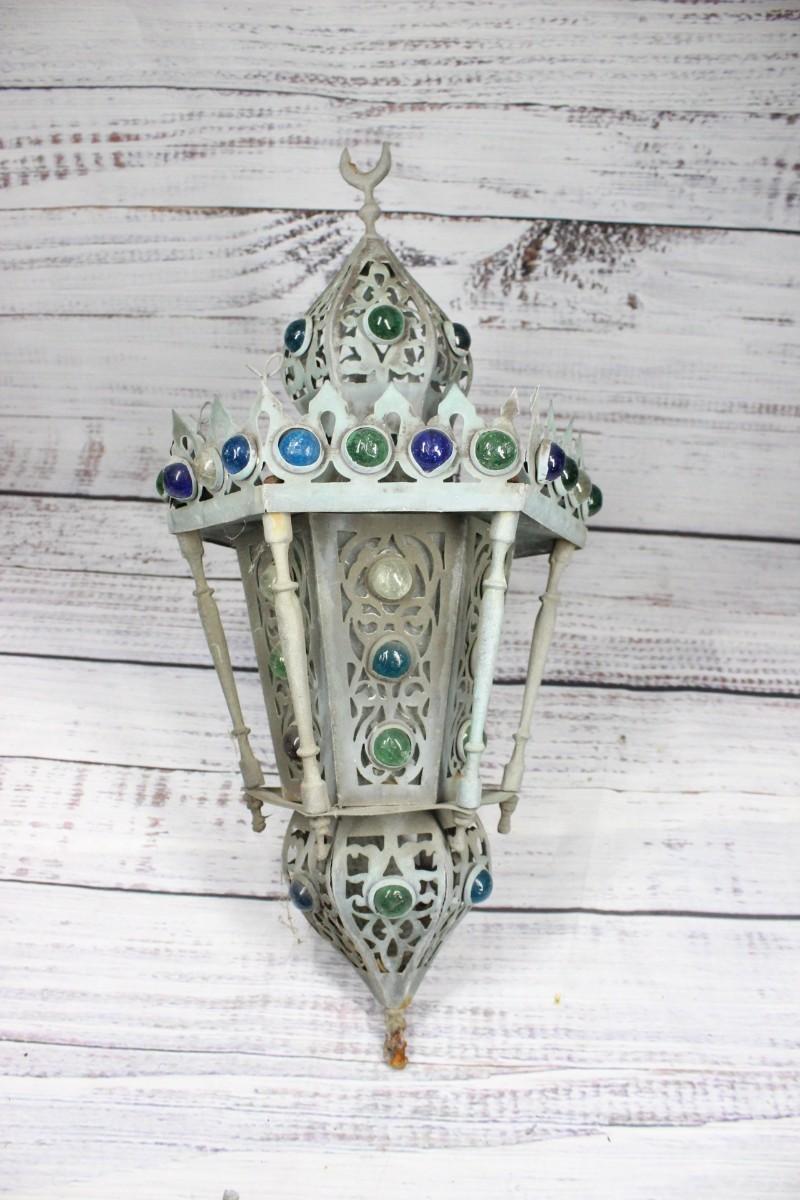 Vintage Gothic Moroccan Metal Hanging Decor. Needs to be cleaned a little. This is not a lamp or light fixture. There is some glass panels that have come loose from inside.