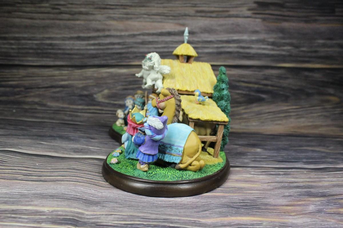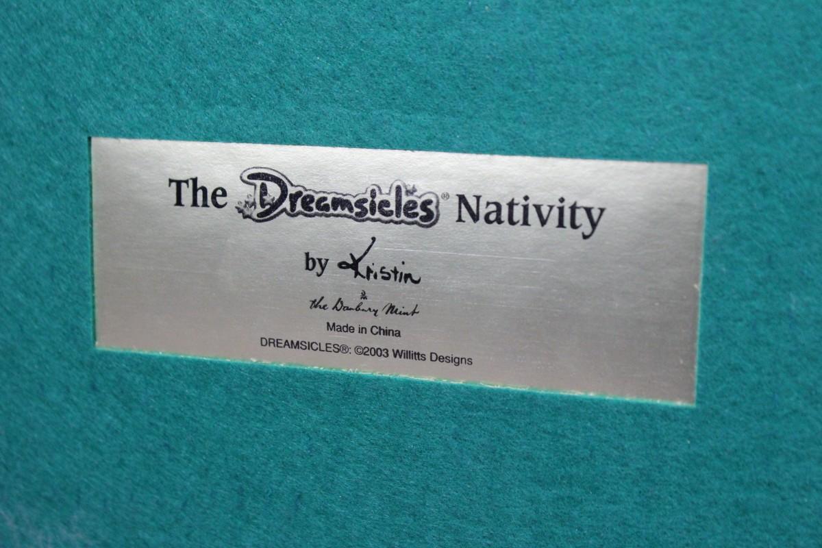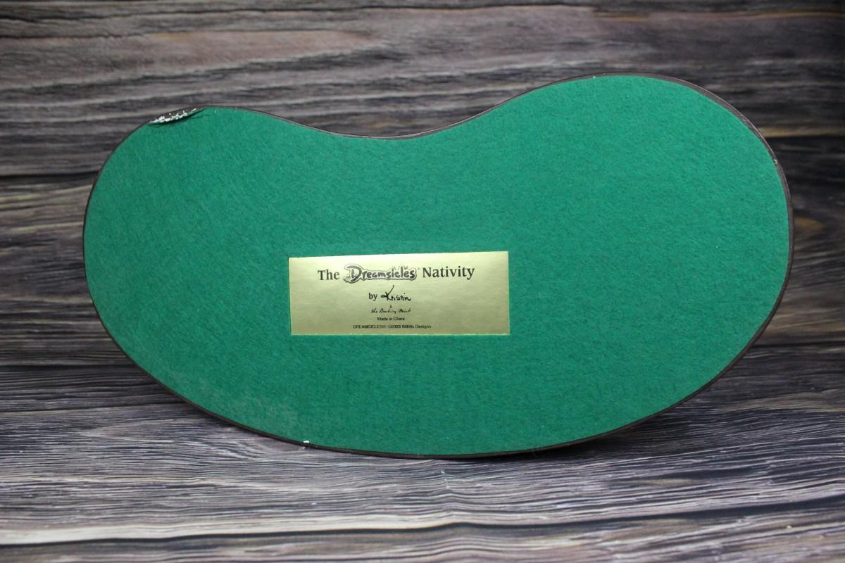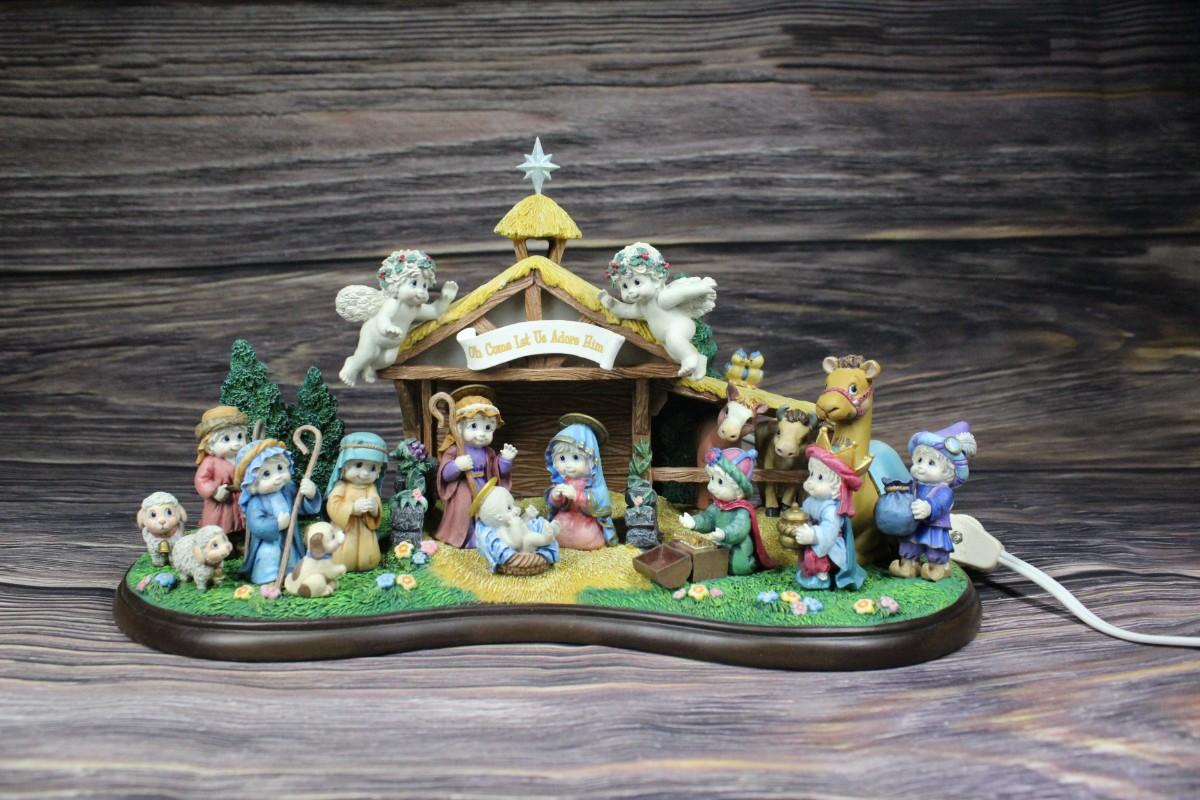 Danbury Mint Dreamsicles Nativity set, there is no significant damage or chipping. There is slight denting to the corner which is pictured above. The manger light bulb works and lights up, measures to around 11."