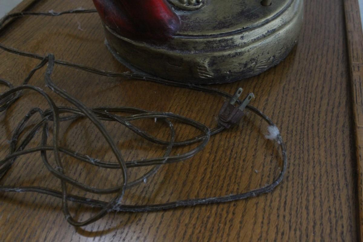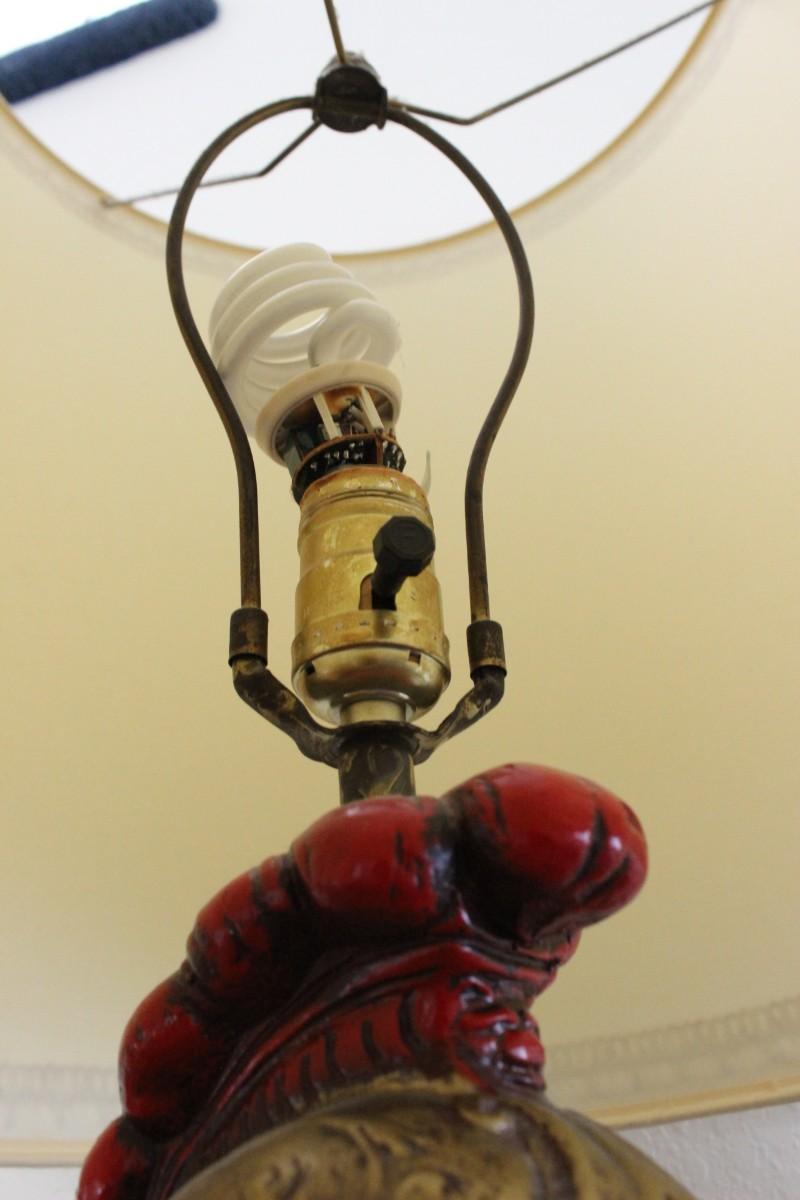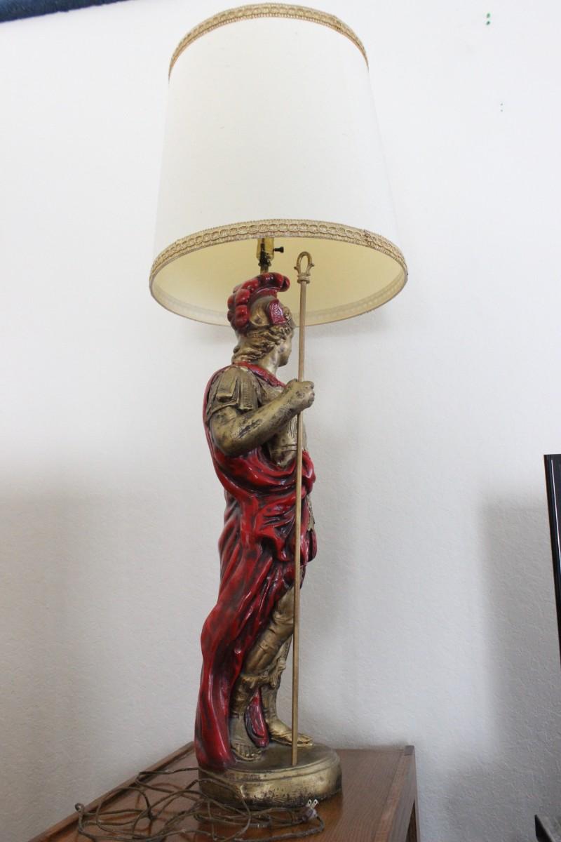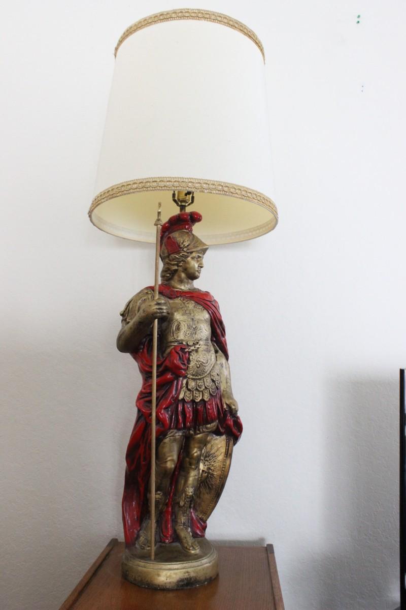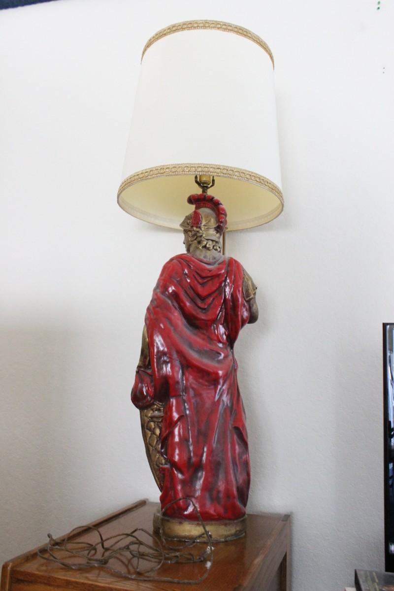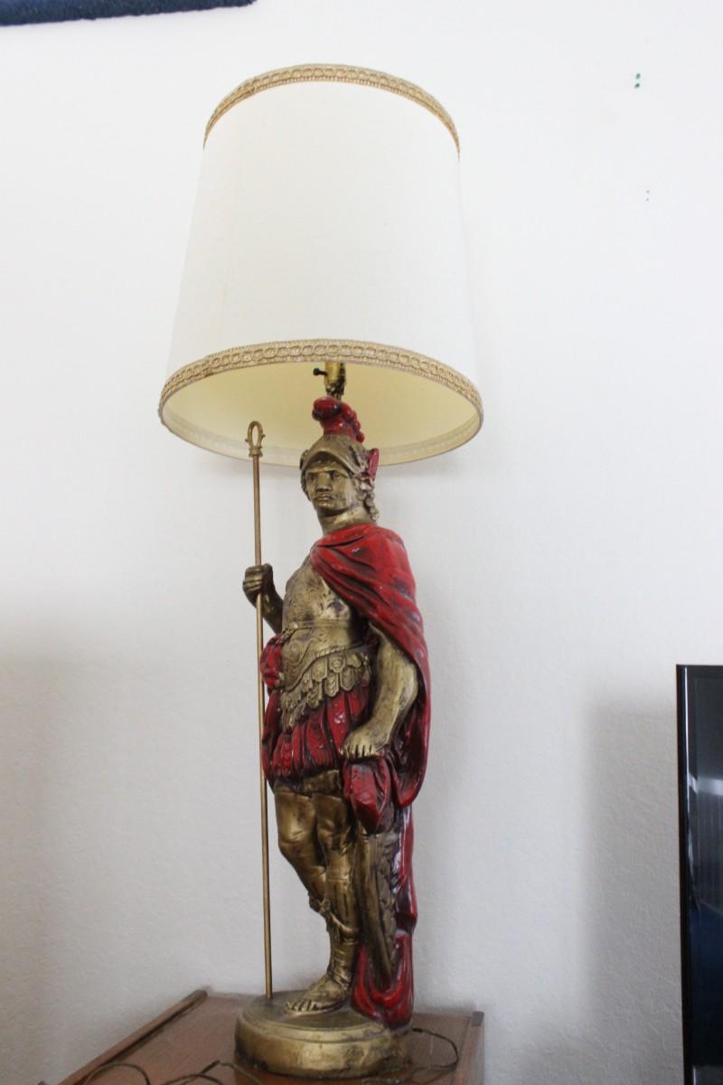 Large vintage table lamp. Fashioned after a Roman Trojan soldier. Untested, broken bulb. Stands about 4’ tall. Did not see any maker name on lamp but did not look at the underside.