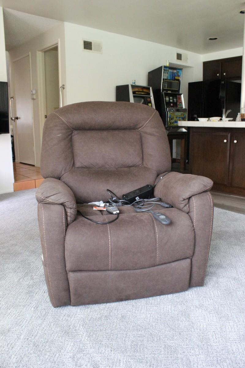 Like new lift and recline power chair. Medium brown color. Has power cord, remote, and manual. No spots, stains, or rips.