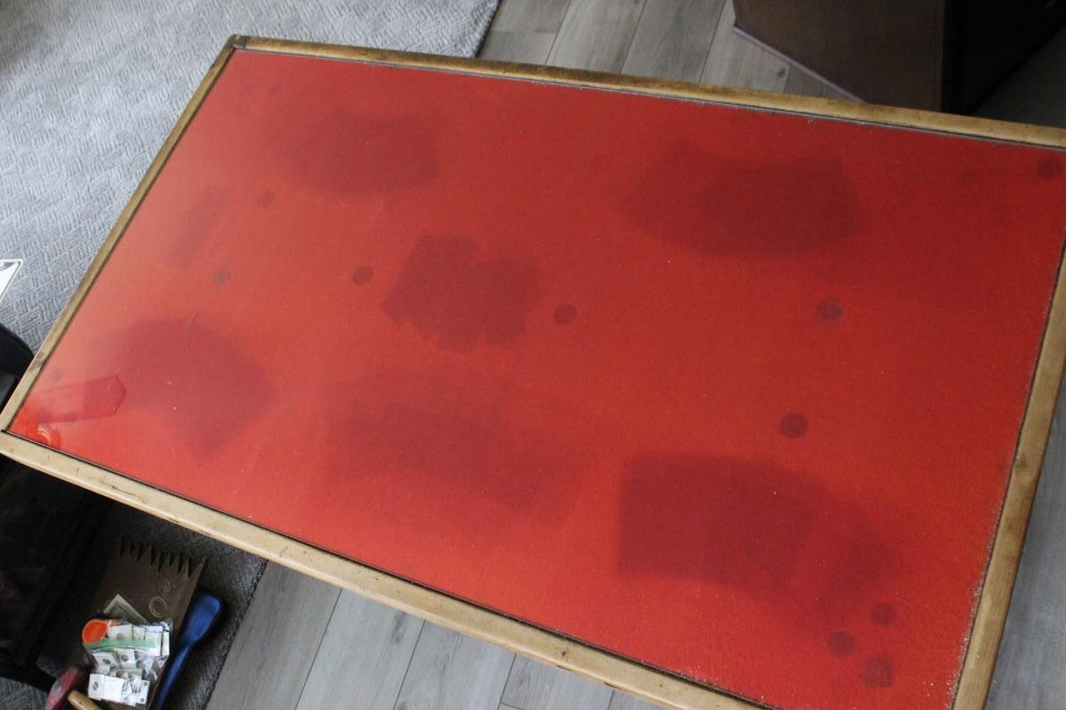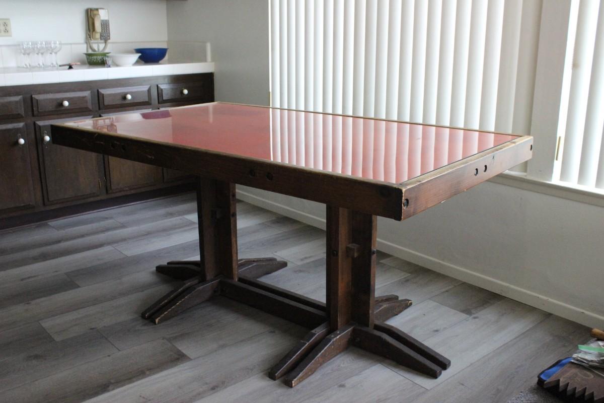 Rustic style dining/game room/ poker table. Heavy wood frame with red felt surface. Inset glass on top of felt. Previous owner had a poker game set up under the glass at one time, you can see the imprints and sun fade from age in felt. No major scratches in glass. Approx. 3x5 table surface.