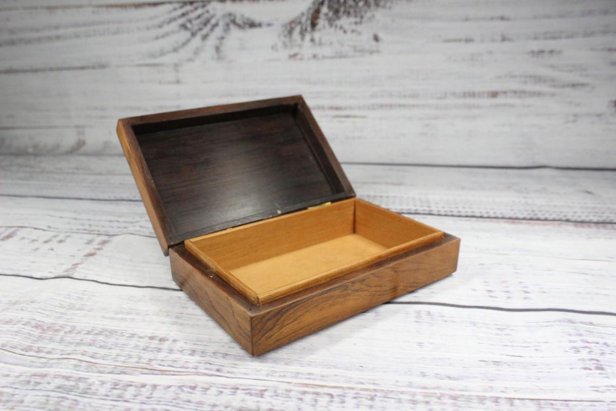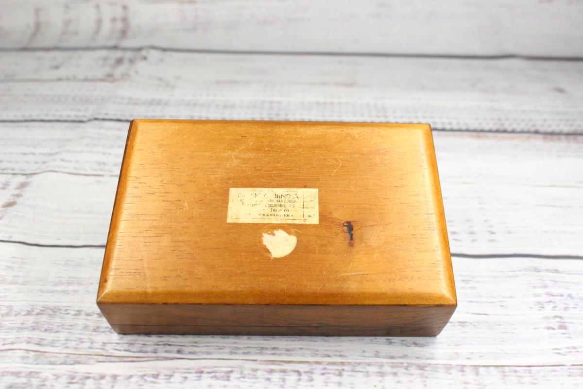 6" x 4" vintage wooden jewelry box with a metal adorned rose, there is no significant cracks or chips to the box. The stickers at the bottom have peeled off, but it seems like it's a Spanish made jewelry box.