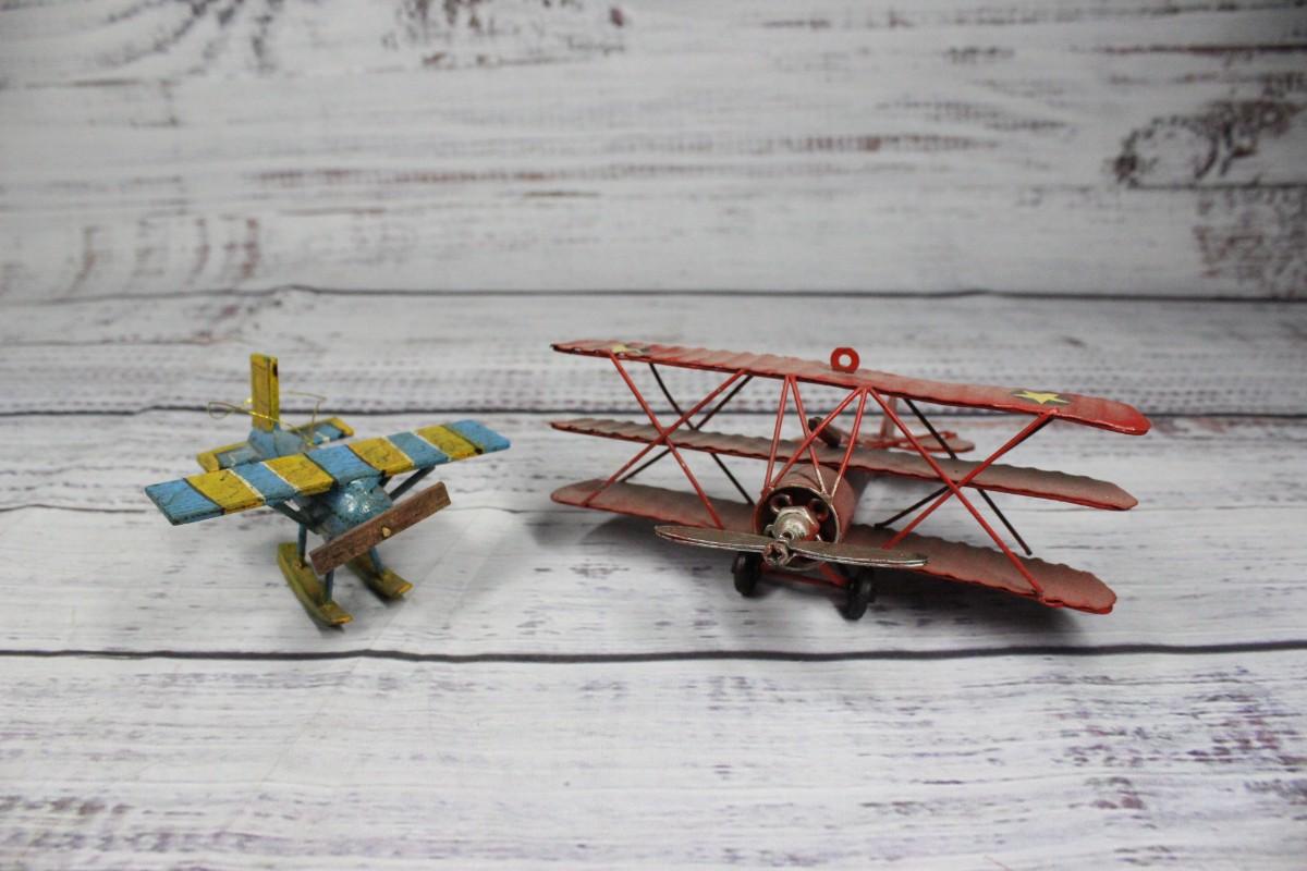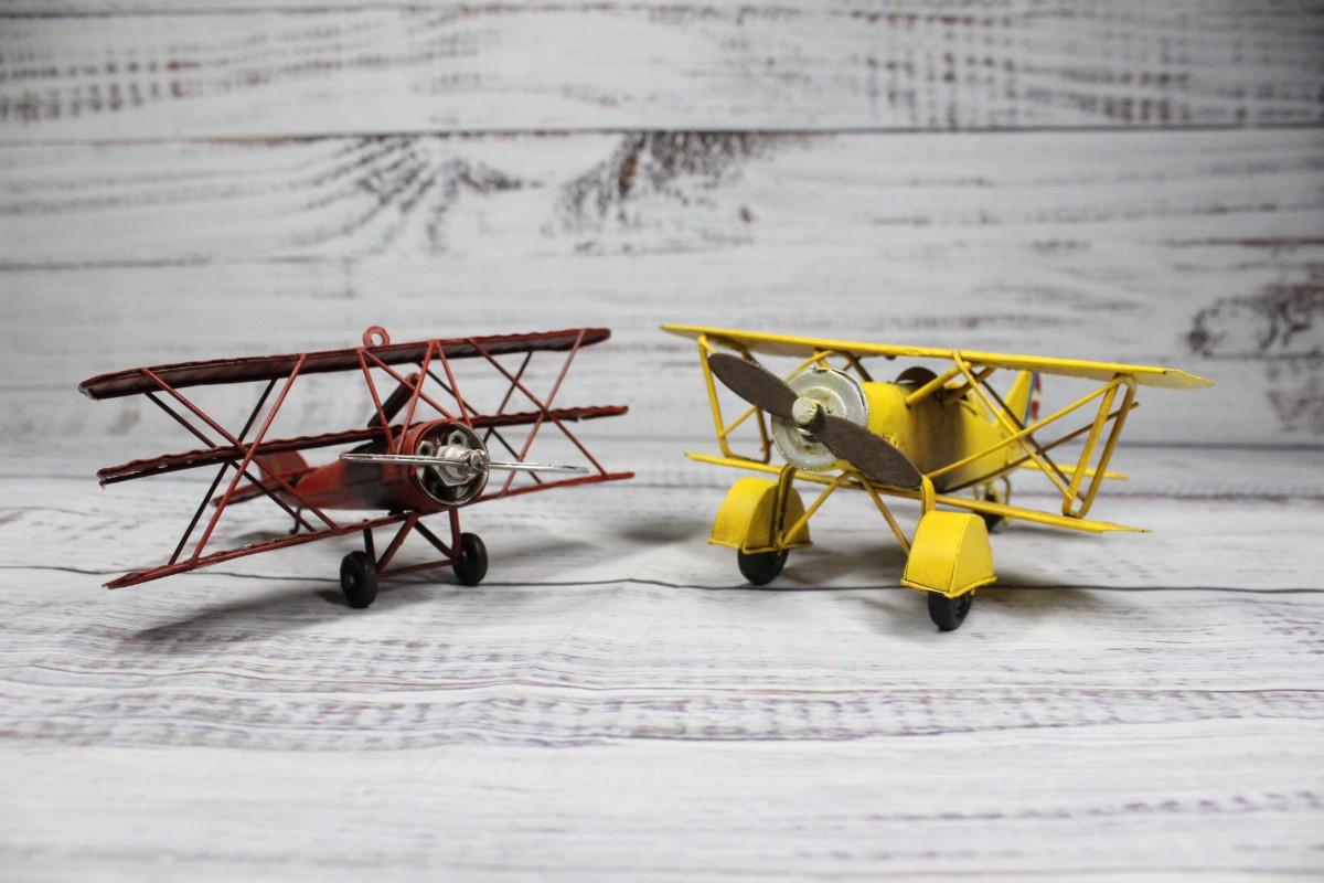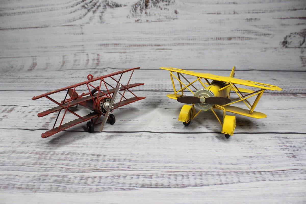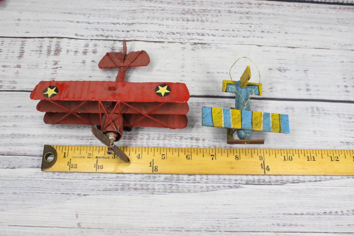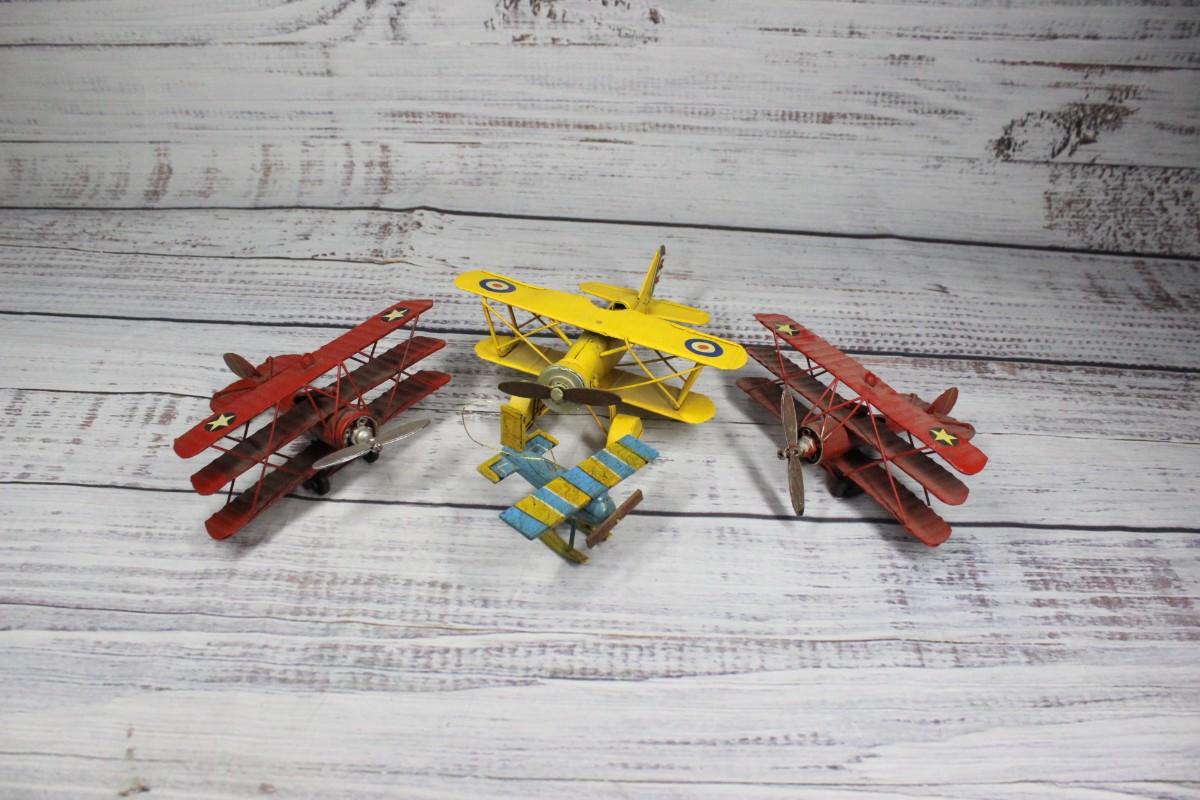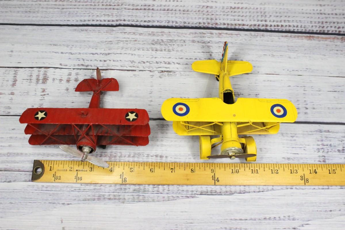 Assorted vintage tin toy biplane lot with various colors and sizes. There is no significant dents or chips to the pieces, for sizing refer to the photos above.