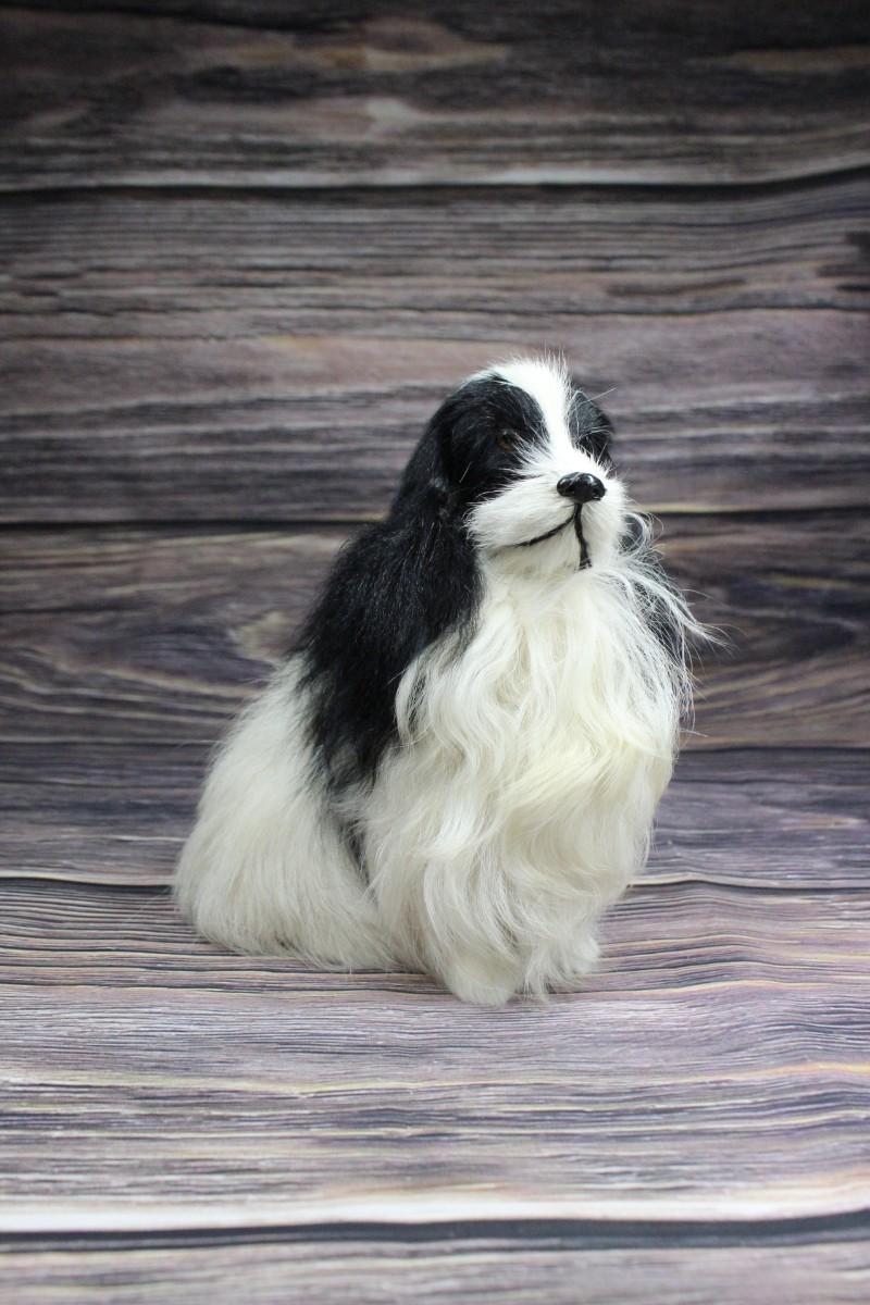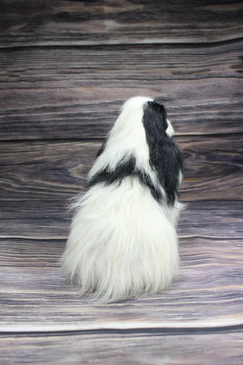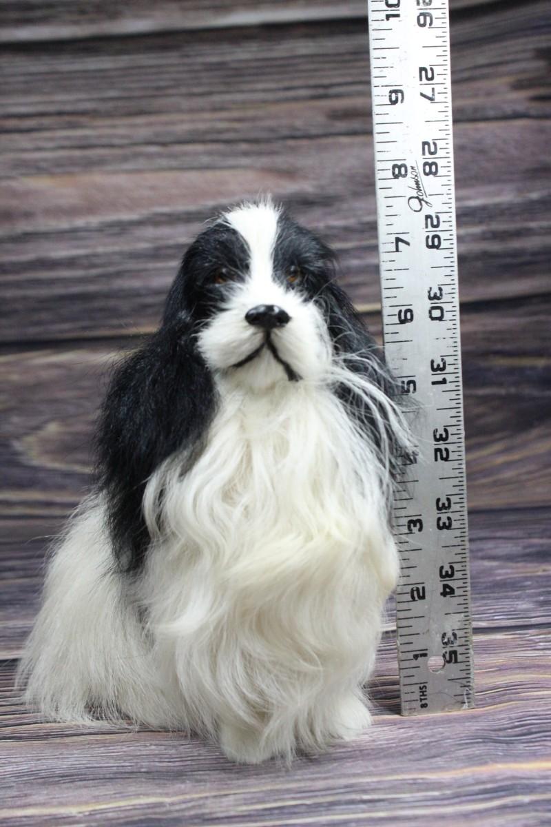 7.5" vintage dog figurine made of goat fur, the fur is in good condition and there is no ripping or tearing.