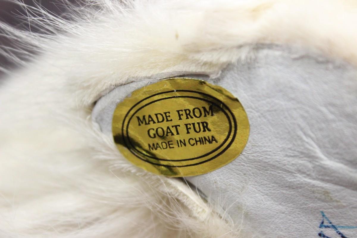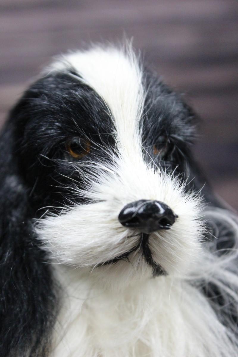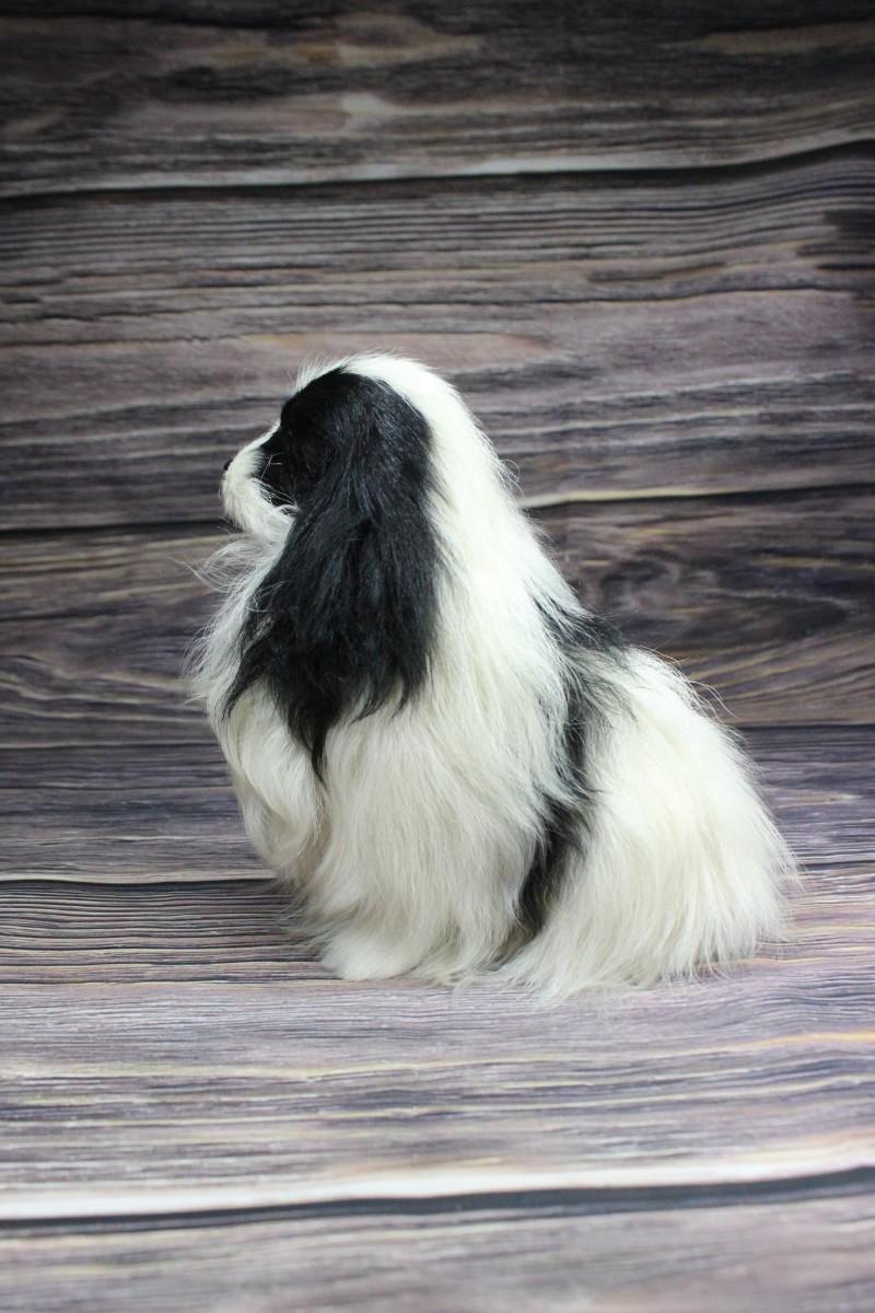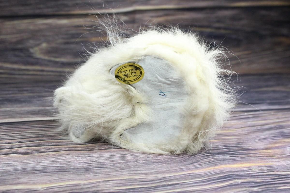 7.5" vintage dog figurine made of goat fur, the fur is in good condition and there is no ripping or tearing.