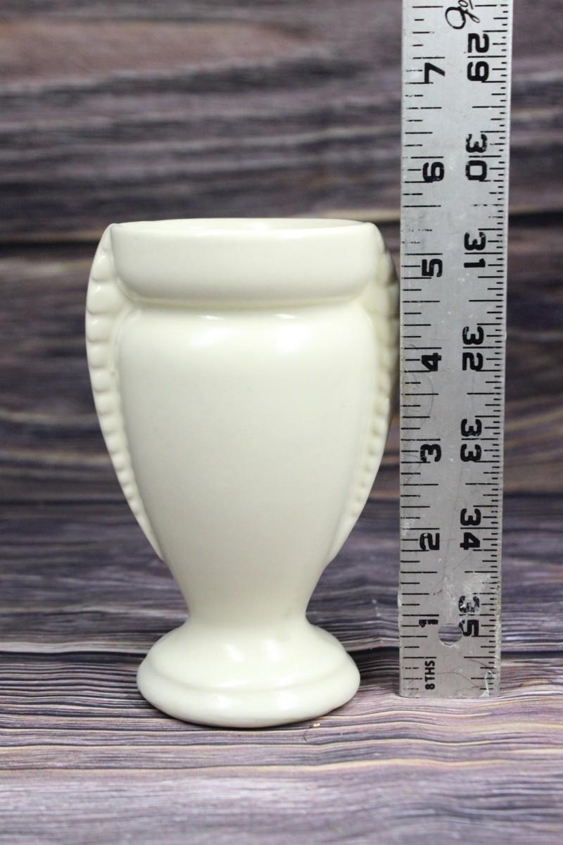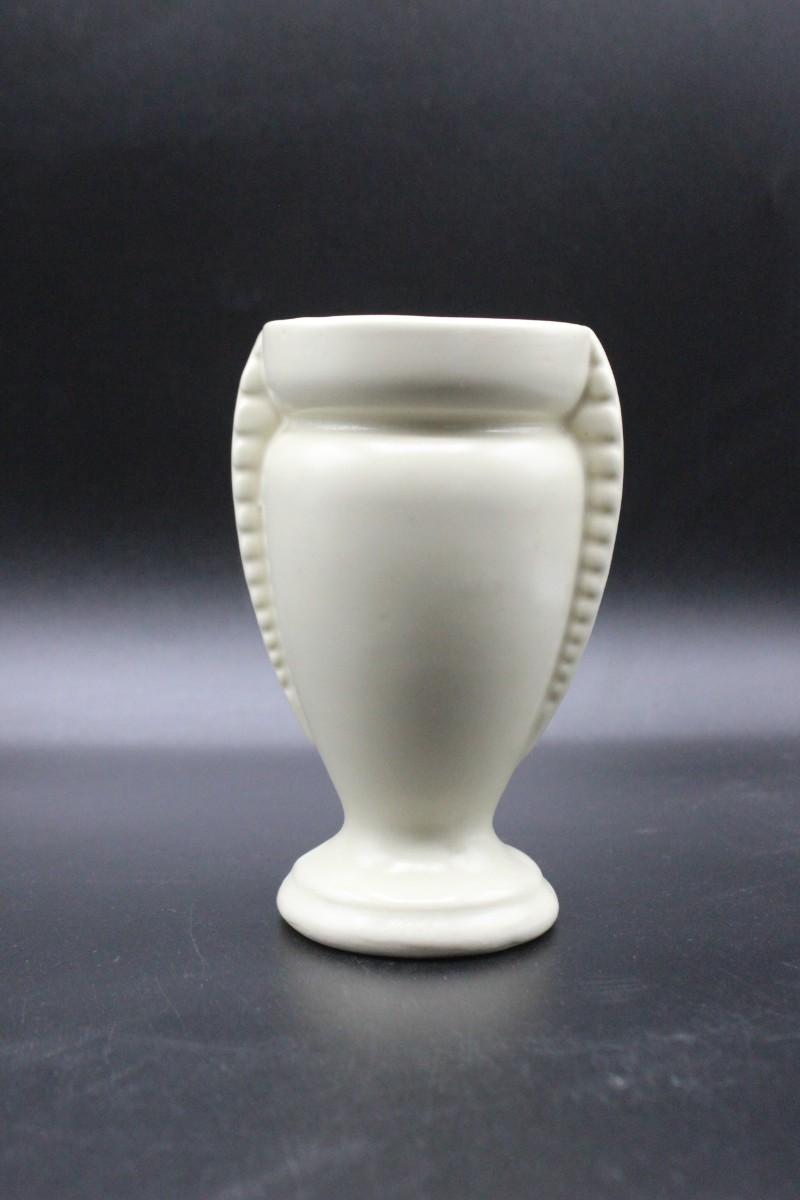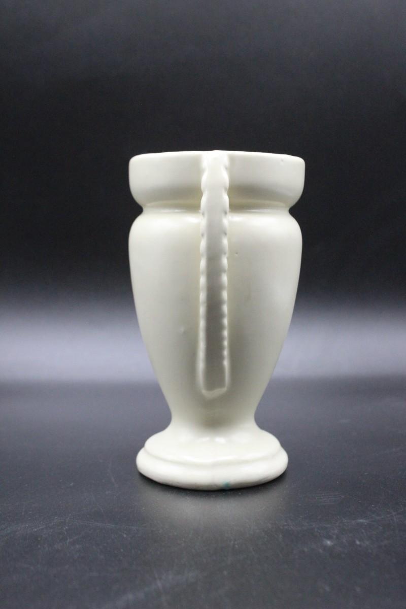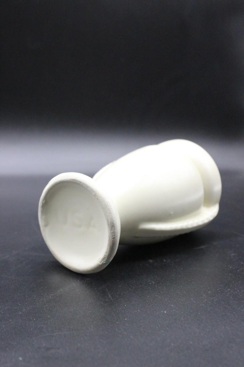 5" vintage made in U.S.A. ceramic white vase. There is no significant chips or cracks to the ceramic and is in good condition.