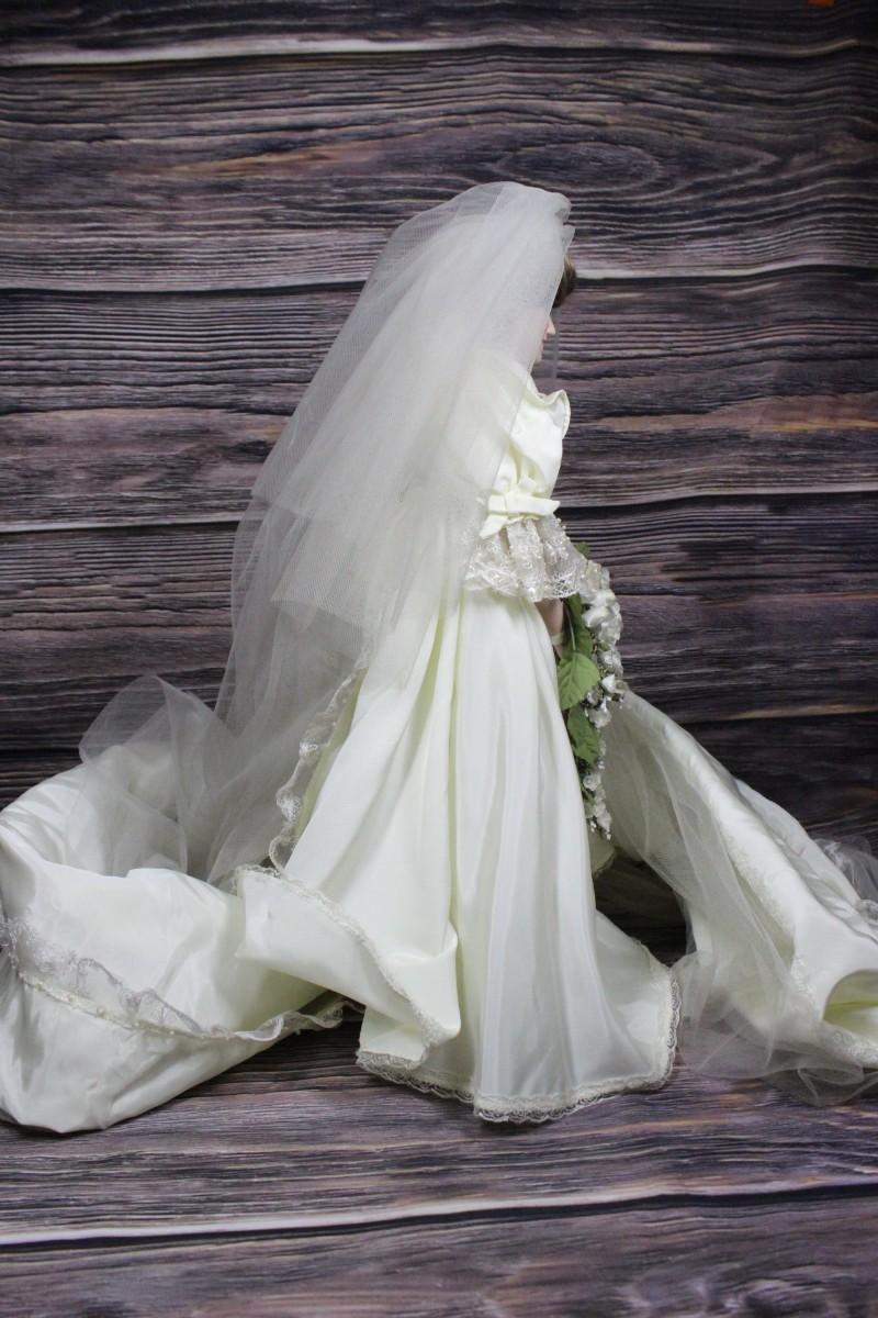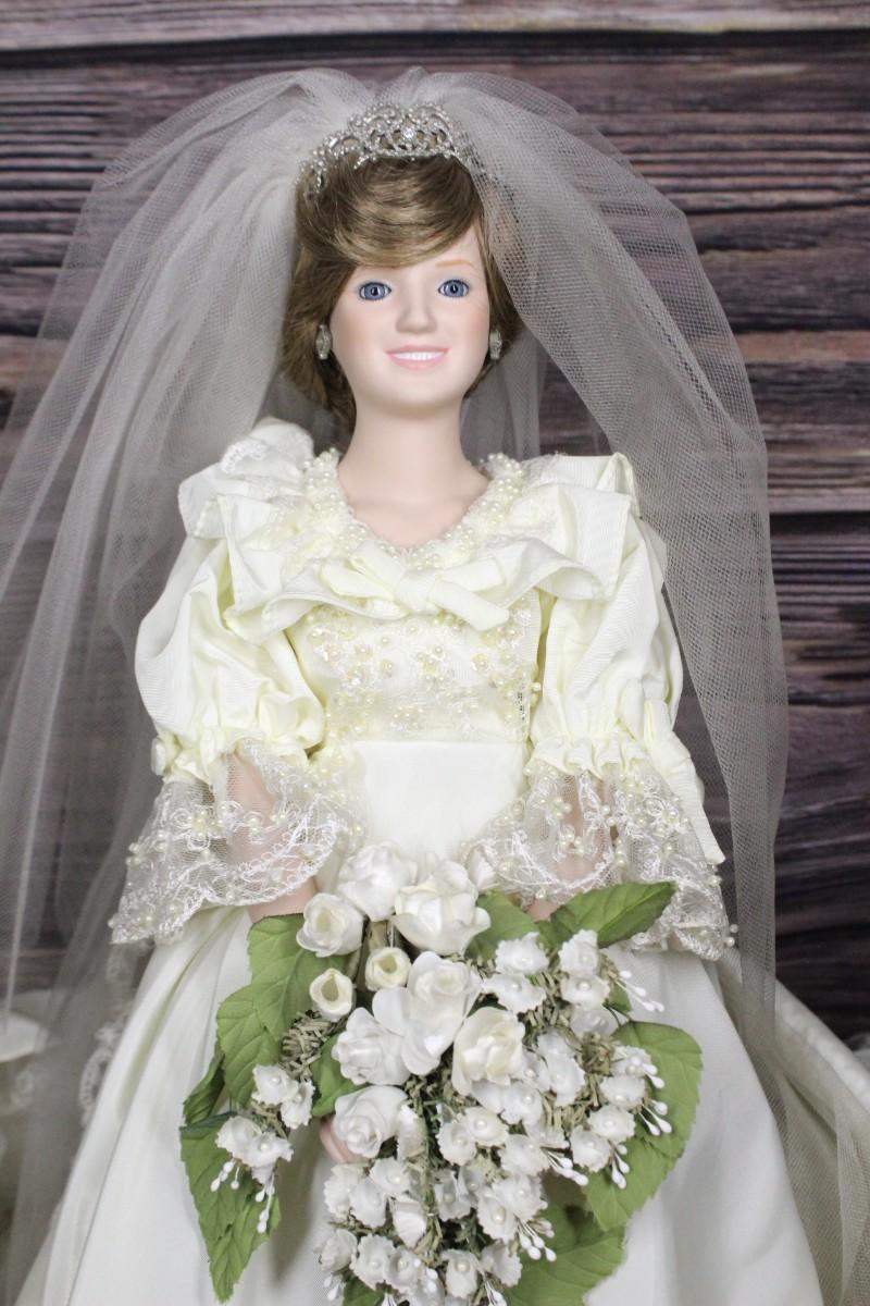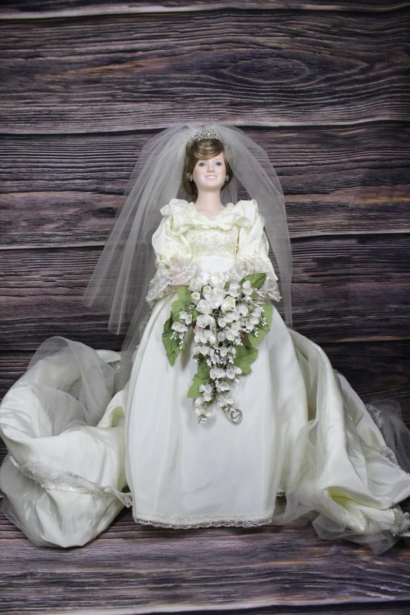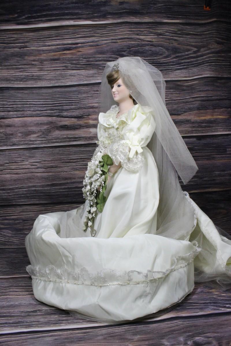 1987 Danbury Mint Princess Diana bride doll. Replica collector doll in her infamous wedding dress including the massively long train. Good displayed condition.