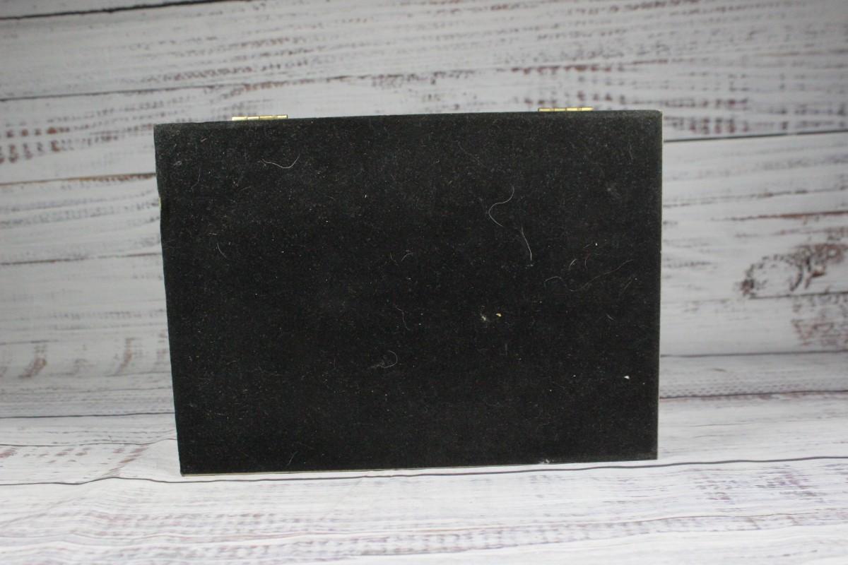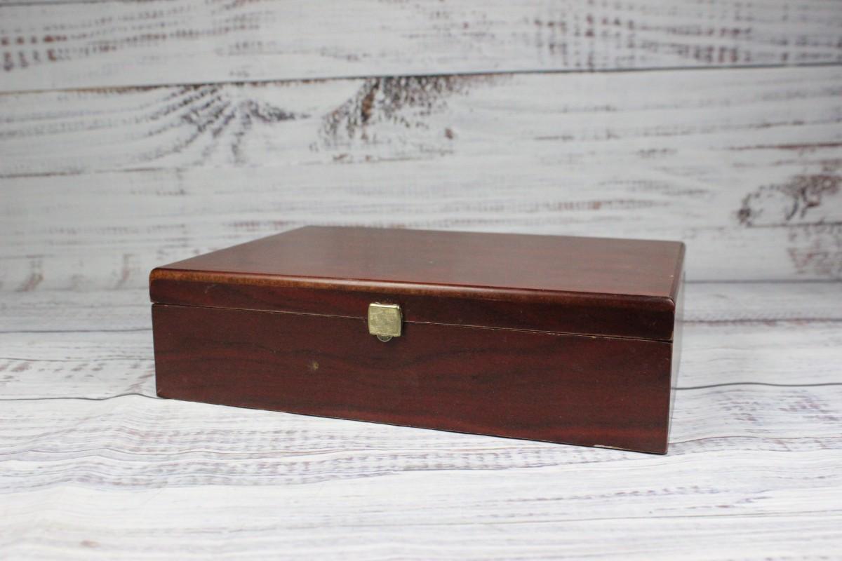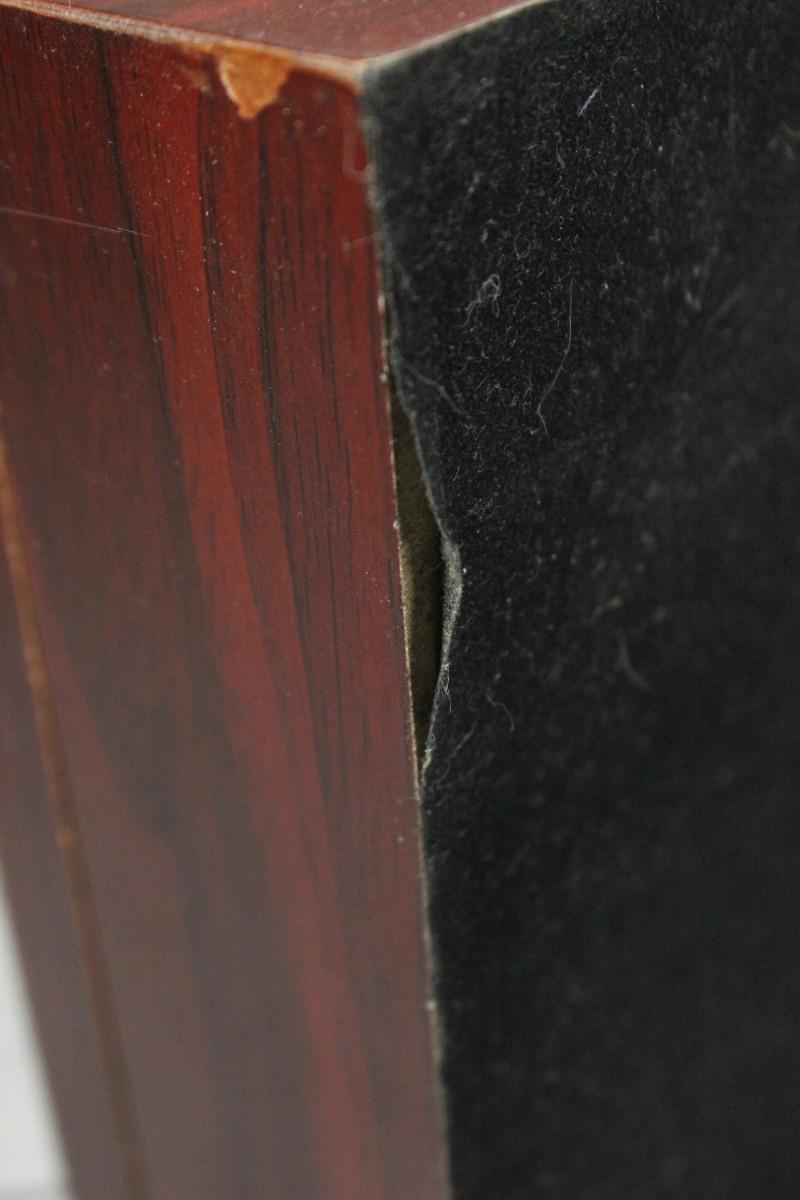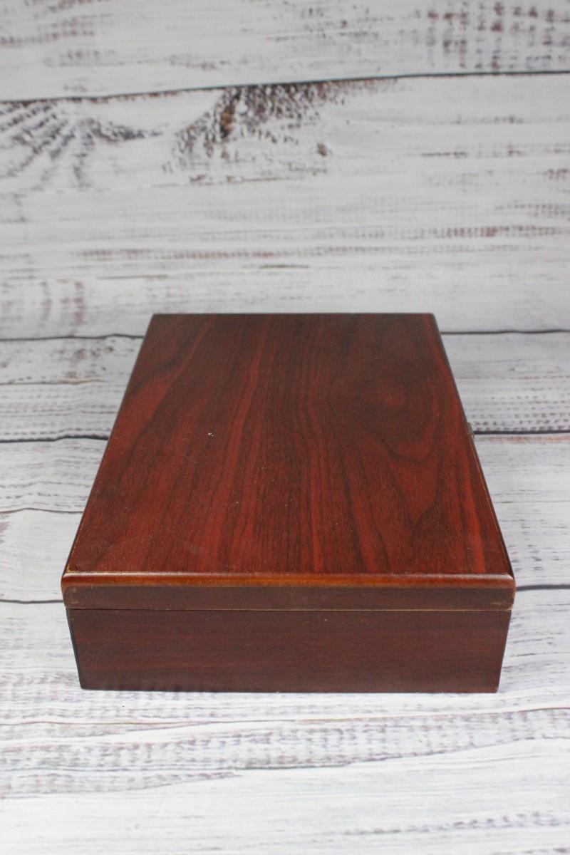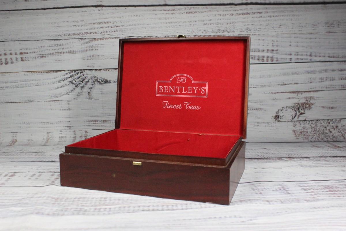 Bentley's Finest Teas wooden tea storage box with red felt interior, there is no significant damage or cracking to the wood. The felt underneath one corner is lifting.