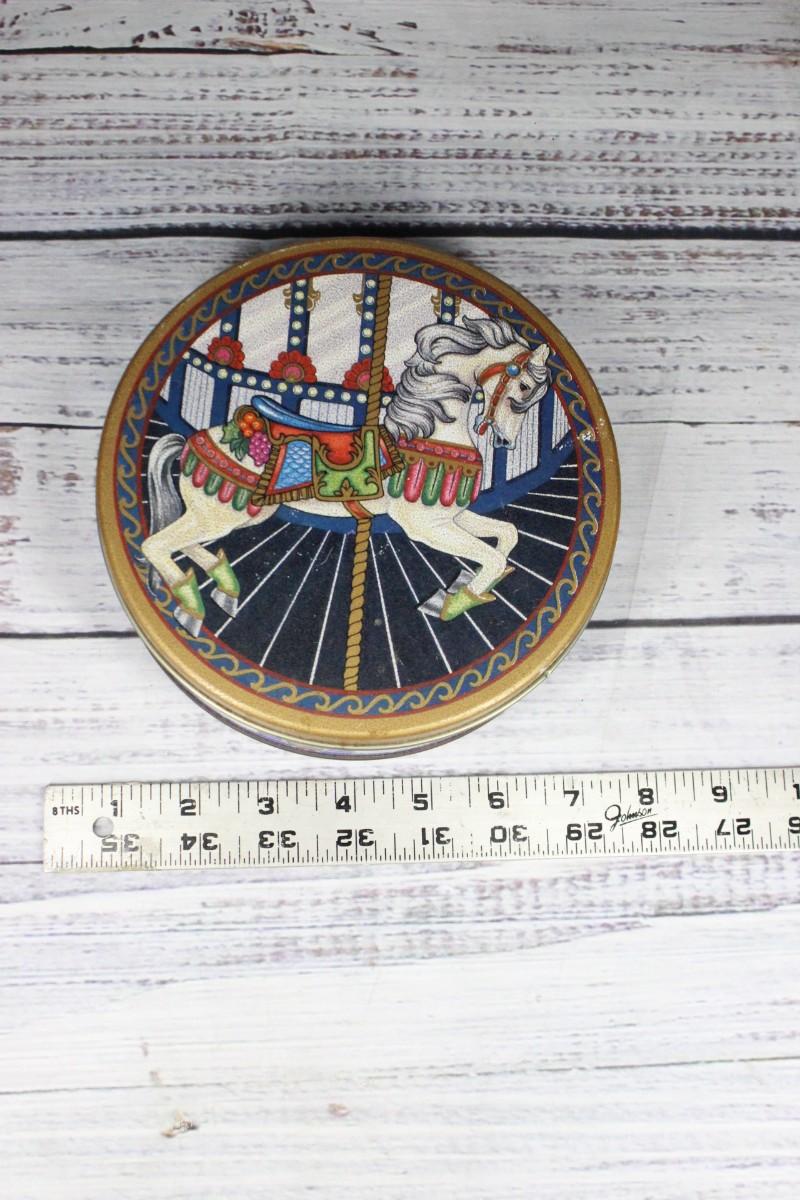 Metal round cookie tin featuring a carousel horse on the lid. Good condition, displays great.