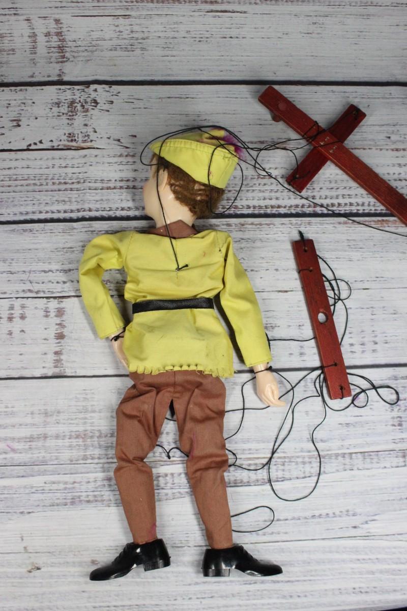 Vintage Hazelle's marionette Robin Hood. Olive and brown costume. Airplane control handle style. Mouth opens and clothes. In marionette is in good vintage condition, strings may be tangled slightly or need repair.