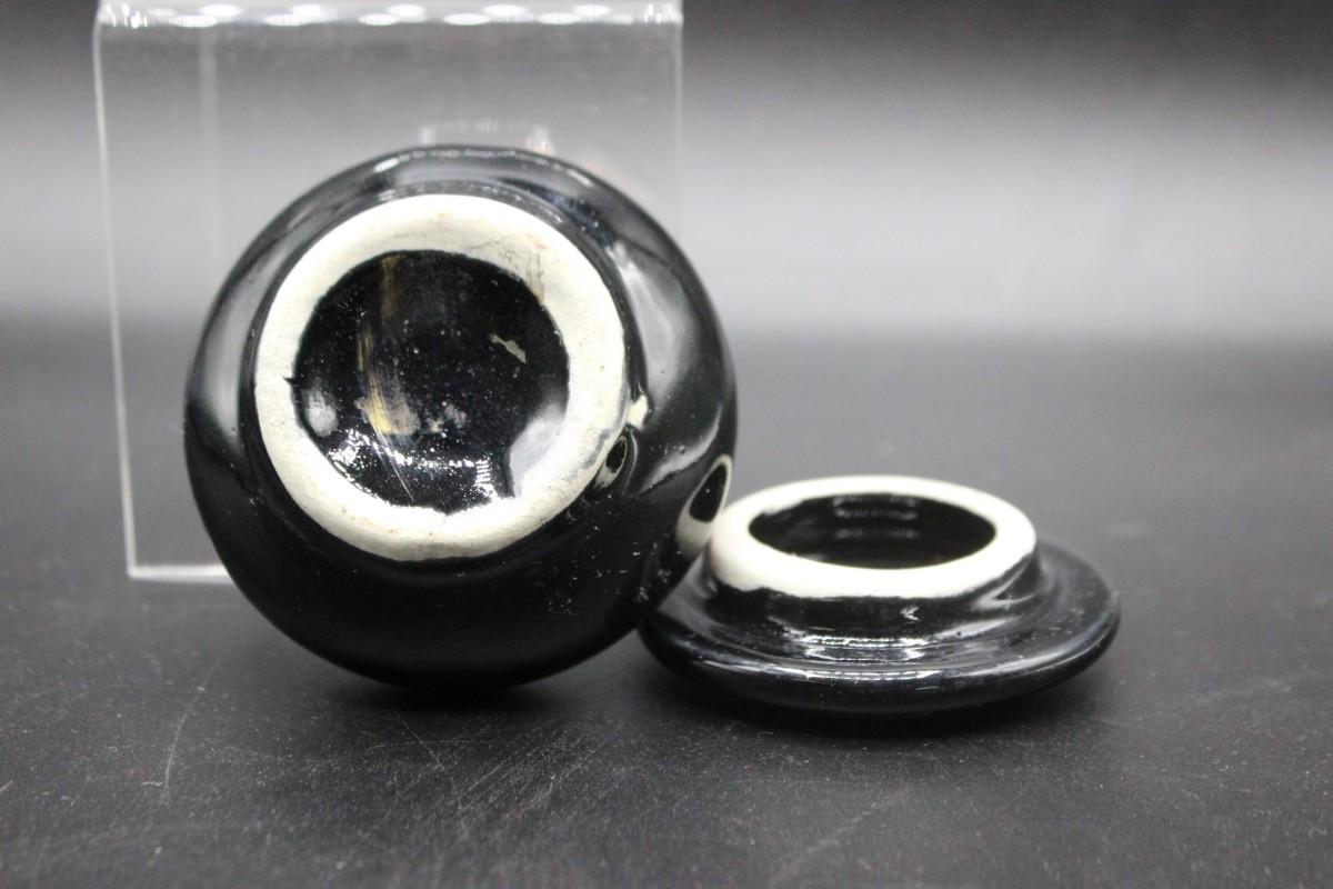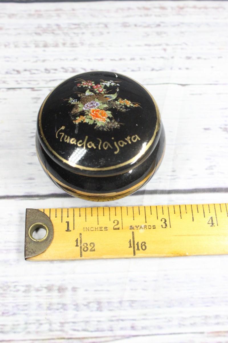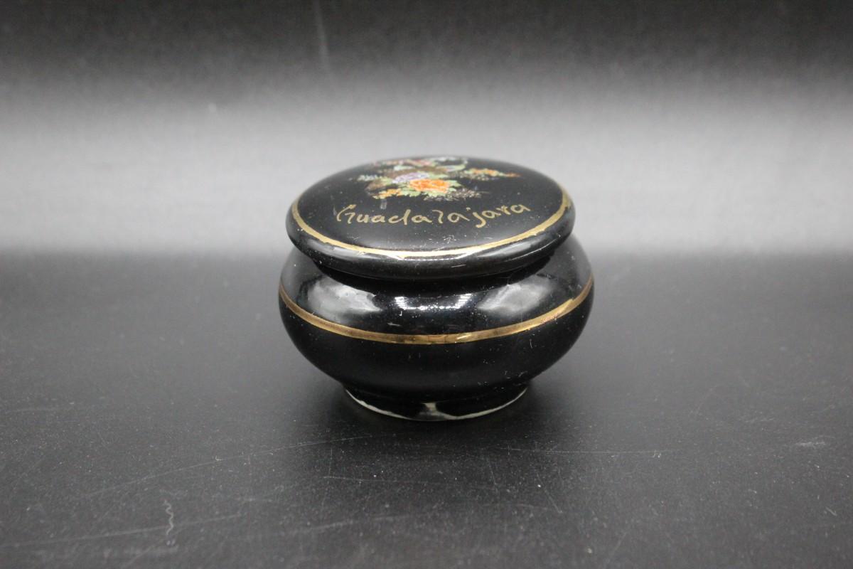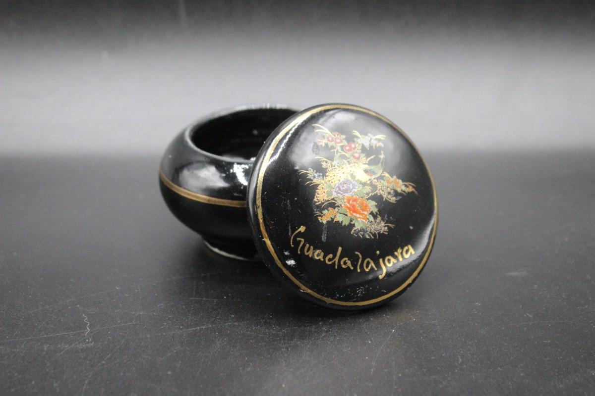 2" vintage made in Guadalajara souvenir vessel adorned with a bouquet of flowers on the lid, the name 'Evelyn' is hand painted on one of the sides of the vessel. There is slight wear to the paint near the base of the vessel, but there is no significant damage.