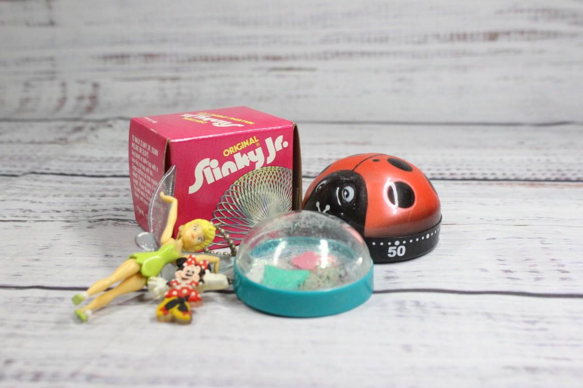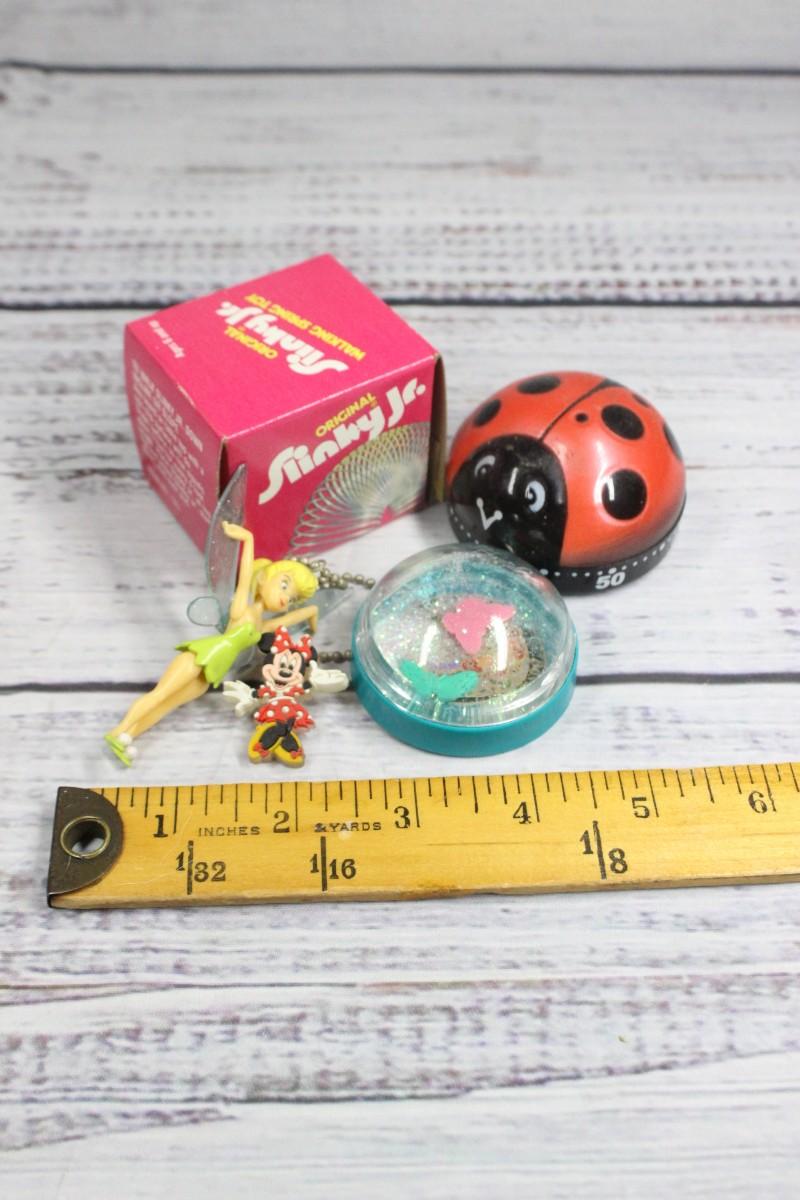 Assorted lot of toys that includes Disney related keychains, an unopened slinky, a glitter globe toy, and a lady bug themed timer. There is no damage to any of the pieces.