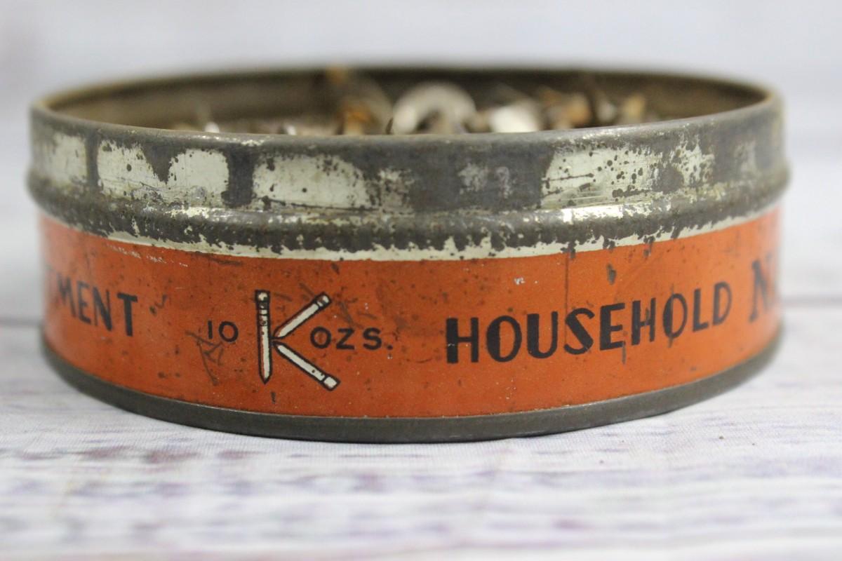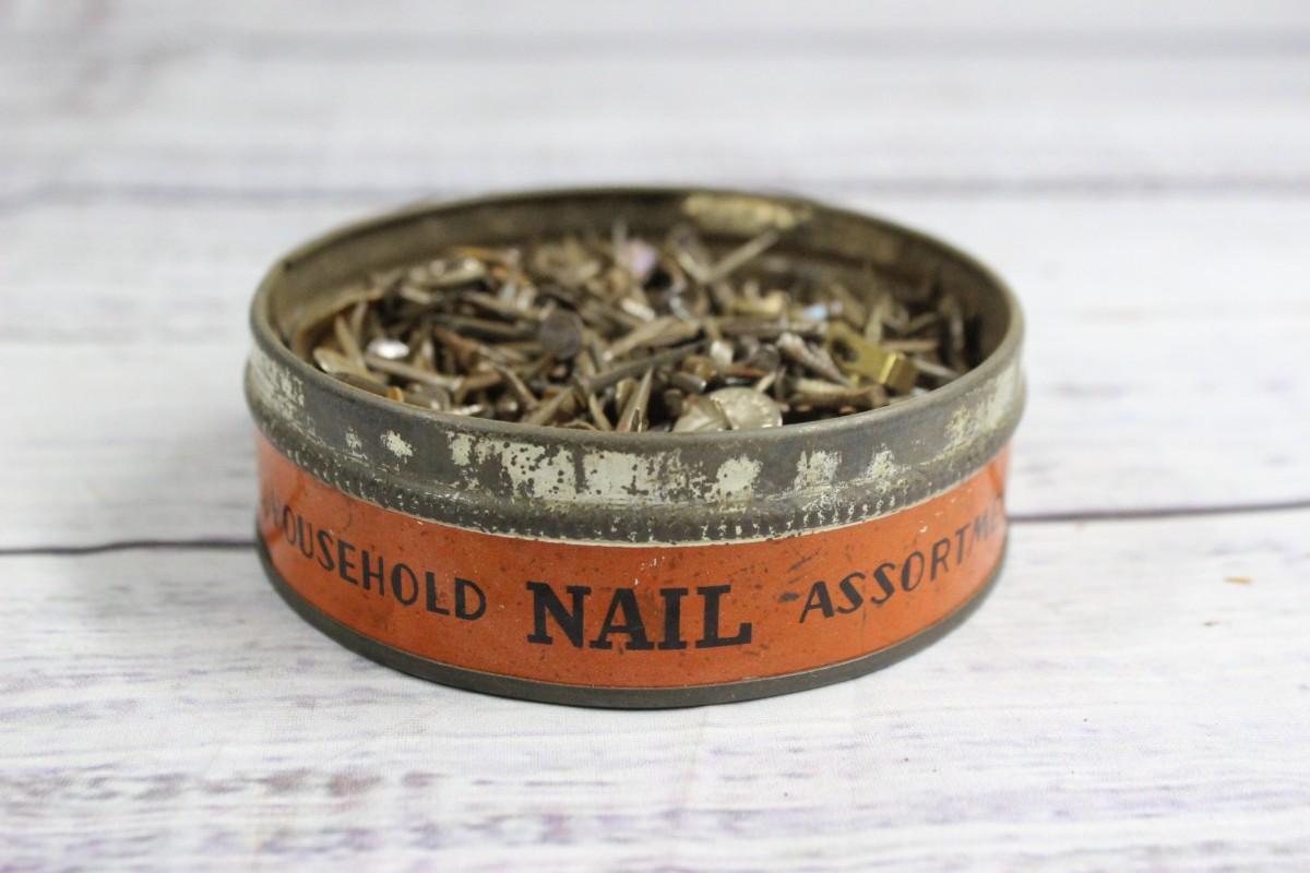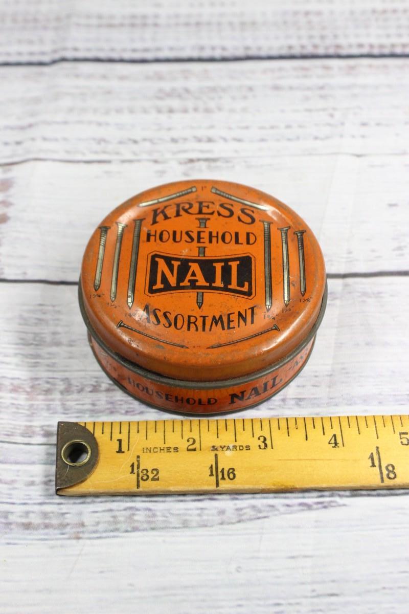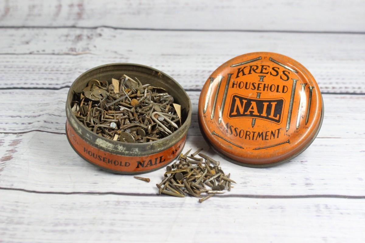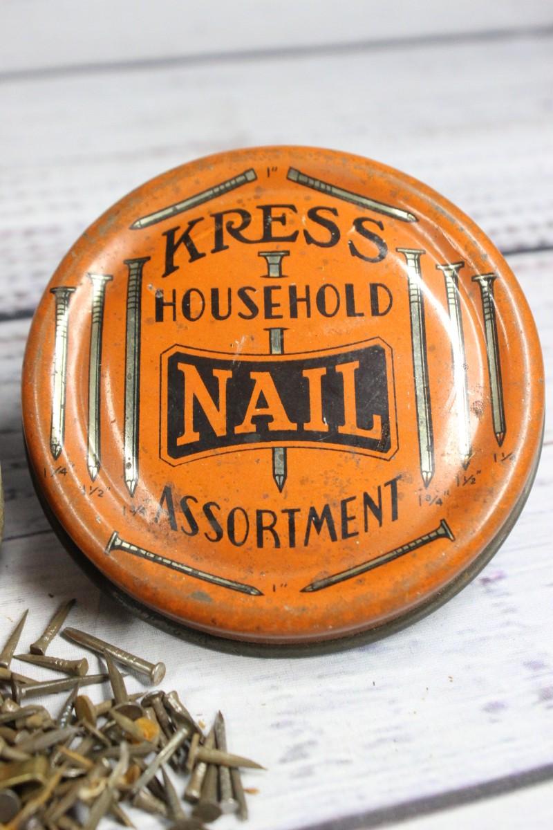 Antique Kress Household Nail Assortment tin with various sized nails included. There is some natural wear on the tin, but the graphics and color is still vibrant.