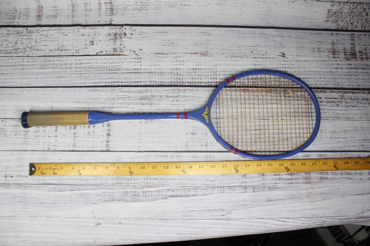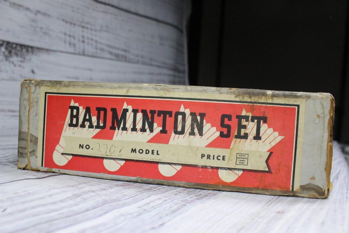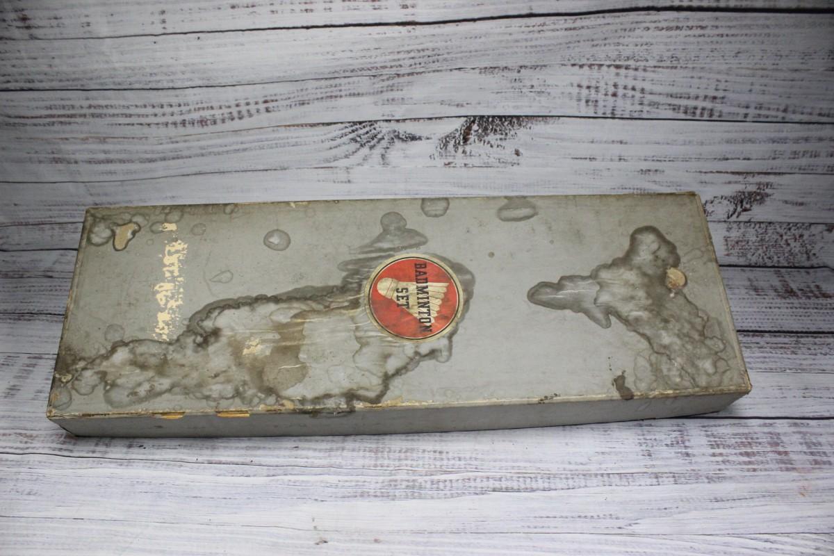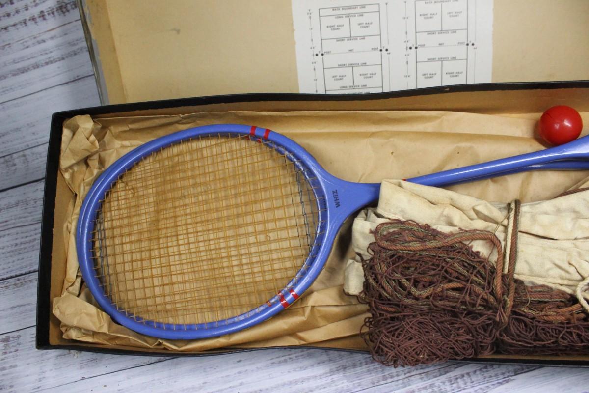Vintage Whiz badminton set model #2708, includes two rackets, the original net, three birdies, and a red ball. There is some wear on the box and is very fragile. The birdies are also fragile, one is damaged more than the rest. The rackets and net do not have any significant damage to them.