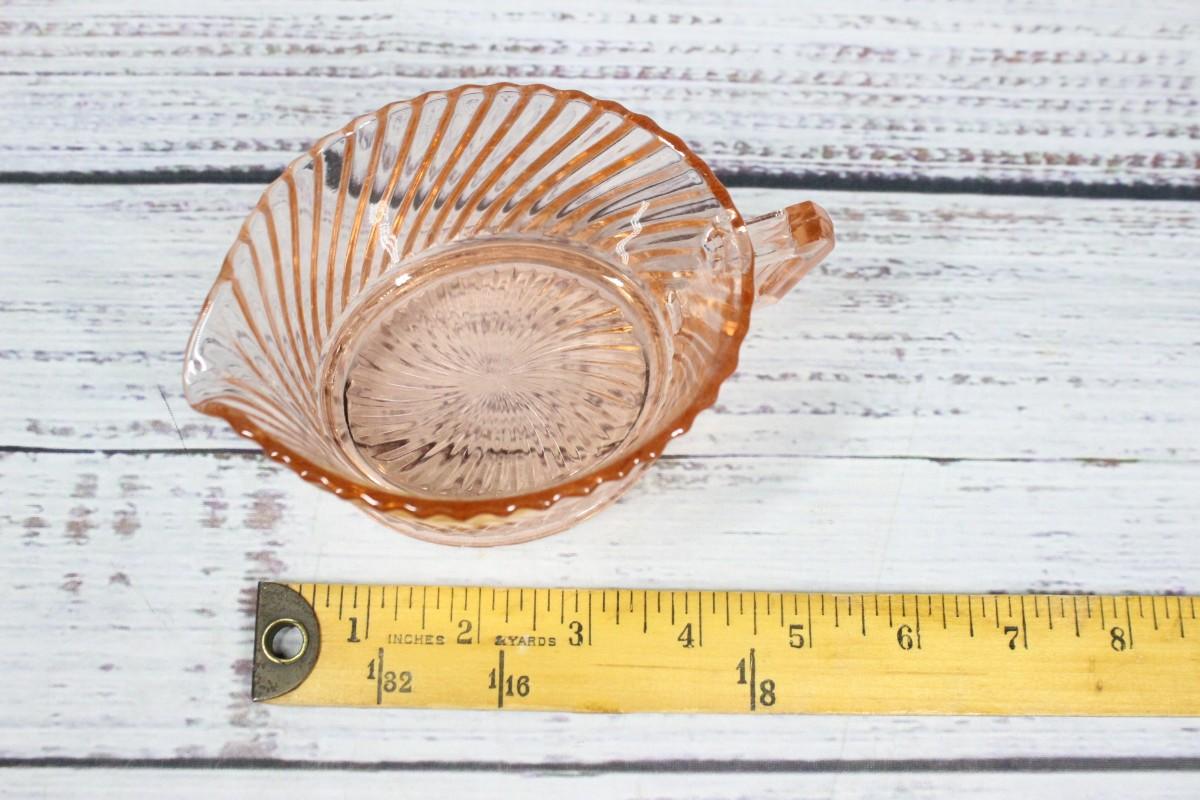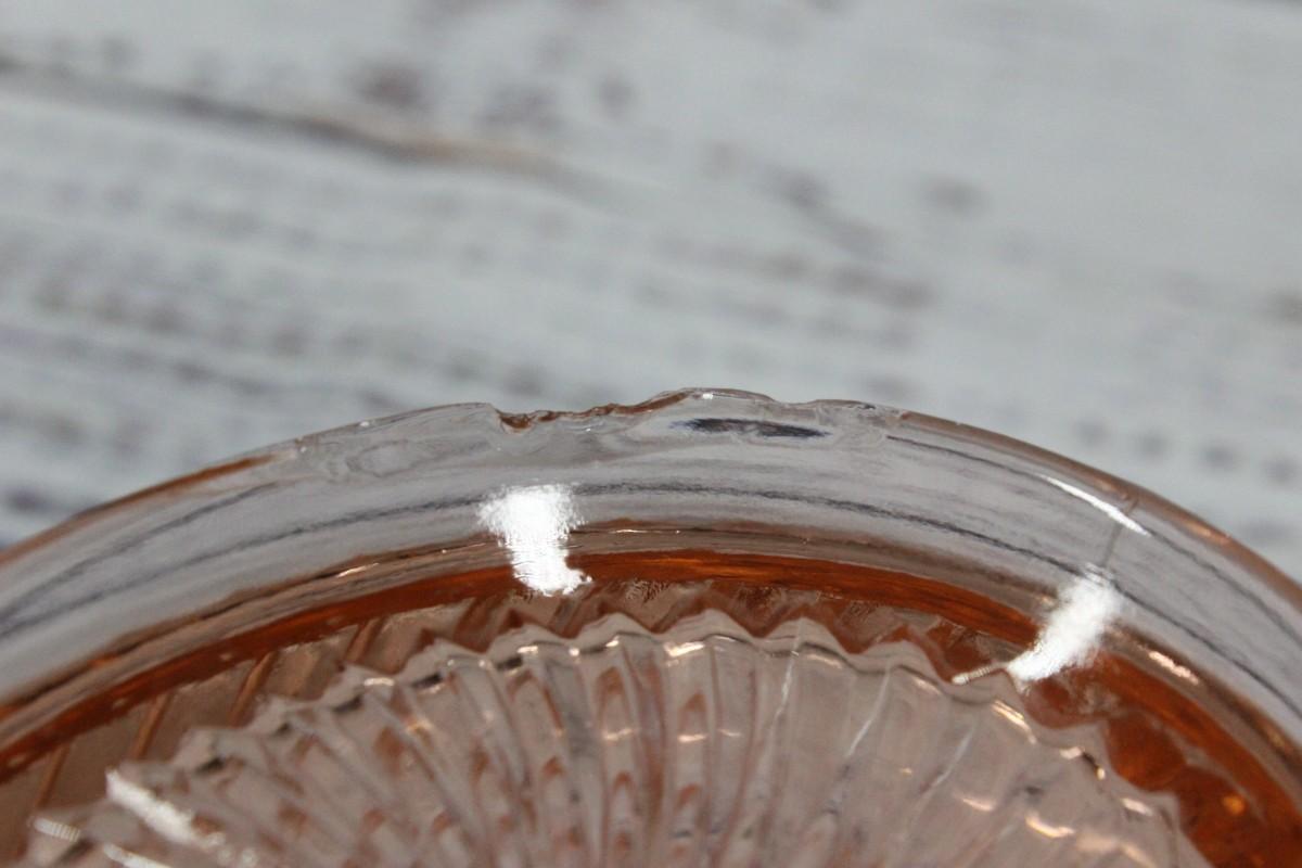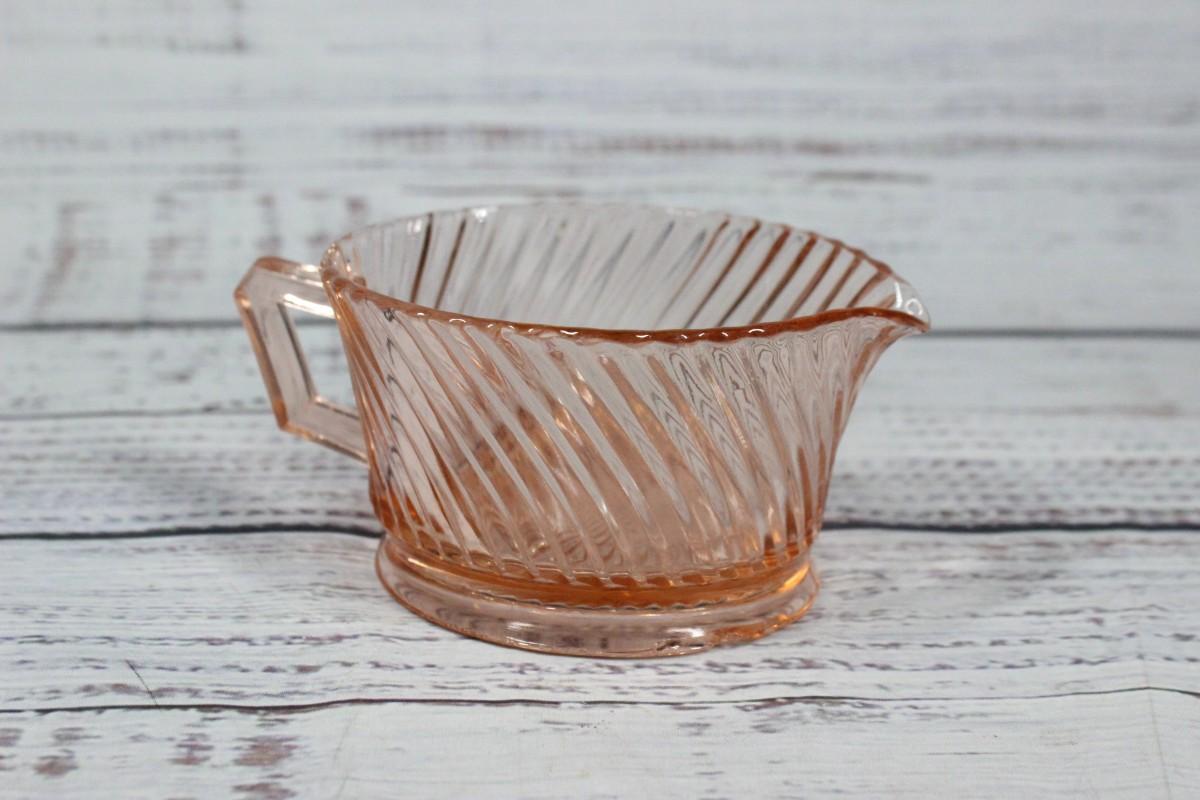Vintage Fortecrisa translucent pink swirl Depression Glass dishware set, there is no significant scratches or chips to the dishes. There is some chipping on the base of the small pitcher, see picture above for more details. The set comes with 6 large dishes, 4 bowls, 4 medium plates. 3 small plates, and a small serving pitcher.