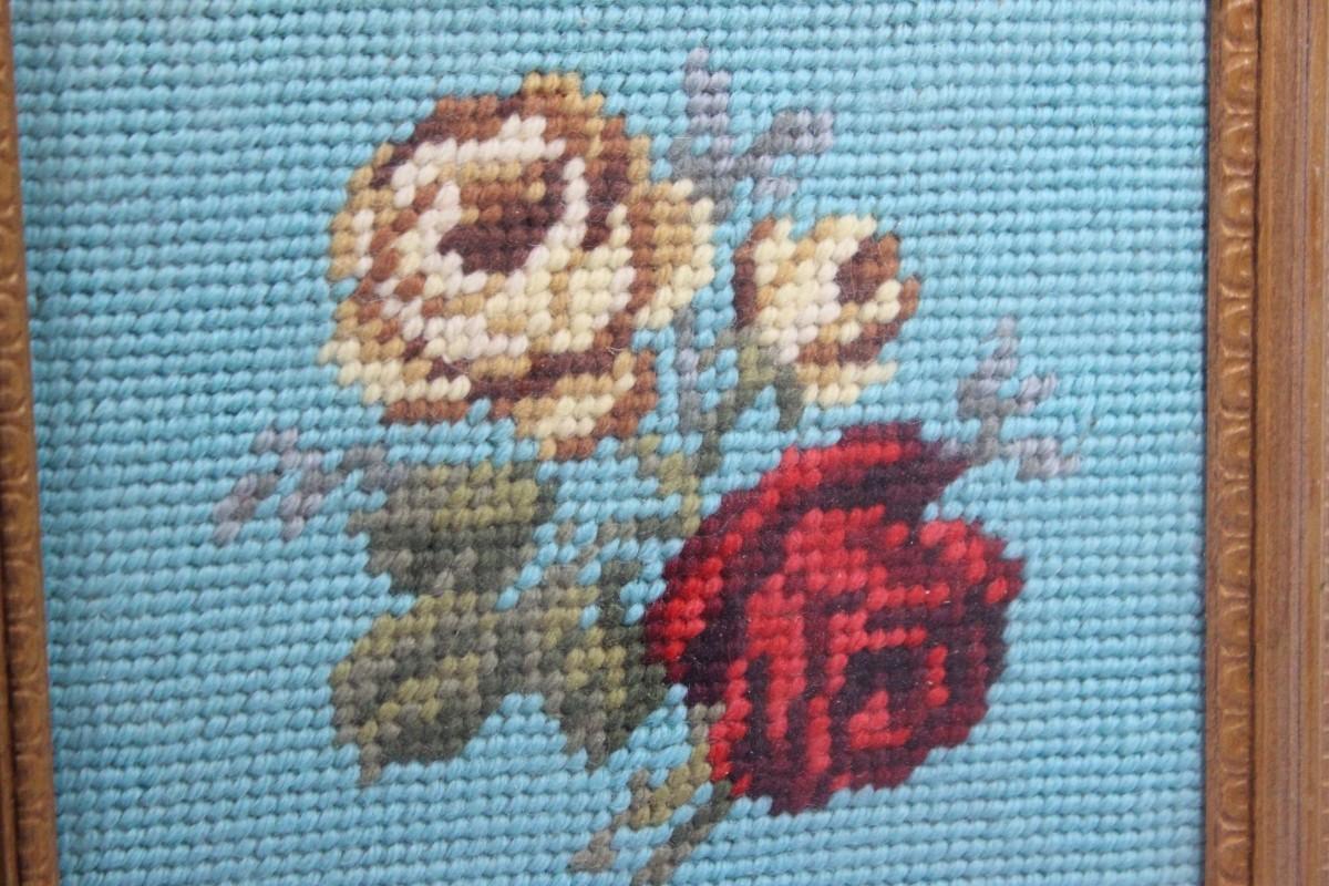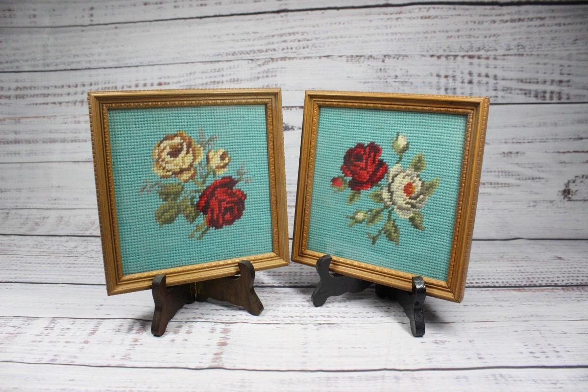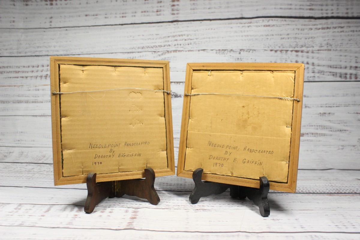 Vintage handcrafted framed needlepoint of roses on a blue background, there is no significant damage to the frames or the material underneath the protective plastic that covers it. The back of both canvases reads "Needlepoint Handcrafted by Dorothy E. Griffin 1970."