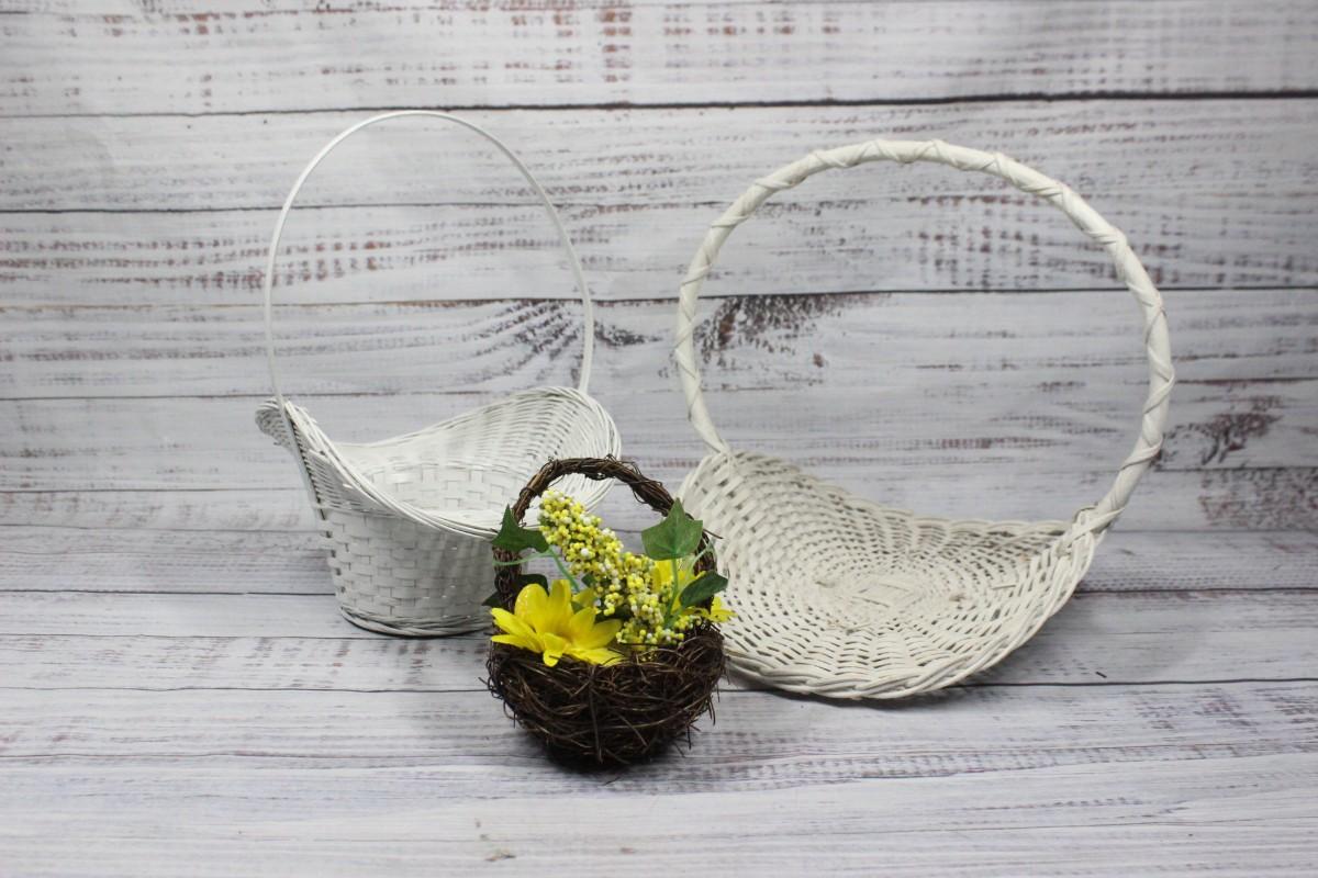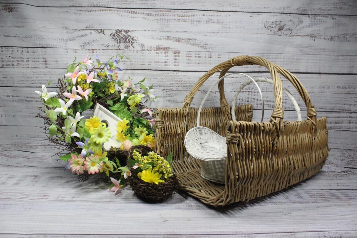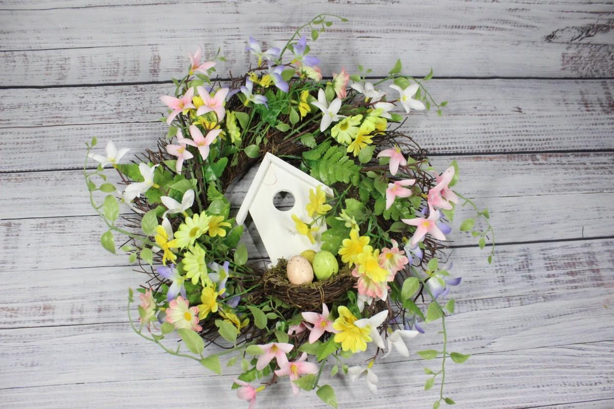 Easter decor lot that includes a birdhouse reef and 4 various sized baskets. See pictures for reference, there is no significant damage to any of the pieces.