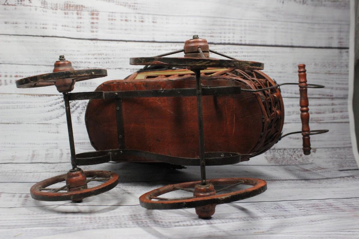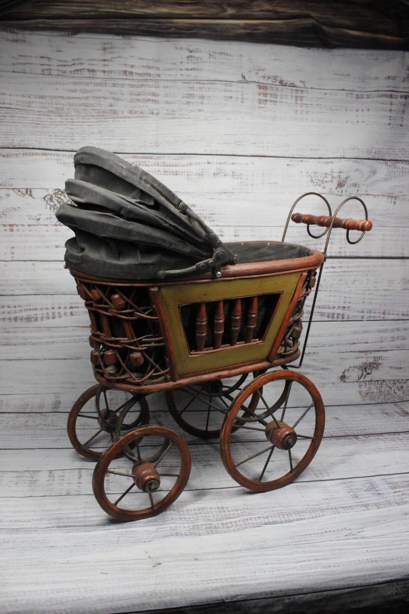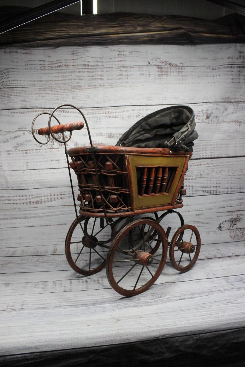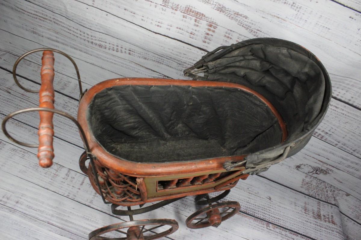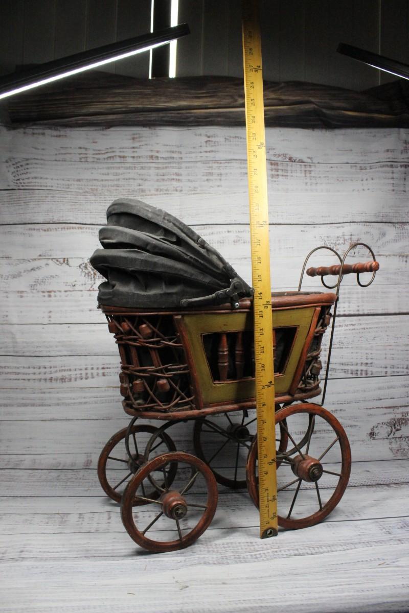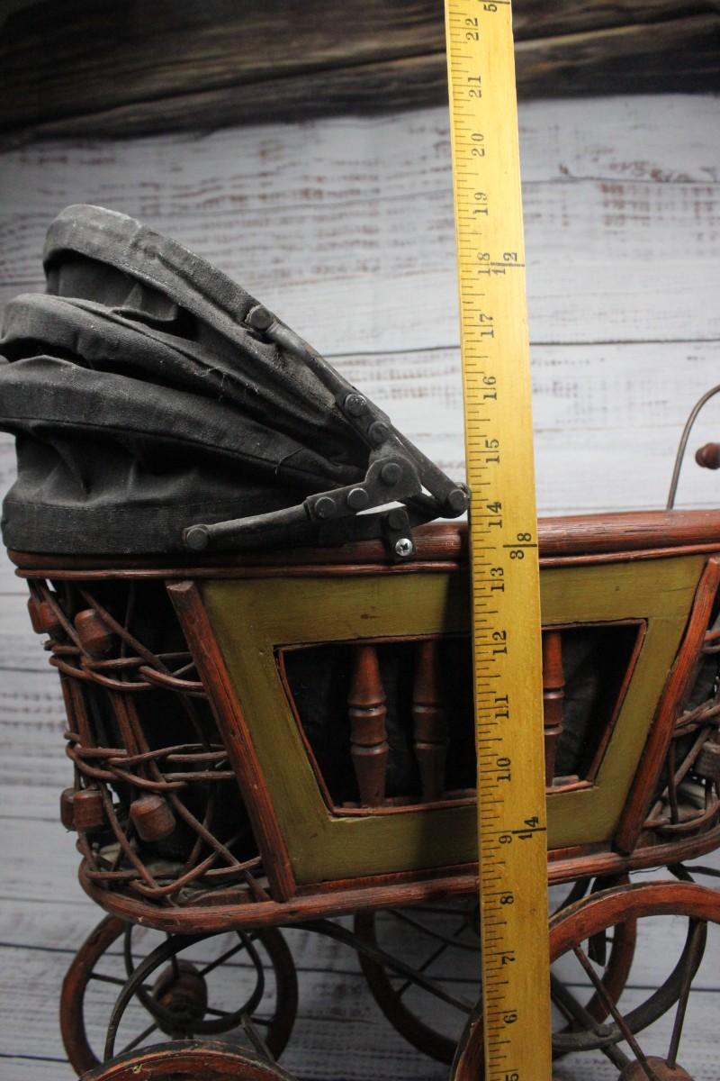 19" antique Victorian style doll stroller, there is no significant damage to the stroller and the wheels rotate fine. The bonnet is a little brittle, but can still be opened and closed.