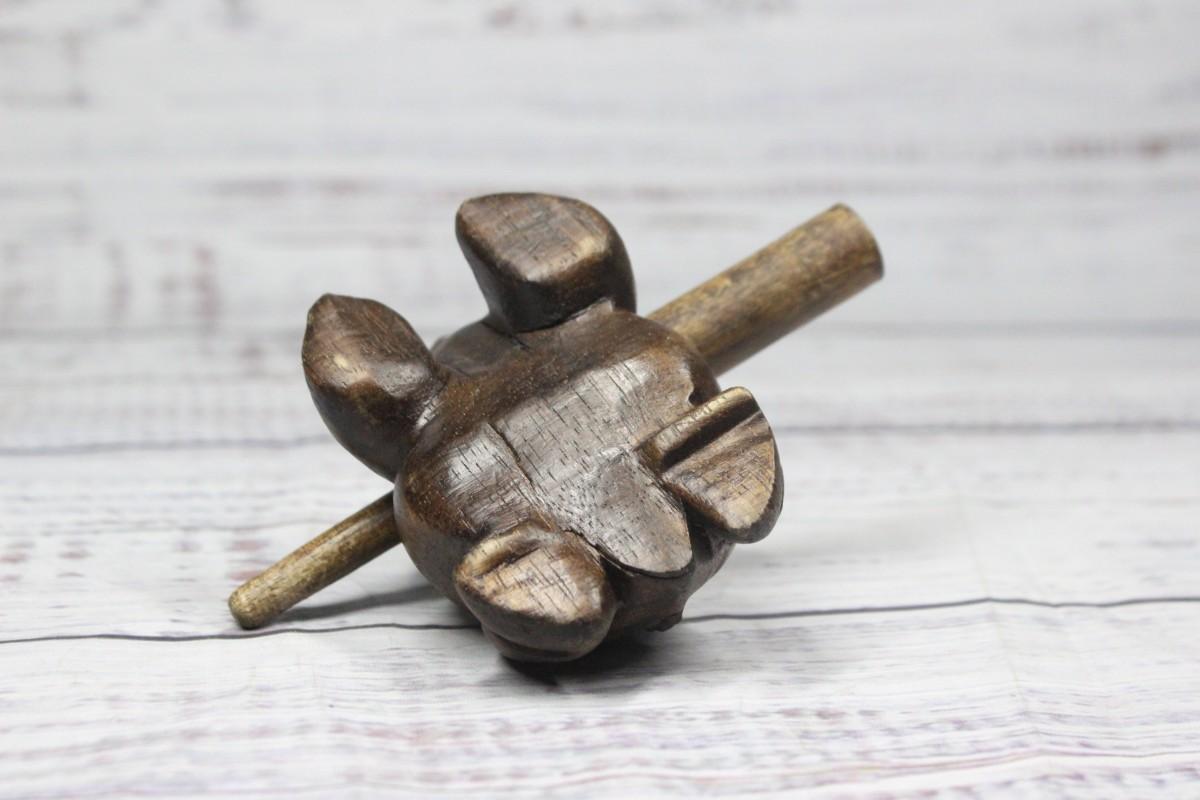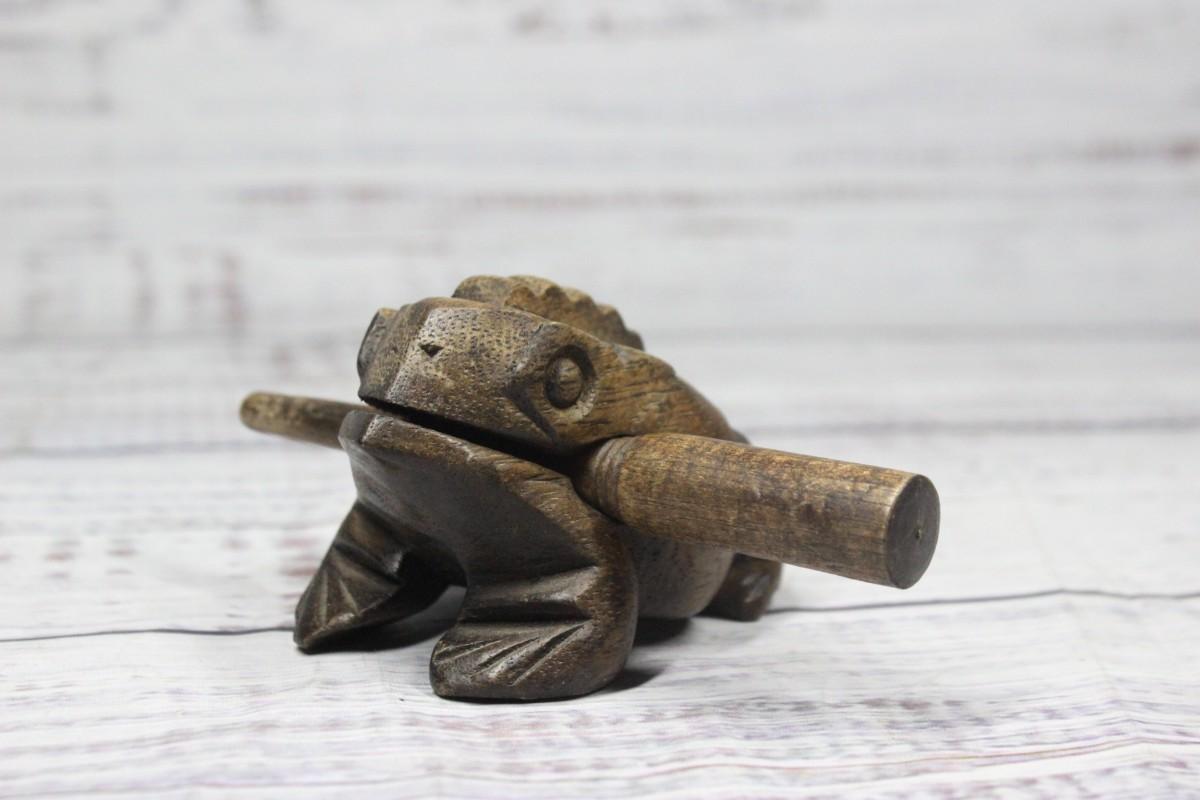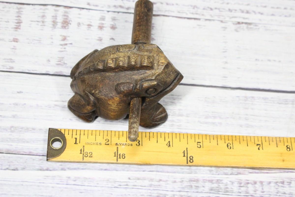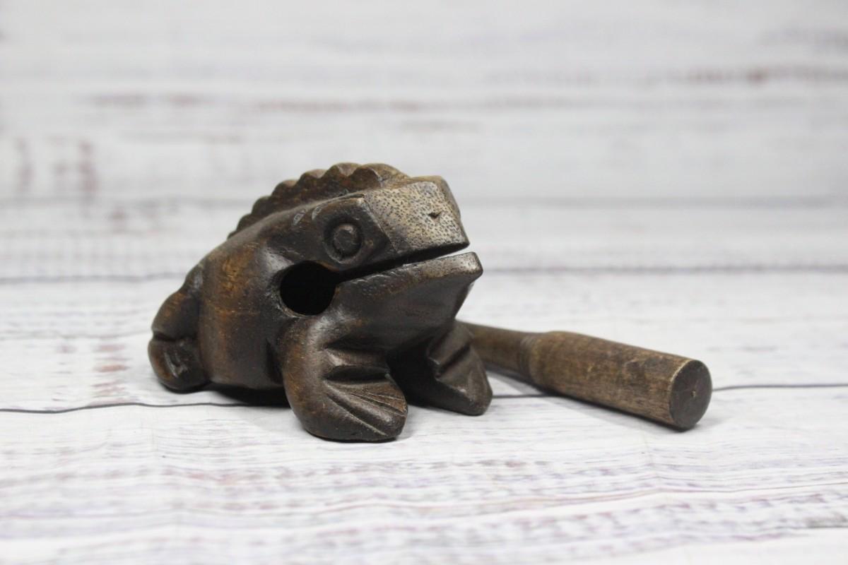 Small wooden instrument that imitates the croaking of a frog, there is no significant cracking or wear to the piece and is in good condition and functions perfectly.