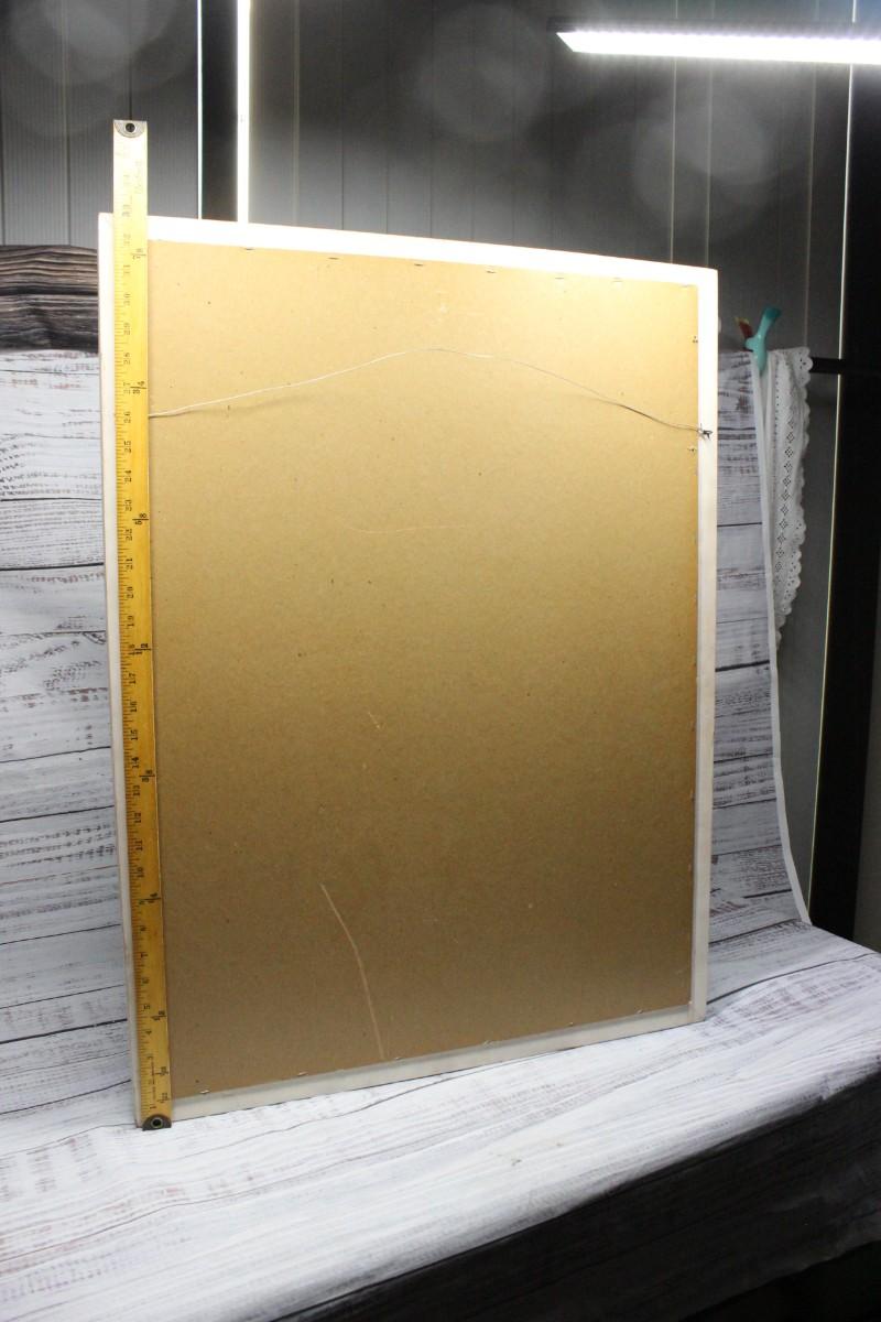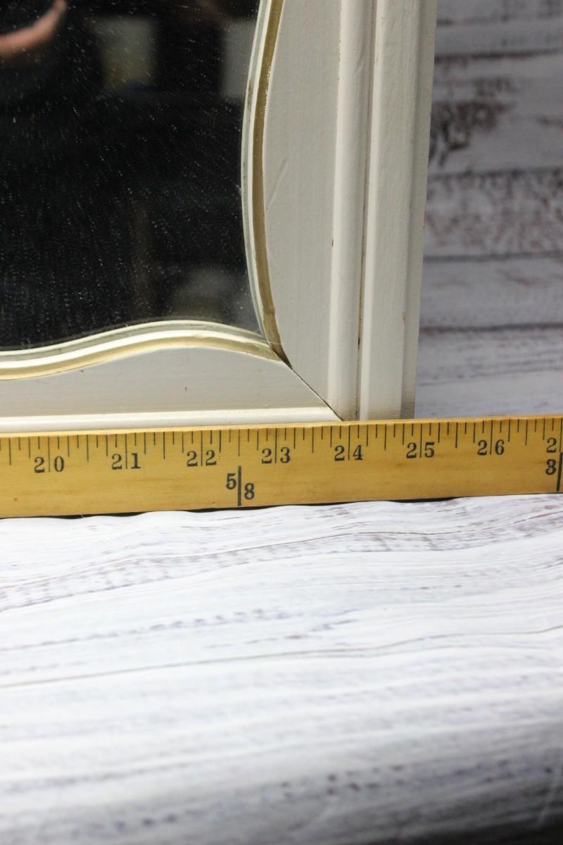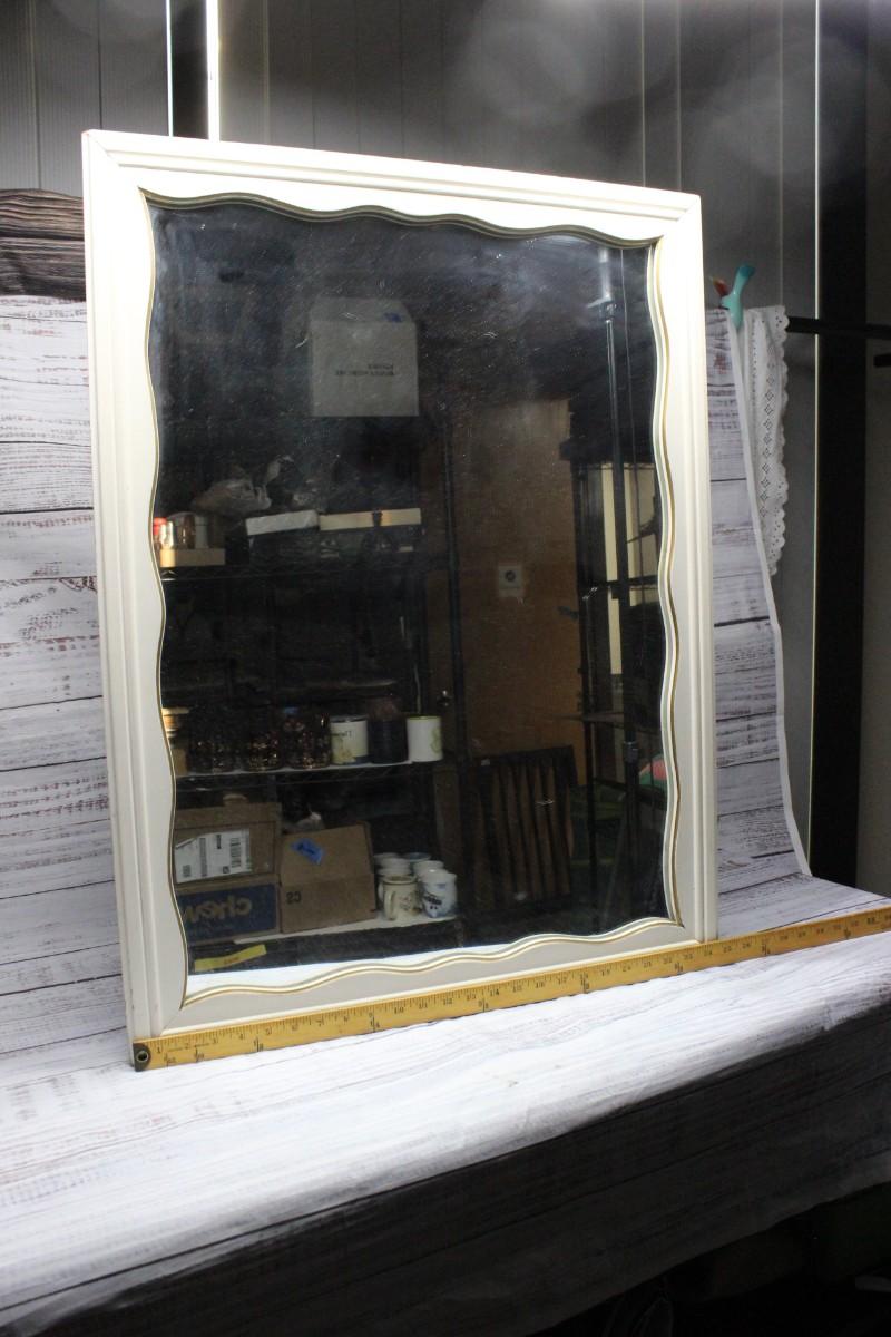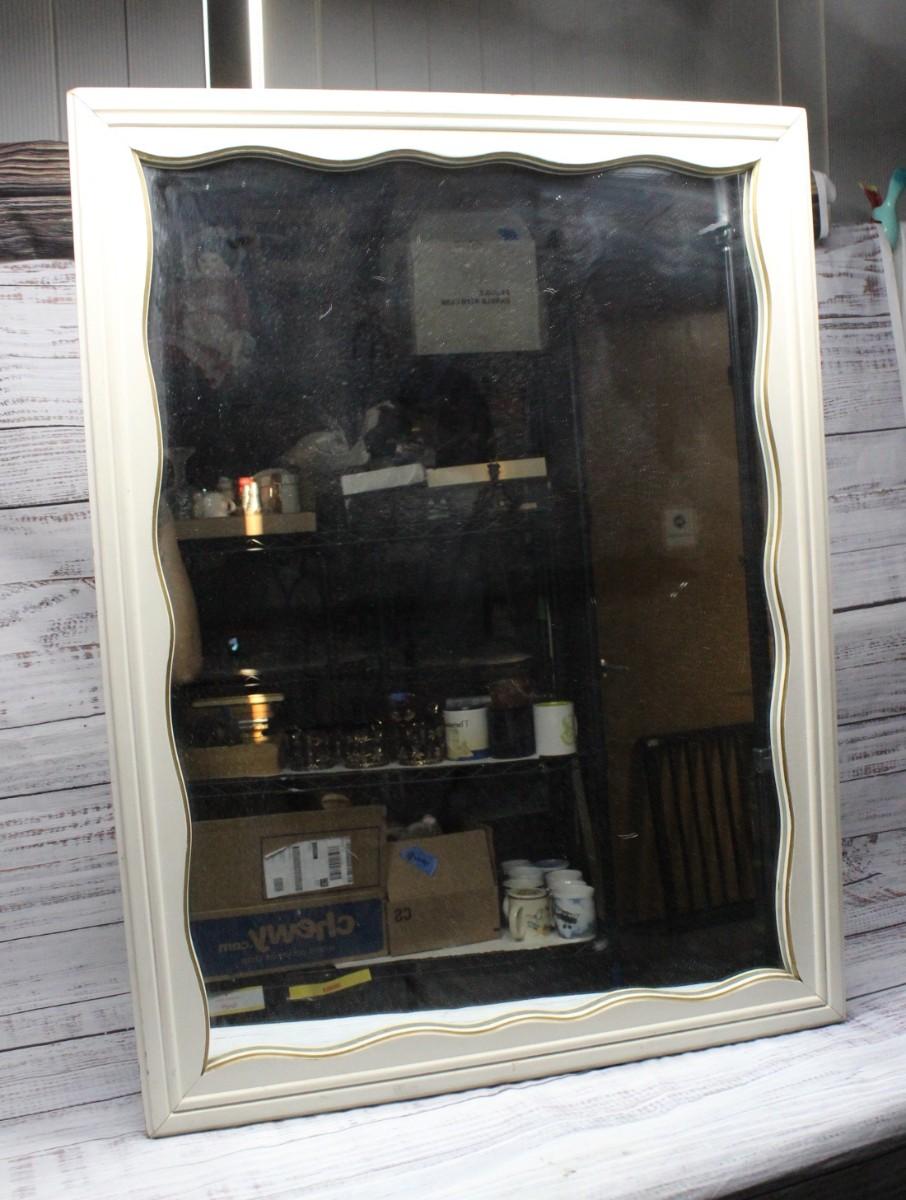 25" x 33" mirror with a white framed border, there is no significant chips or cracks to the mirror or frame