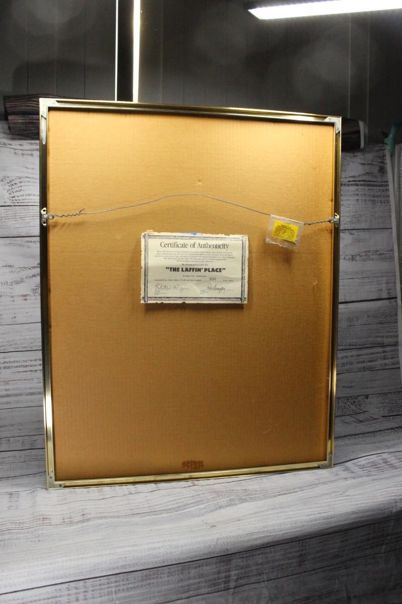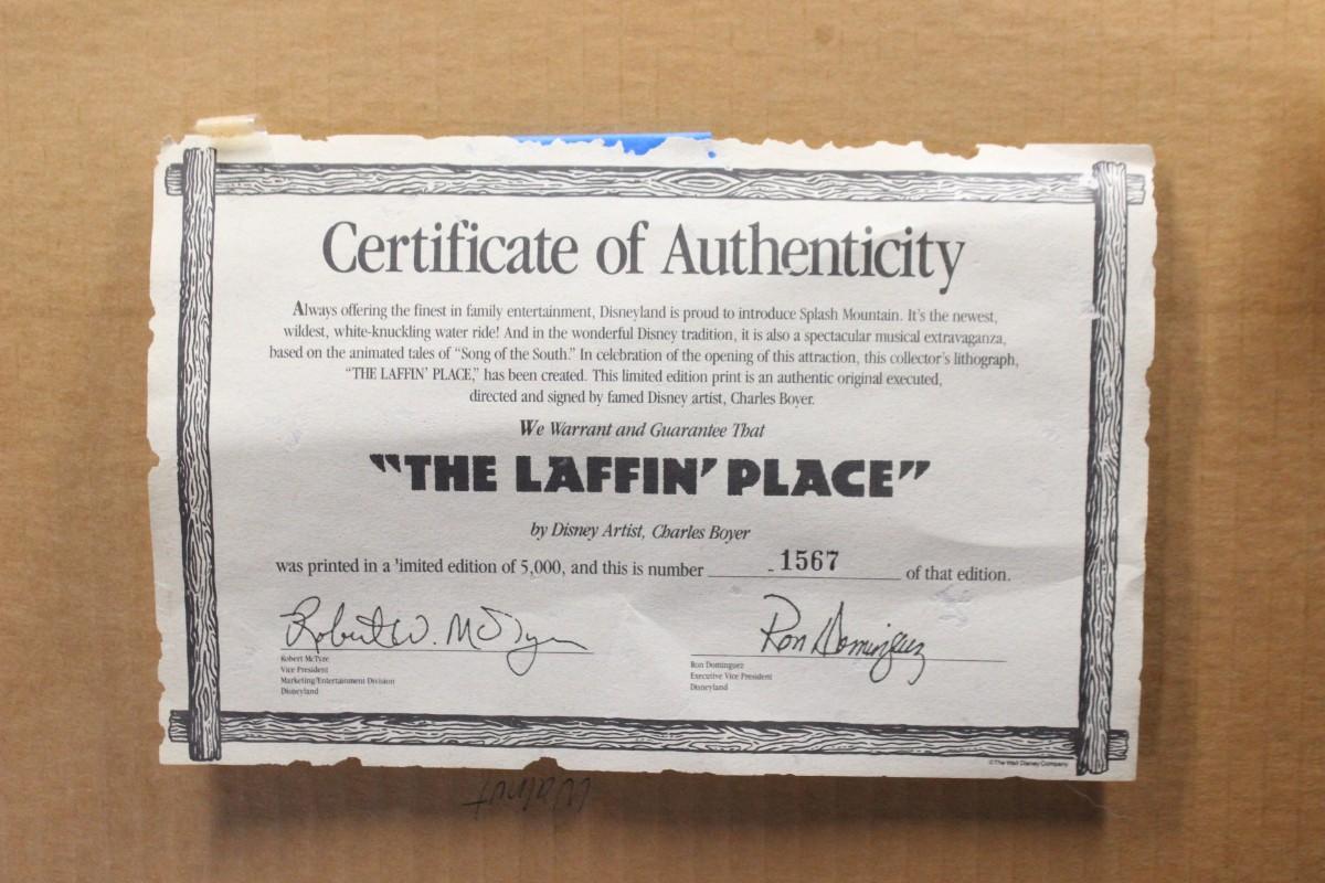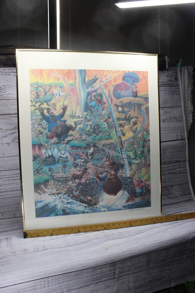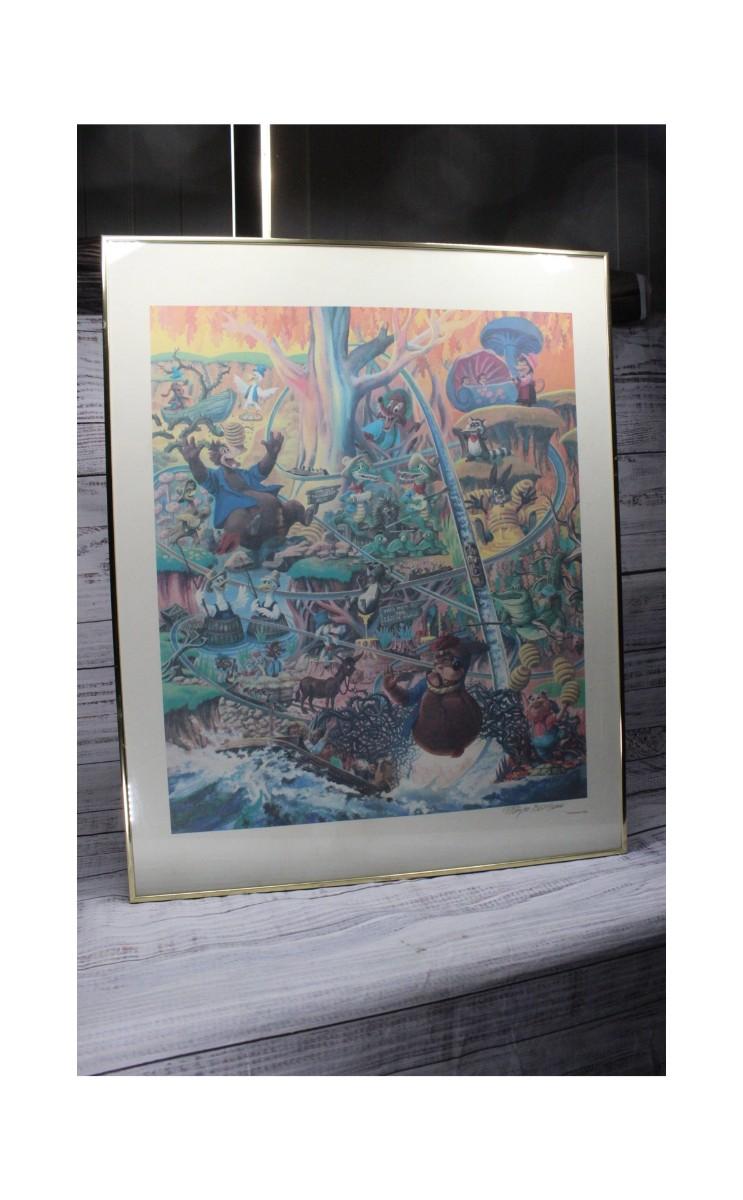 24" x 30" signed and framed Splash Mountain concept art print by Disney artist Charles Boyer. There is no significant chips or cracks to the frame or the protective glass.