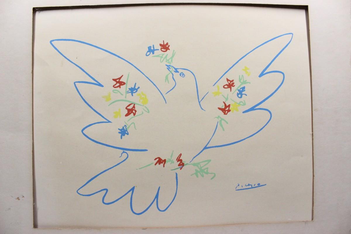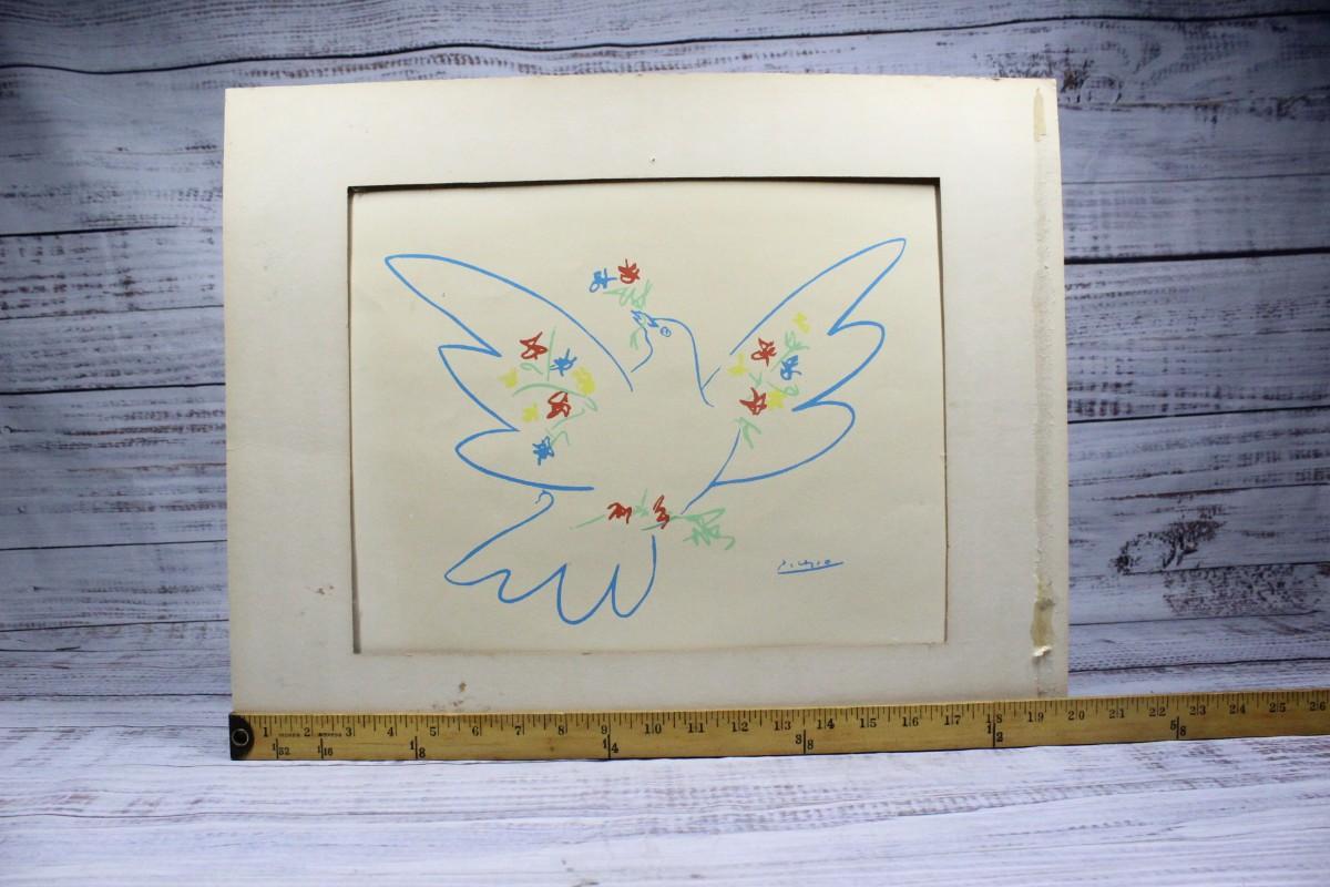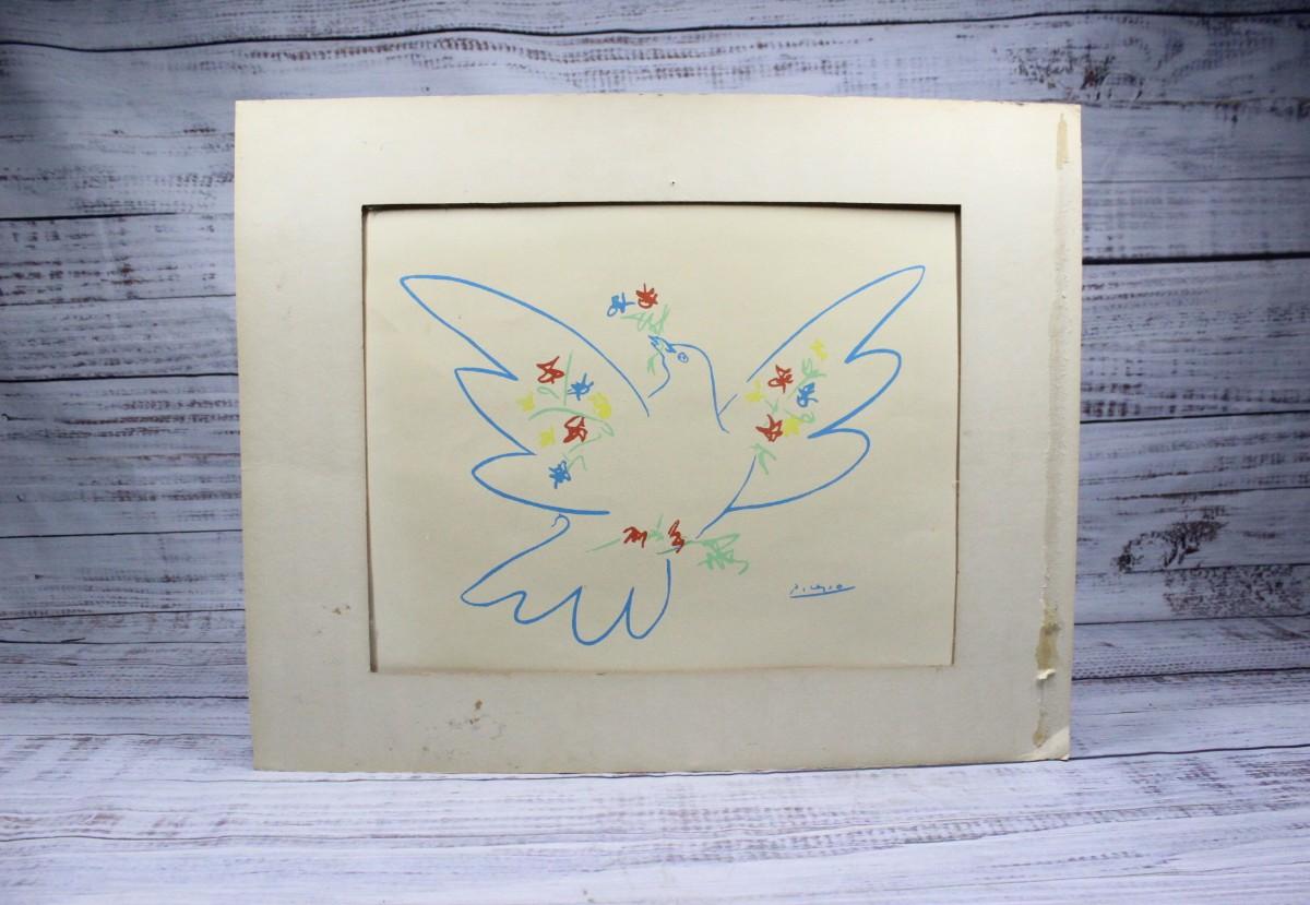 Vintage Pablo Picasso Dove of Peace art print that is mounted on a paper matte frame. There is some wear from the paper stock being exposed to the elements, see pictures for more details.