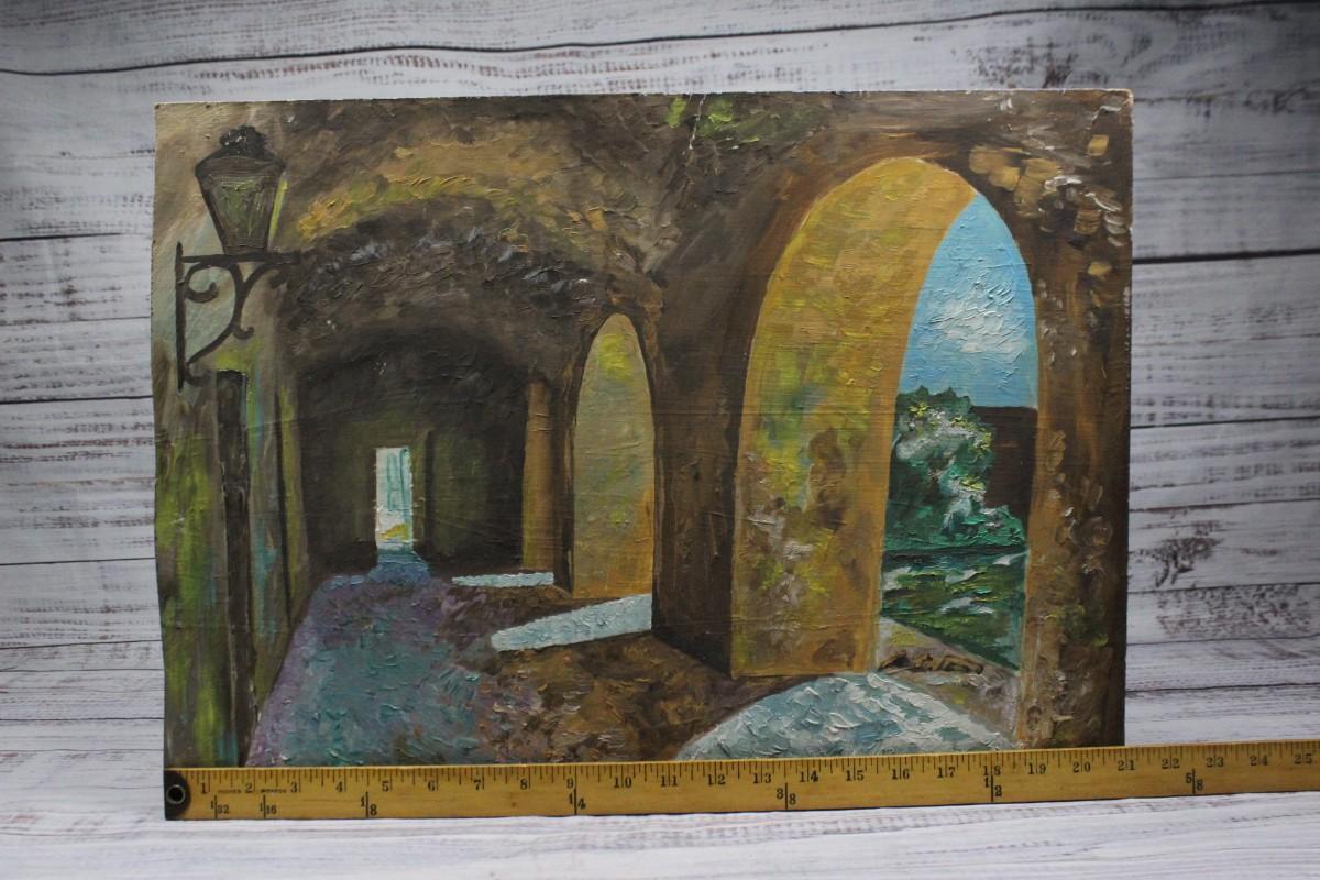 21" x 15" unsigned acrylic painting of archways in a villa, there is some wear to the canvas see pictures for more details.