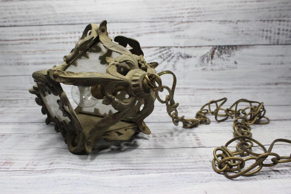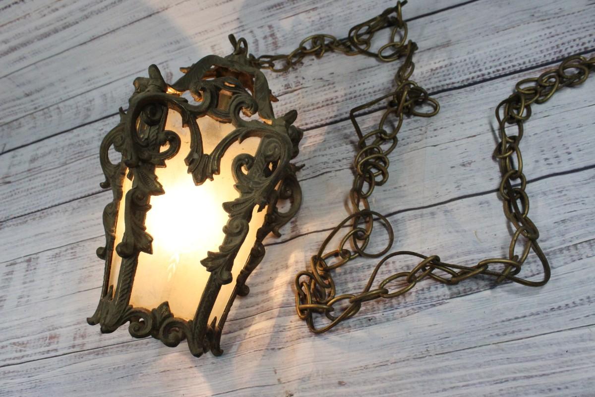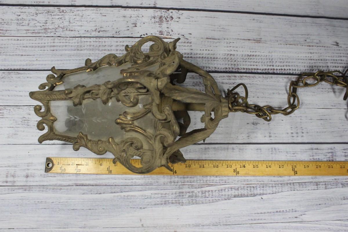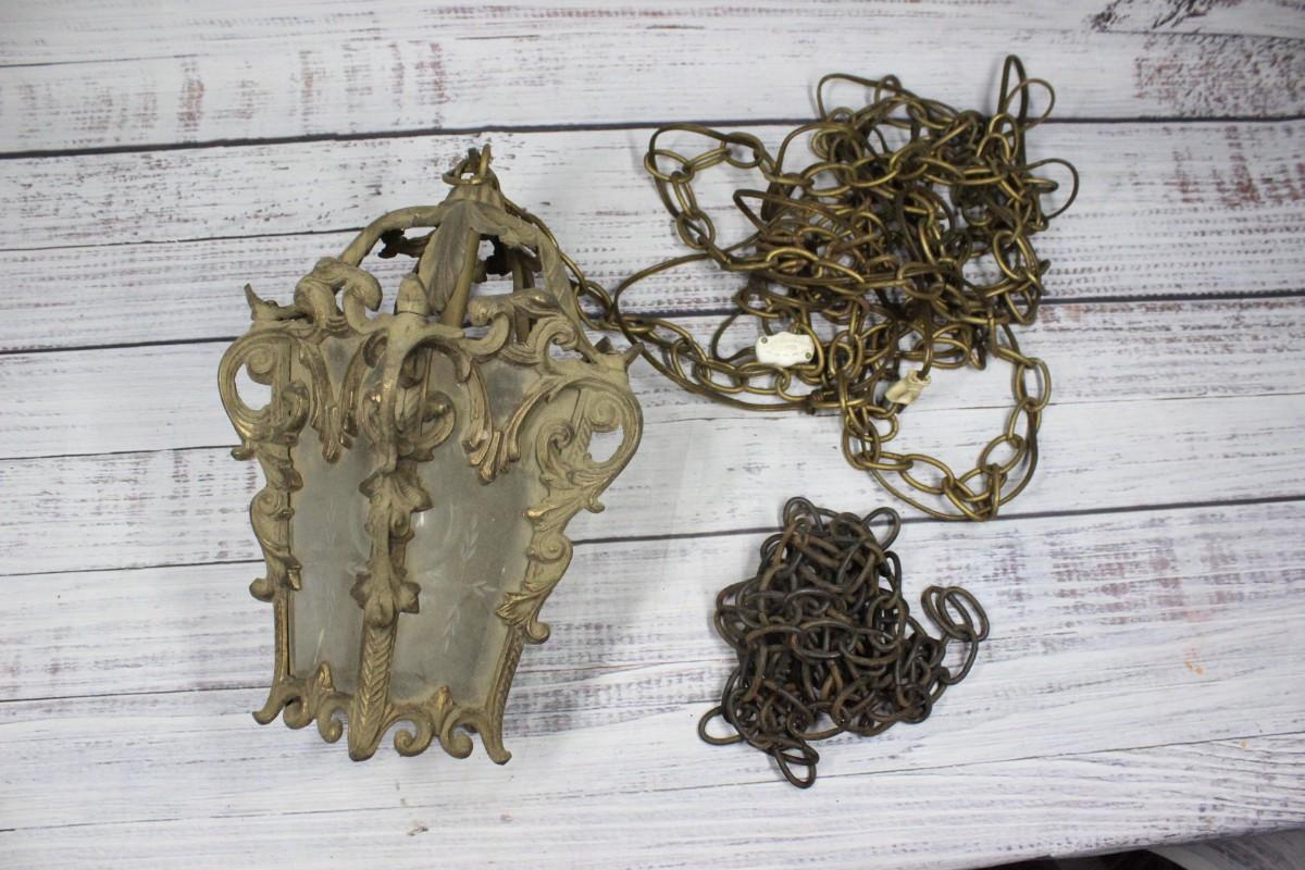 Vintage Gothic styled hanging chain lamp, there are no chips or cracks to the glass panels, but needs to be cleaned. The light bulb and switch works perfectly. Comes with an extra chain.