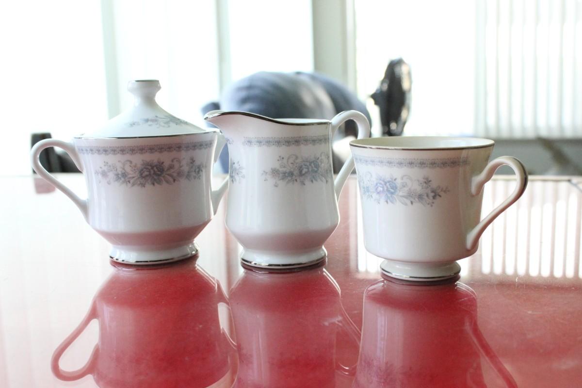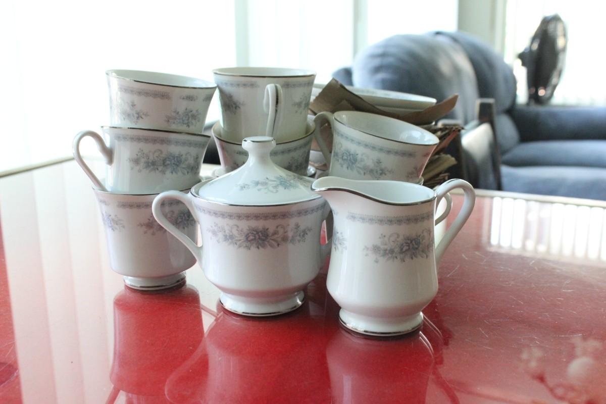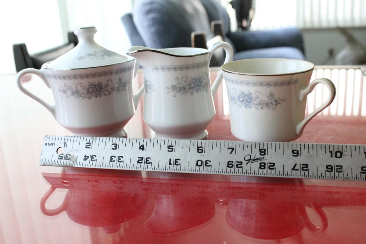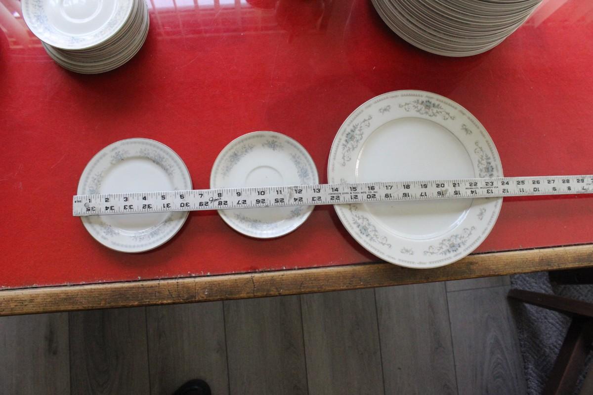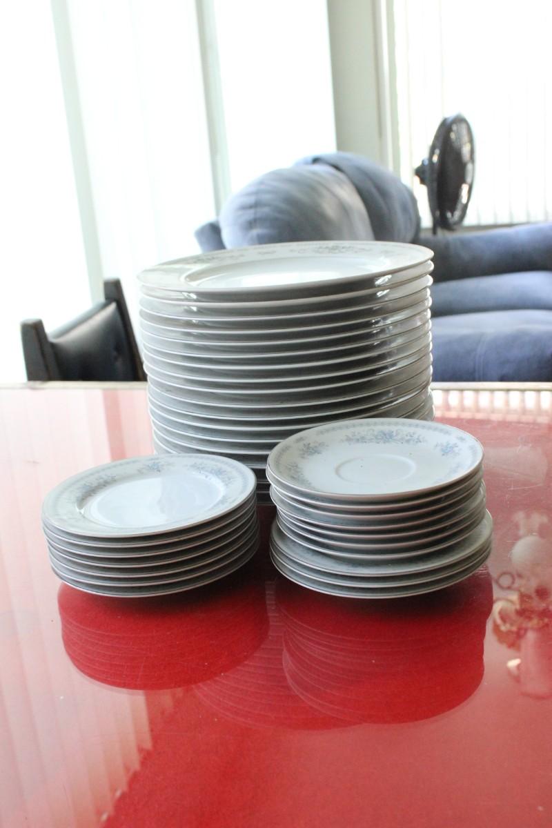 Large set of china with the 'Christine' pattern by Fine China of Japan, there is no significant chips or scratches to any of the pieces. Some small serving bowls have not been used, see pictures for more details.