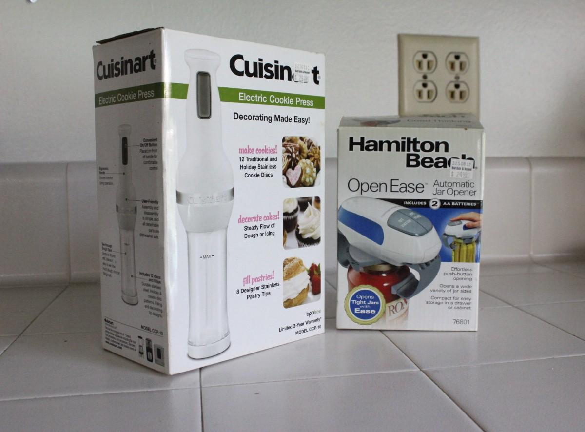 Cuisinart Electric Cookie Press new in the box as well as a Hamilton Beach Electronic Automatic Jar Opener slightly used, both work perfectly.