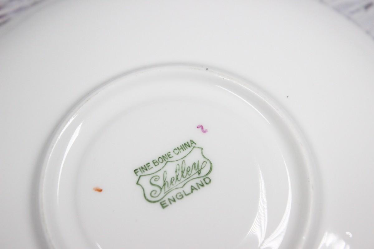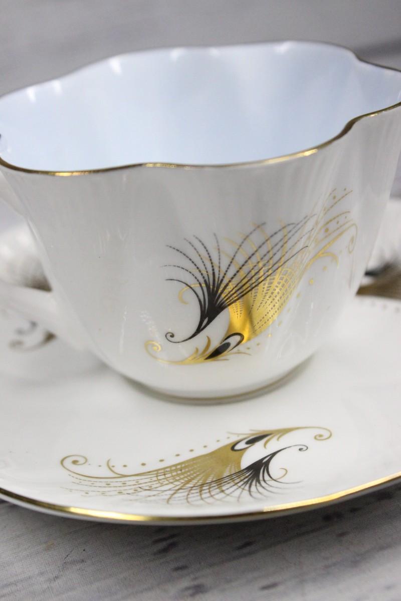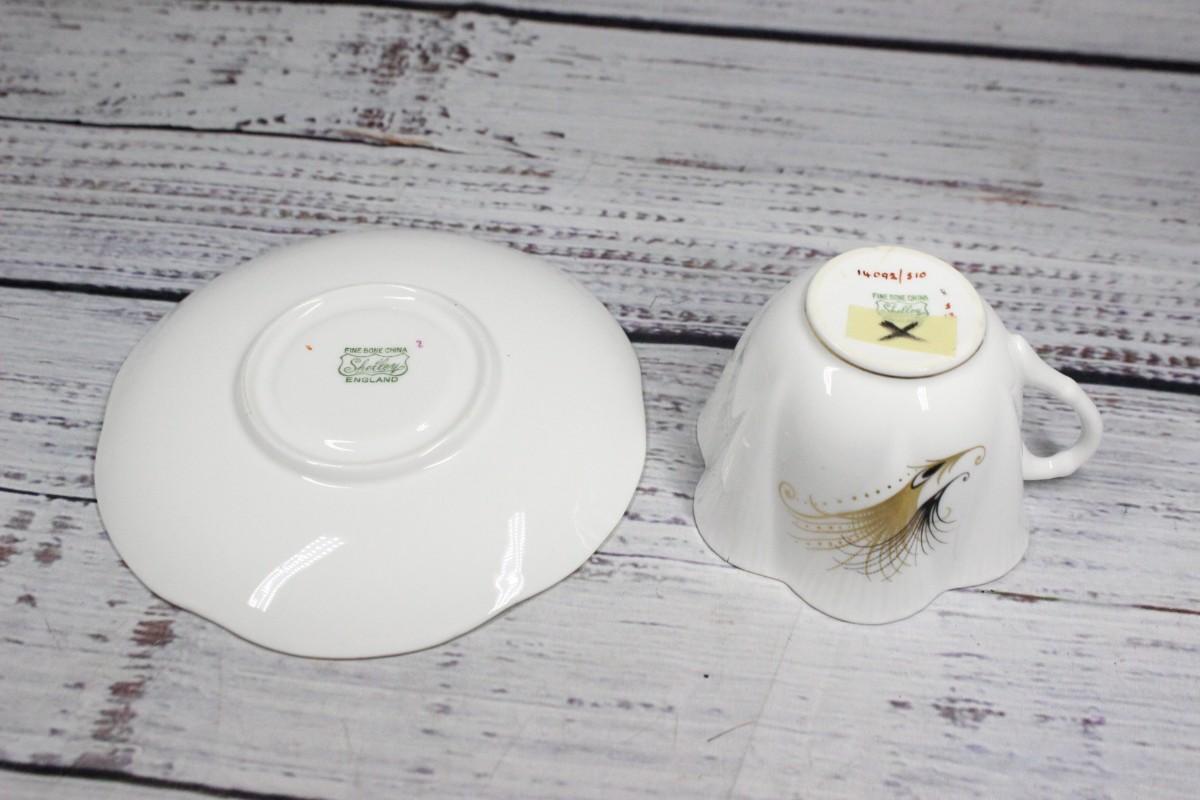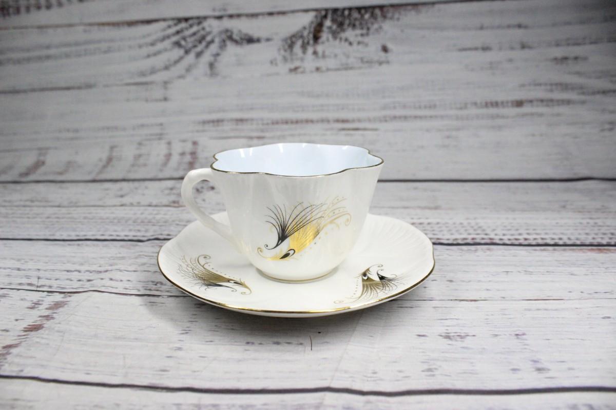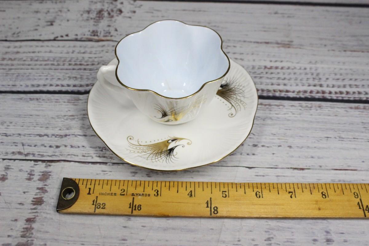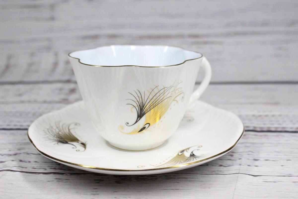Shelley Pastel Gold Feather Motif Teacup & Saucer English Bone China, there is no significant chipping or scratches to the piece and is in good condition. Black and gold feather motif printed on both the cup and saucer.
