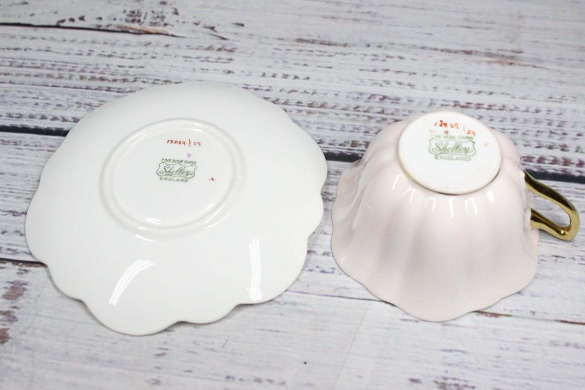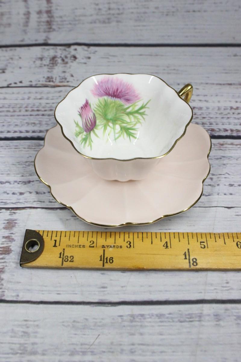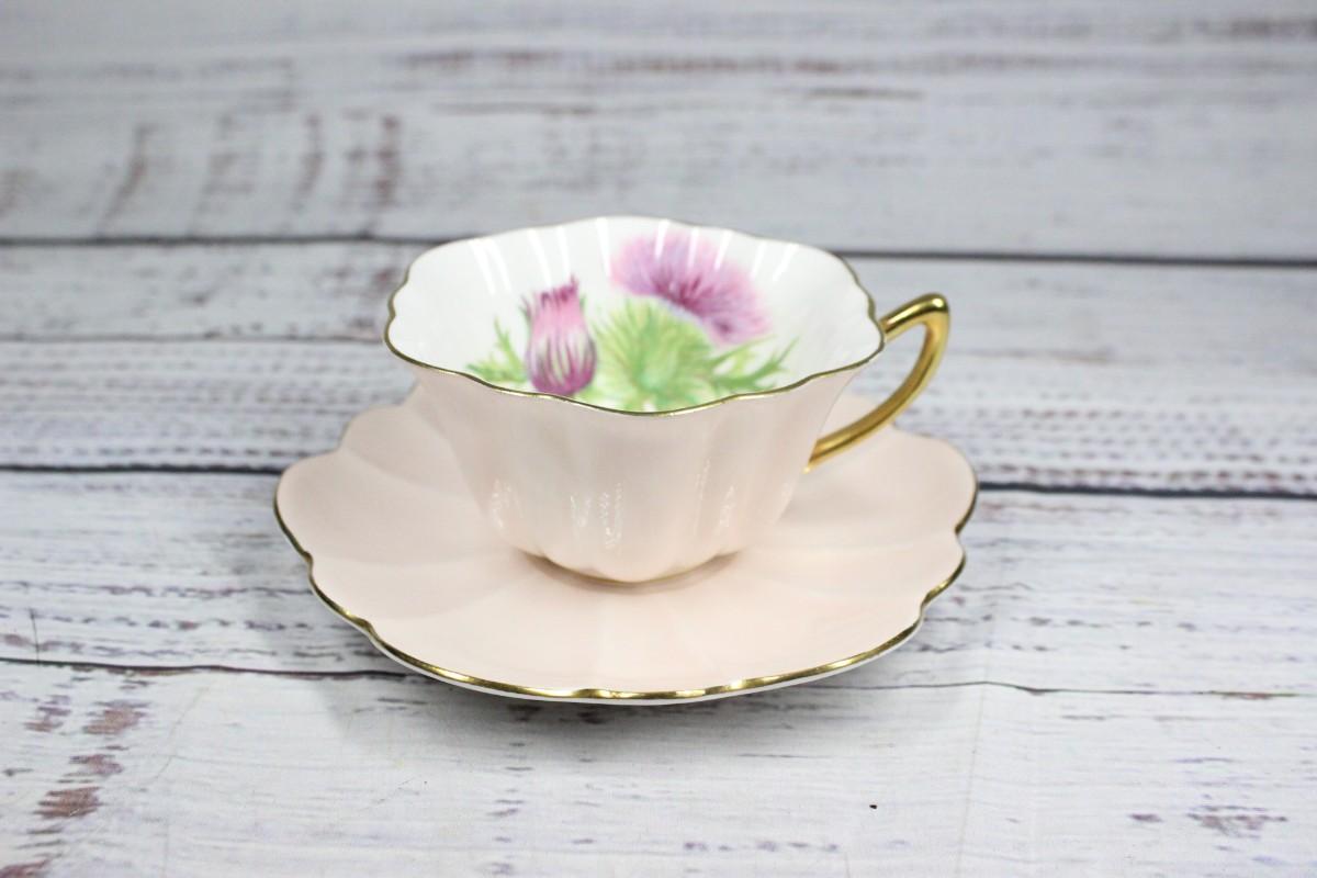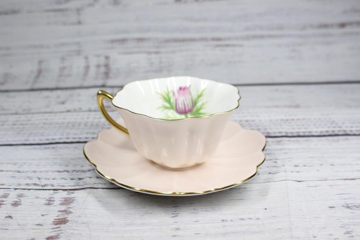 Shelley Pastel Pink with Tulips Teacup & Saucer English Bone China, there is no significant chips or scratches to the piece and is in good condition.