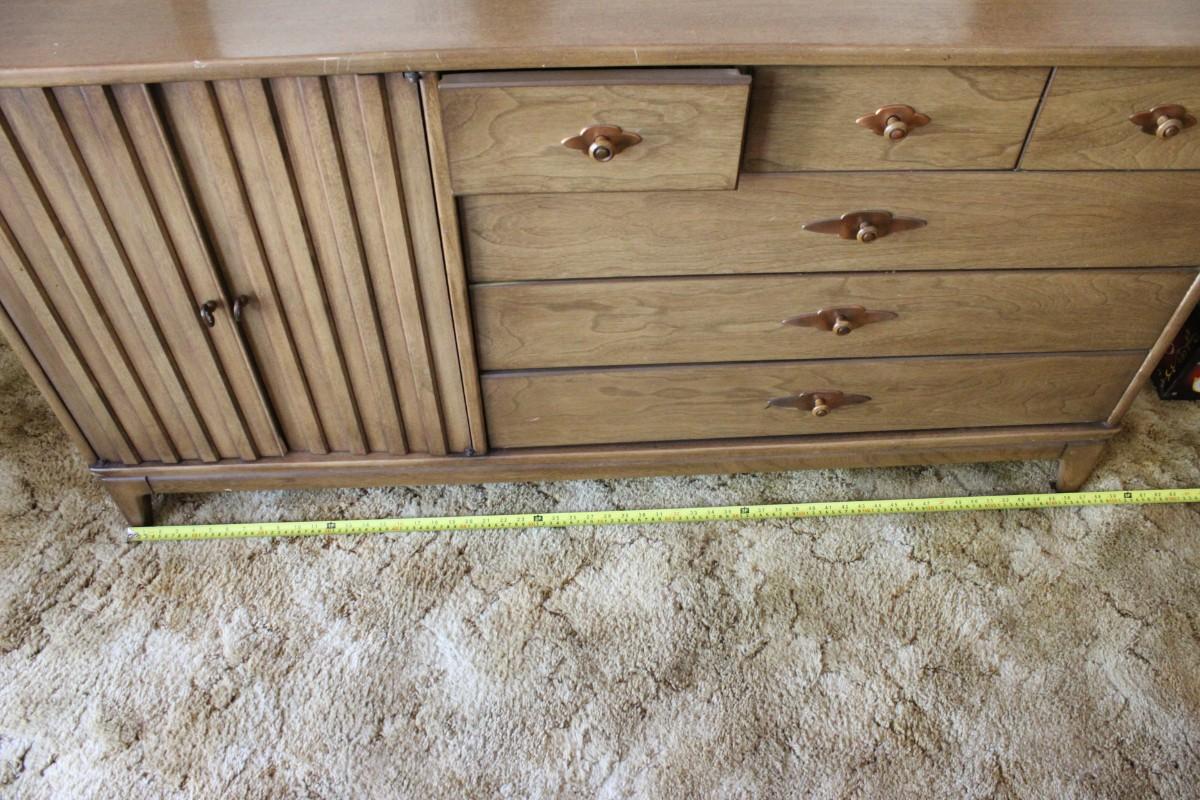 Vintage Broyhill dresser with mirror. 6 drawers and cabinet outside. 4 drawers inside the cabinet. Measures about 58" in length, 20" deep. In good used vintage condition. No major scratches to the surface, may have light wear from normal use and age.